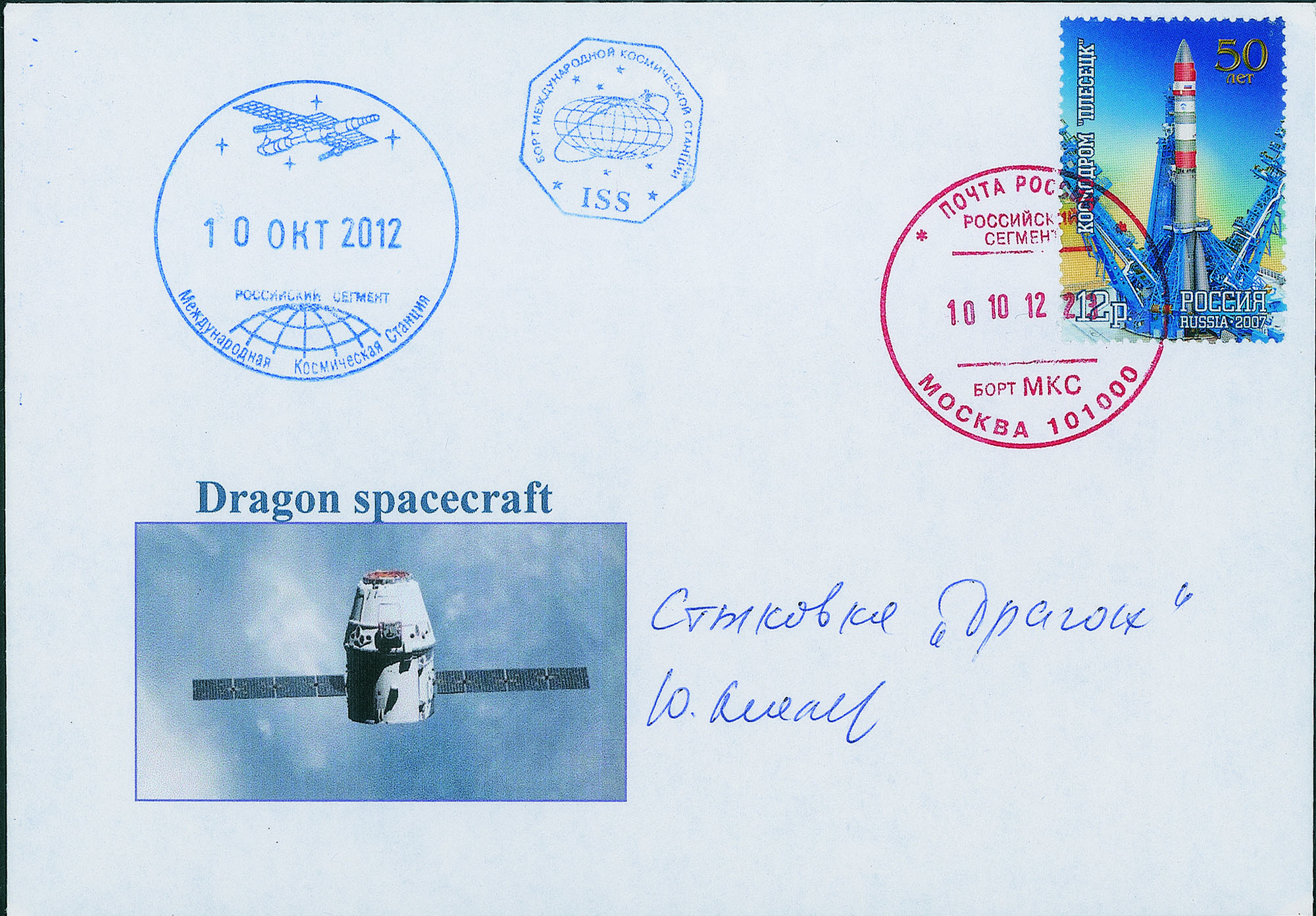 Collezione Spazio - Stazione Spaziale Internazionale - Missioni congiunte - 2012 - Dragon CRS-1 - primo volo commerciale SpaceX DragonCosmogramma timbrato con gli annulli di bordo della Stazione Spaziale Internazionale datati 10.10.2012, giorno in cui la navicella americana di rifornimento senza equipaggio Dragon CRS-1 agganciò la ISS - trattasi del primo volo commerciale sulla ISS di una navicella di rifornimento senza equipaggio Dragon - firma autografa del cosmonauta russo Y.Malenchenko, a bordo della ISS il giorno dell'aggancio della navicella Dragon CRS-1 - rara e di ottima qualità