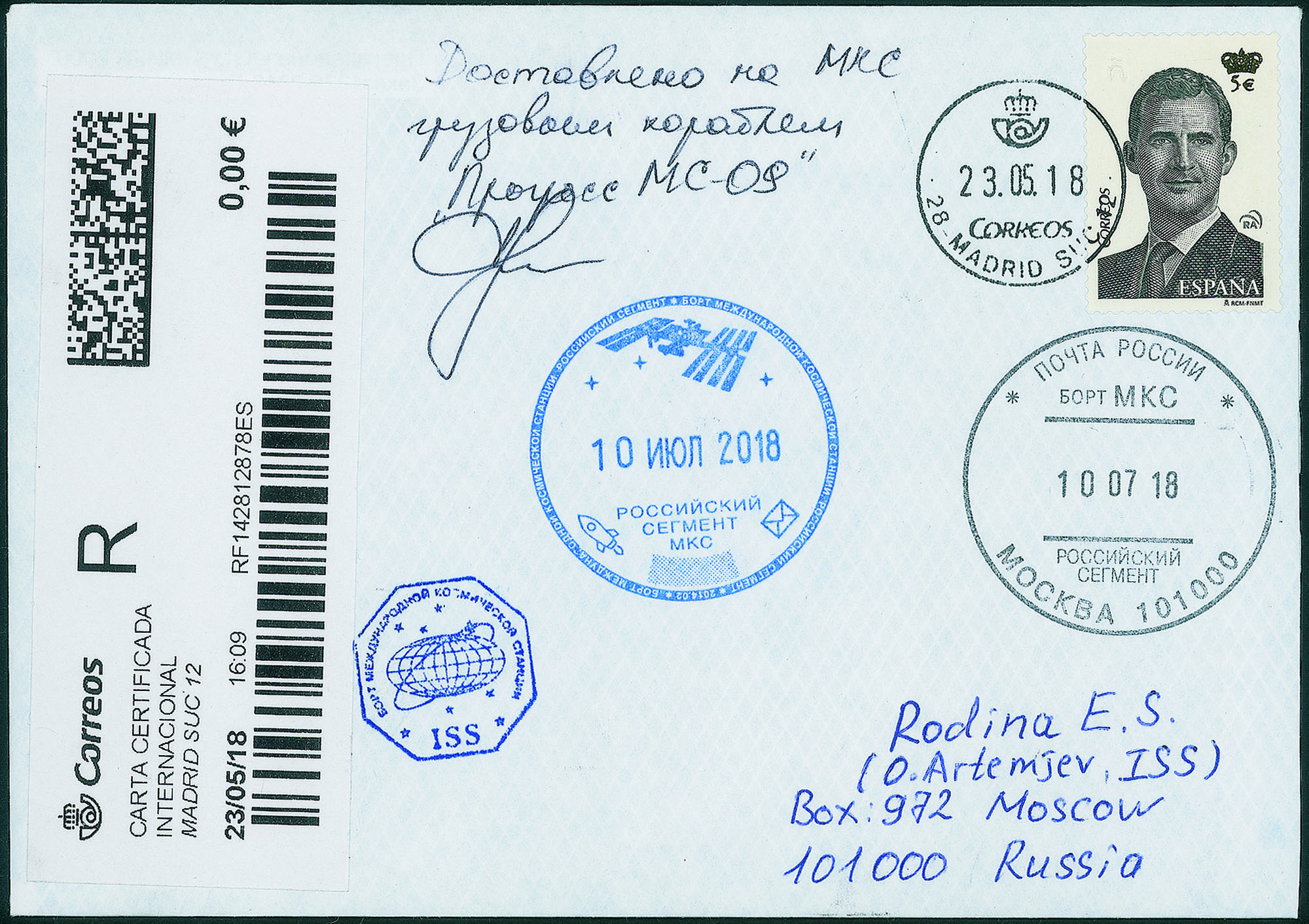 Collezione Spazio - Stazione Spaziale Internazionale - Missioni congiunte - 2018 - Progress MS-09 - Terra/SpazioCosmogramma spedito dalla Terra alla Stazione Spaziale Internazionale a bordo della navicella di rifornimento senza equipaggio Progress MS-09 - prima la lettera fu spedita da Madrid (Spagna) per raccomandata in Russia - lettera timbrata con gli annulli di bordo - è considerato il viaggio per la ISS più veloce mai compiuto - il cosmonauta O.Artemyev ha scritto una nota sulla busta: 'È consegnata alla ISS dalla navicella Progress MS-09' - molto bella e di ottima qualità - foto di autenticità dallo spazio - cert. Rodin