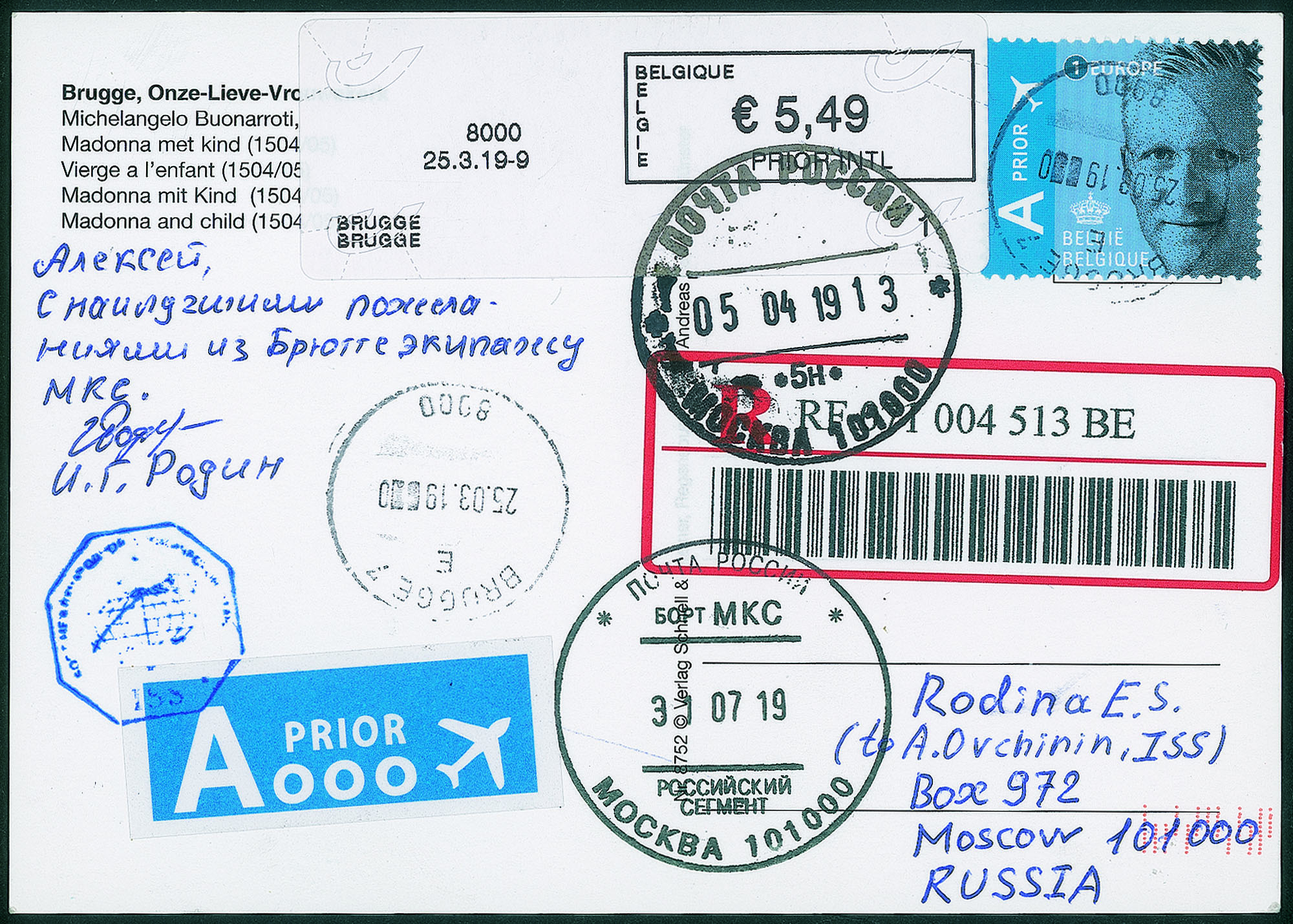 Collezione Spazio - Stazione Spaziale Internazionale - Missioni congiunte - 2019 - Progress MS-12 - Terra/SpazioCartolina spedita dalla Terra alla Stazione Spaziale Internazionale a bordo della navicella di rifornimento senza equipaggio Progress MS-12 - prima la cartolina fu spedita da Bruges (Belgio) per raccomandata in Russia poi a bordo della ISS - la cartolina è timbrata con gli annulli di bordo - ottima qualità - foto di autenticità dallo spazio - cert. Rodin