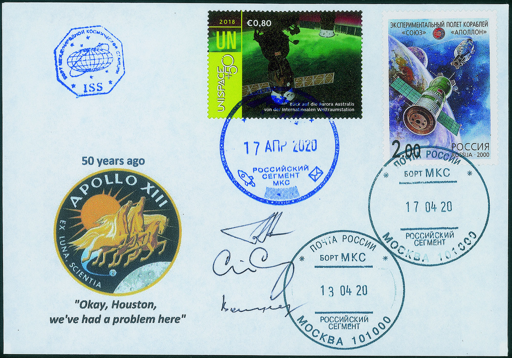 Collezione Spazio - Stazione Spaziale Internazionale - Missioni congiunte - 2020 - Soyuz MS-16 - 50° anniversario della missione Apollo 13Cosmogramma con l'emblema della storica e sfortunata missione del 1970 timbrato con gli annulli di bordo - firme autografe dell'equipaggio della Soyuz MS-16: C.Cassidy (USA); A.lvanishin e I.Vagner (Russia) - ottima qualità e testimonianza postale dello spazio della tragedia sfiorata