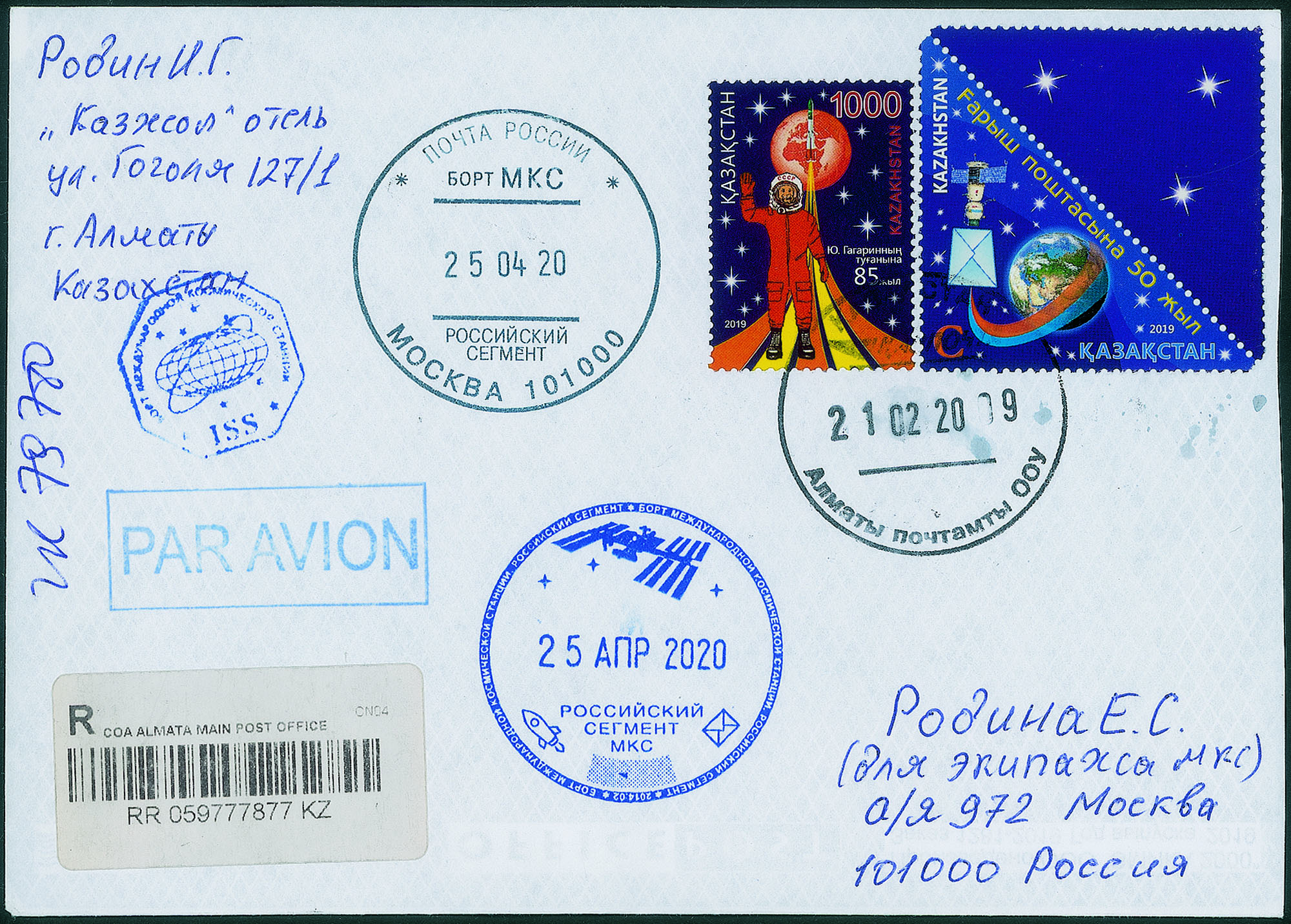 Collezione Spazio - Stazione Spaziale Internazionale - Missioni congiunte - 2020 - Progress MS-14 - Spedizione 63 - Terra-SpazioCosmogramma spedito dalla Terra alla Stazione Spaziale Internazionale a bordo della navicella di rifornimento senza equipaggio Progress MS-14 - prima la lettera fu spedita dal Kazakistan per raccomandata in Russia poi a bordo della ISS - lettera timbrata con gli annulli di bordo - ottima qualità - 2020 - Progress MS-15 - Spedizione 63 - Terra-Spazio - cosmogramma spedito dalla Terra alla Stazione Spaziale Internazionale a bordo della navicella di rifornimento senza equipaggio Progress MS-15 - prima la lettera fu spedita da Korolev (Russian Mission Control Center) a Zvyozdny Gorodok (Star town, Russian Cosmonaut Training Center) il 20.5.2020 poi a bordo della ISS - lettera timbrata con gli annulli di bordo - molto bella e di ottima qualità - foto di autenticità dallo spazio - cert. Rodin