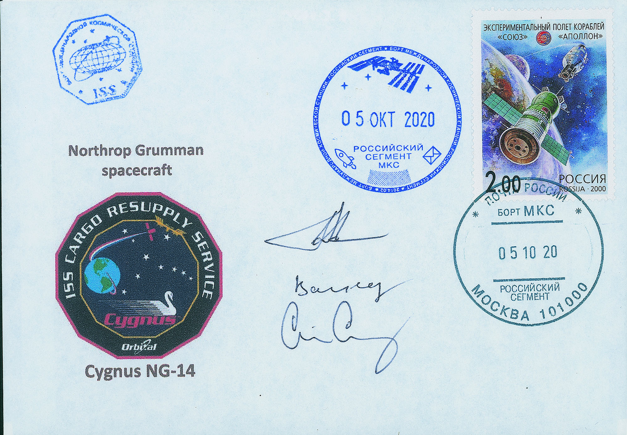 Collezione Spazio - Stazione Spaziale Internazionale - Missioni congiunte - 2020 - Cygnus NG-14Cosmogramma timbrato con gli annulli di bordo datati 05.10.2020, giorno dell'aggancio della navicella di rifornimento senza equipaggio americana Cygnus NG-14 alla ISS - firme autografe dei 3 astronauti (Soyuz MS-16) a bordo della ISS il 05.10.2020: C.Cassidy (USA); A.lvanishin e I.Vagner (Russia) - ottima qualità