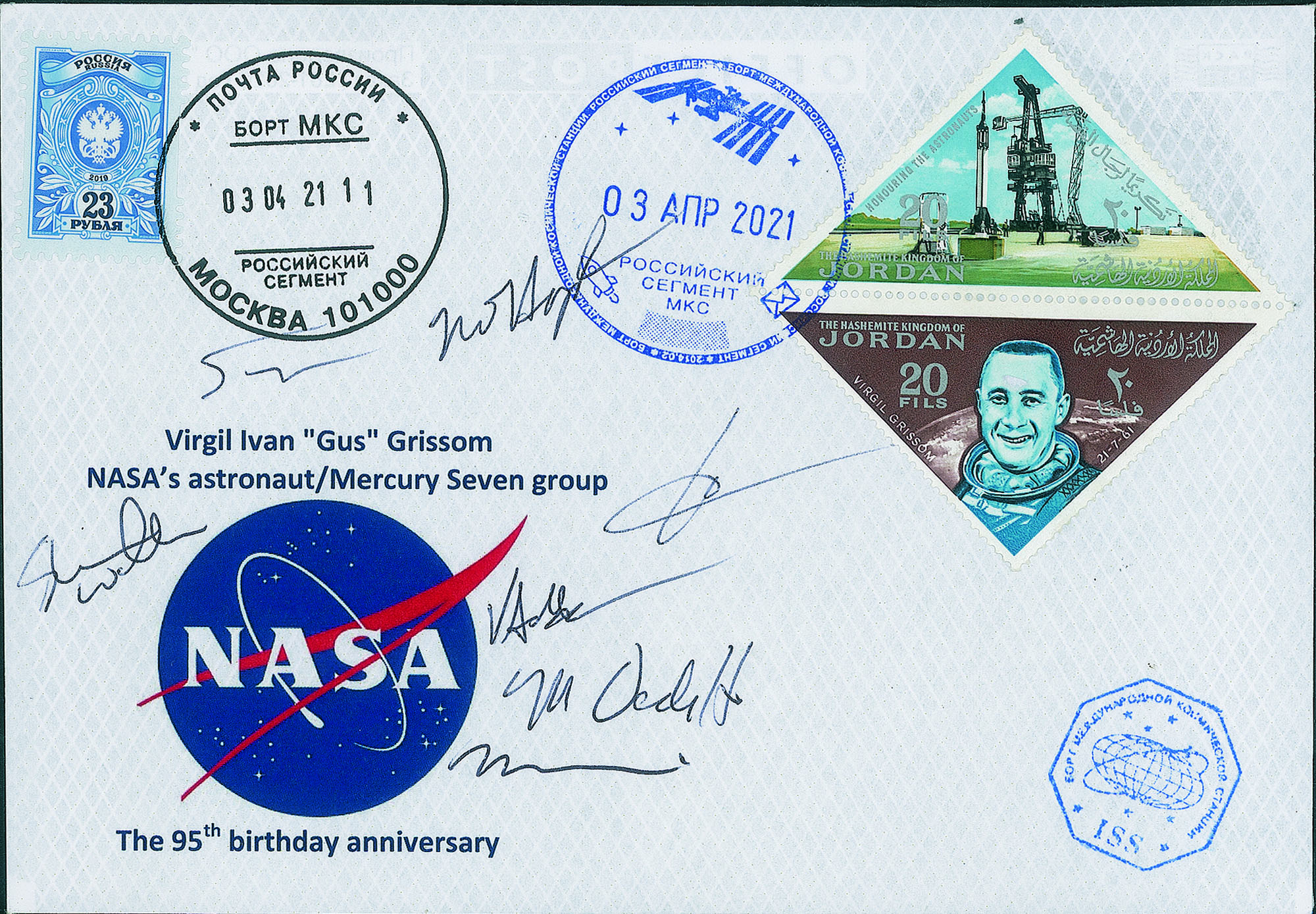 Collezione Spazio - Stazione Spaziale Internazionale - Missioni congiunte - 2021 - Spedizione 64Cosmogramma del 95° anniversario dell'astronauta Grissom annullato sulla Stazione Spaziale Internazionale il 3.4.21 - firme autografe di 7 astronauti M. Hopkins V. Golver S. Walker S. Noguchi S. Ryzhikov S. Kud-Sverchkov e K. Rubins - ottima qualità
