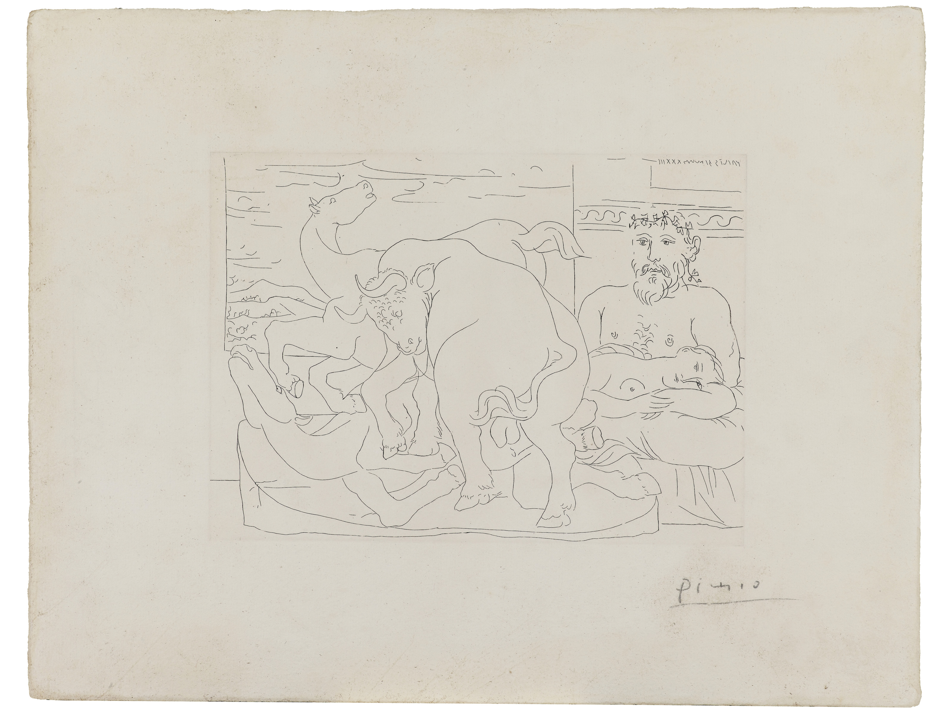 Pablo Picasso (Málaga 1881-Mougins1973) Le repos du sculpteur devant des chevaux et un taureau Acquaforte Stampa 19,5X26,5 cm Foglio 34,5X44 cm Suite Vollard