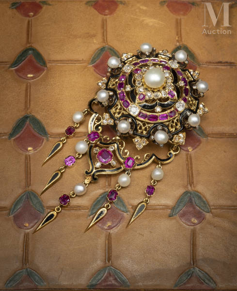 Broche-pendentif à transformation en or jaune 18k (750 millièmes) formant une rosace à décor ajouré retenant des festons agrémentés de pampilles, l'ensemble serti de perles*, rubis et diamants taille ancienne et souligné de filets d'émail noir.