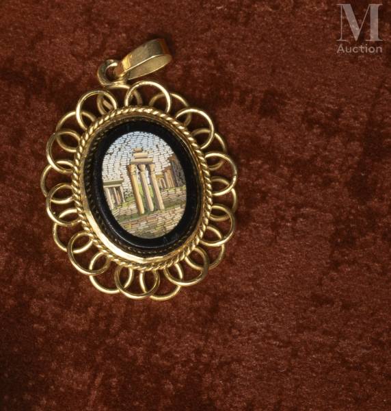Pendentif ovale en or jaune 18k (750 millièmes) sertie d'un médaillon en micro-mosaïques figurant des ruines antiques.