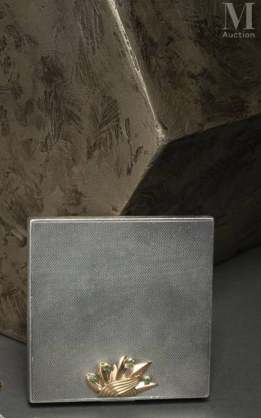 Poudrier carré en argent (800 millièmes) à décor guilloché, agrémenté d'un motif de feuillage en or jaune 18k (750 millièmes) serti de petites émeraudes, miroir interne. Vers 1950.