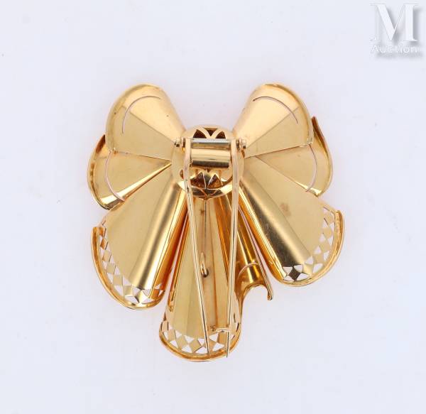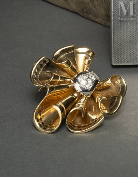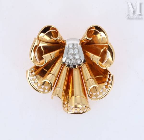 Clip de revers en or jaune 18k (750 millièmes) et platine (950 millièmes) figurant un nœud drapé, noué au centre par un motif de godron serti de diamants ronds taille brillant.