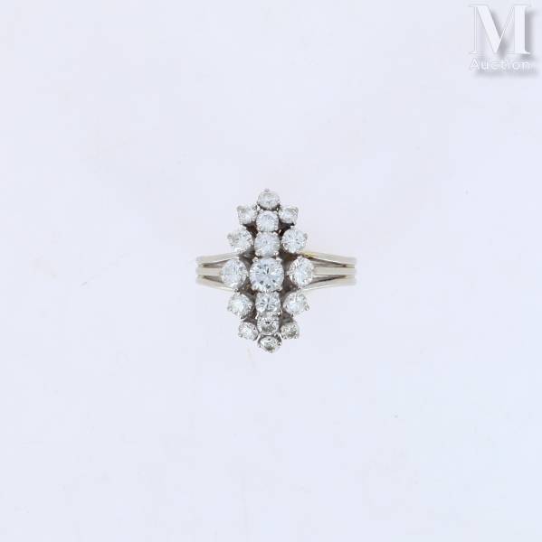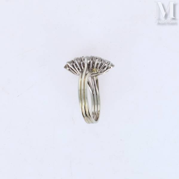 Bague en or gris 18k (750 millièmes), la table sertie de diamants ronds taille brillant sur une monture en panier de forme navette légèrement bombée.