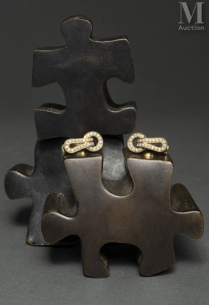 Paire de boucles d'oreilles en or jaune 18k (750 millièmes) modèle "Agrafe", chacune sertie de petits diamants ronds taille brillant.
