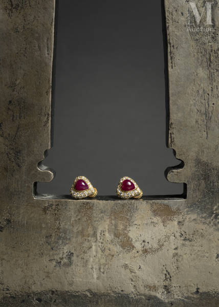 Paire de clous d'oreilles en or jaune 18k (750 millièmes) figurant des cœurs sertis d'un cabochon de rubis dans un entourage de diamants ronds taille brillant.