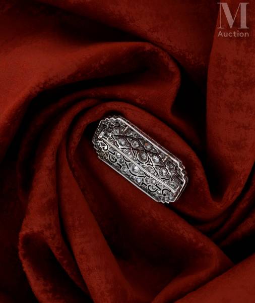 Broche plaque Art Déco en platine (850 millièmes) à décor ajouré géométrique serti de diamants ronds tailles ancienne et 8x8, le centre retenant en serti-clos un diamant plus important d'environ 0,27 carat.
