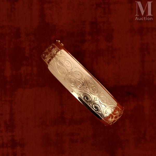 Large bracelet ruban en or jaune 18k (750 millièmes) formé de motifs de chevrons en or mat et poli. Travail français.