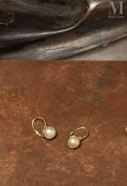 -Paire de dormeuses en or jaune 18k (750 millièmes), serties d'une perles* (fines?) Poids brut : 1,4 g