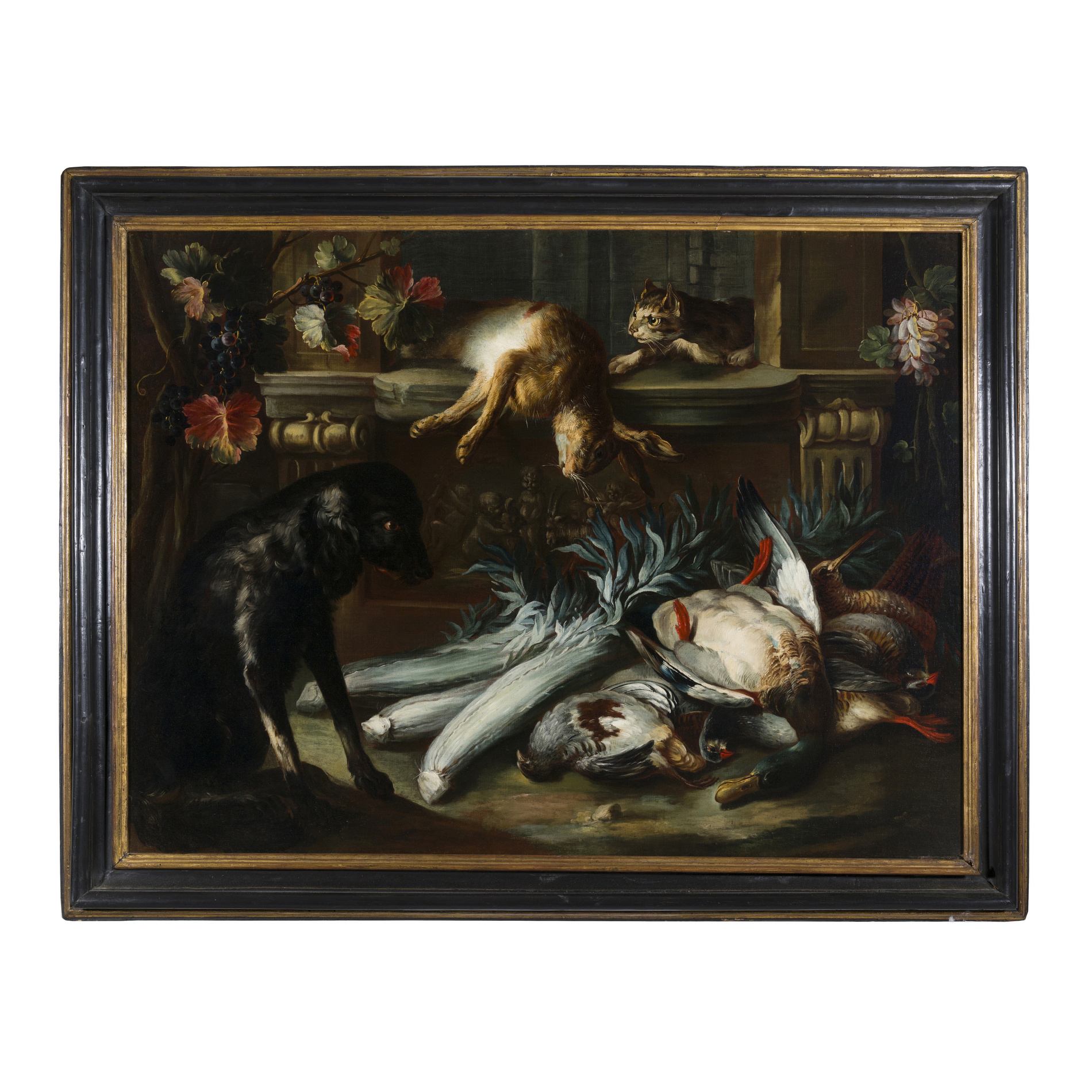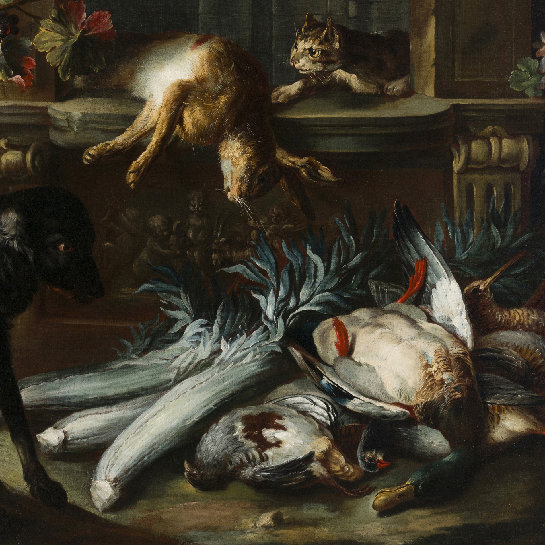 Still Life with Game, Thistle, a Dog and a Cat on a Balcony