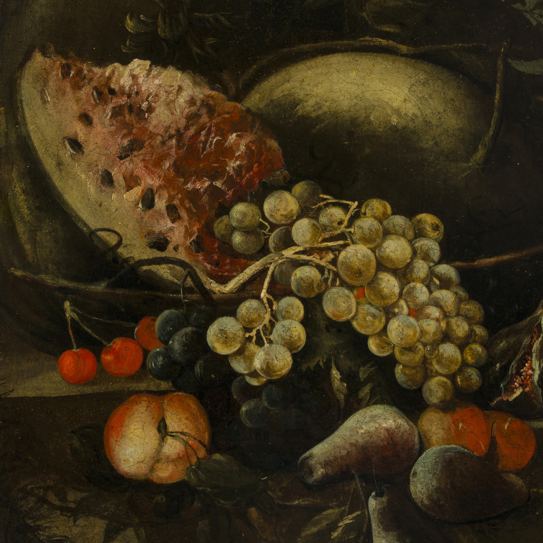Period frame in carved wood, lacquered and gilded with gold leaf on the ribbons, interspersed with the decoration of fruit and flowers.