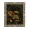 Cornice d'epoca di legno scolpito, laccata e dorata in foglia oro nei nastrini che si intermezzano alla decorazione di frutta e fiori.