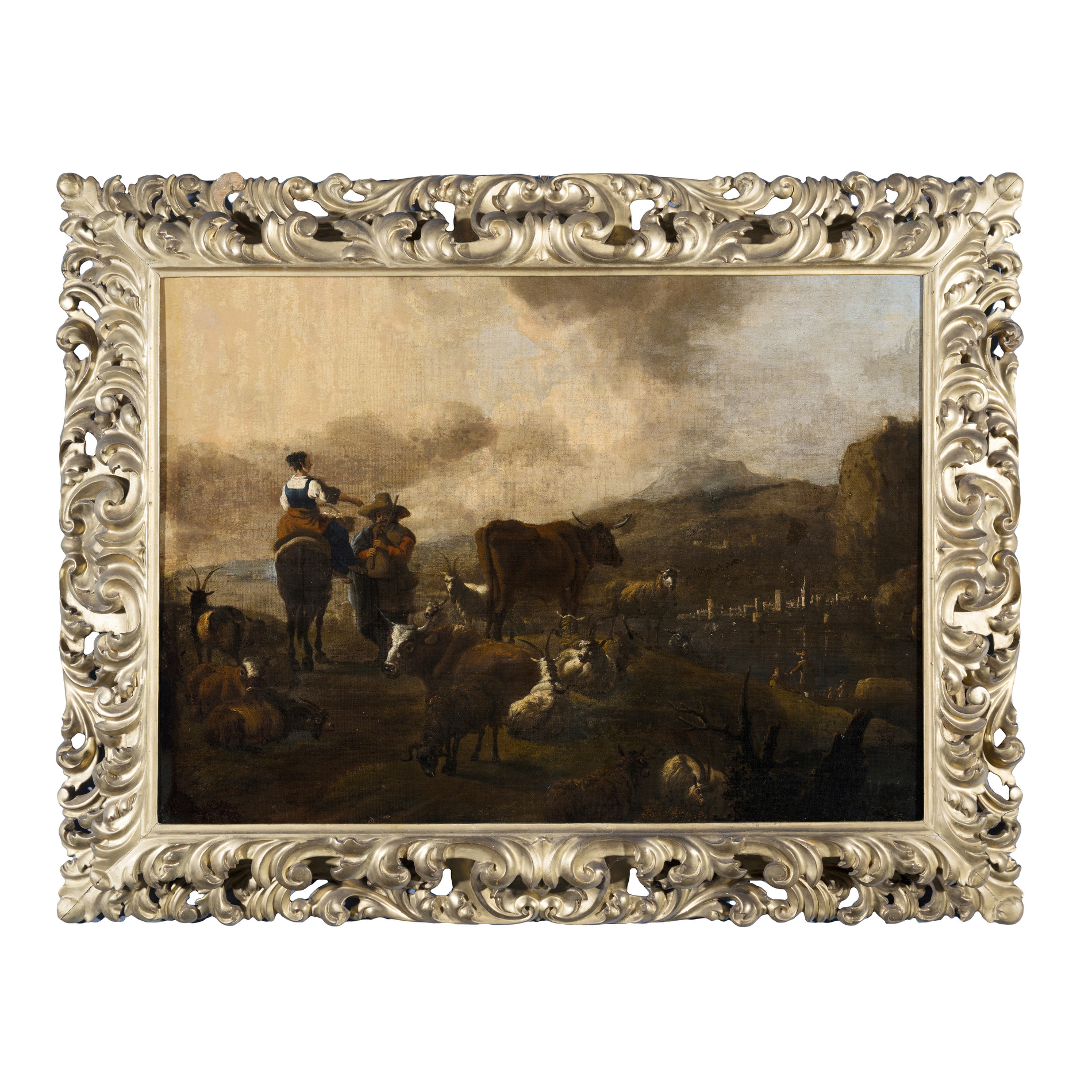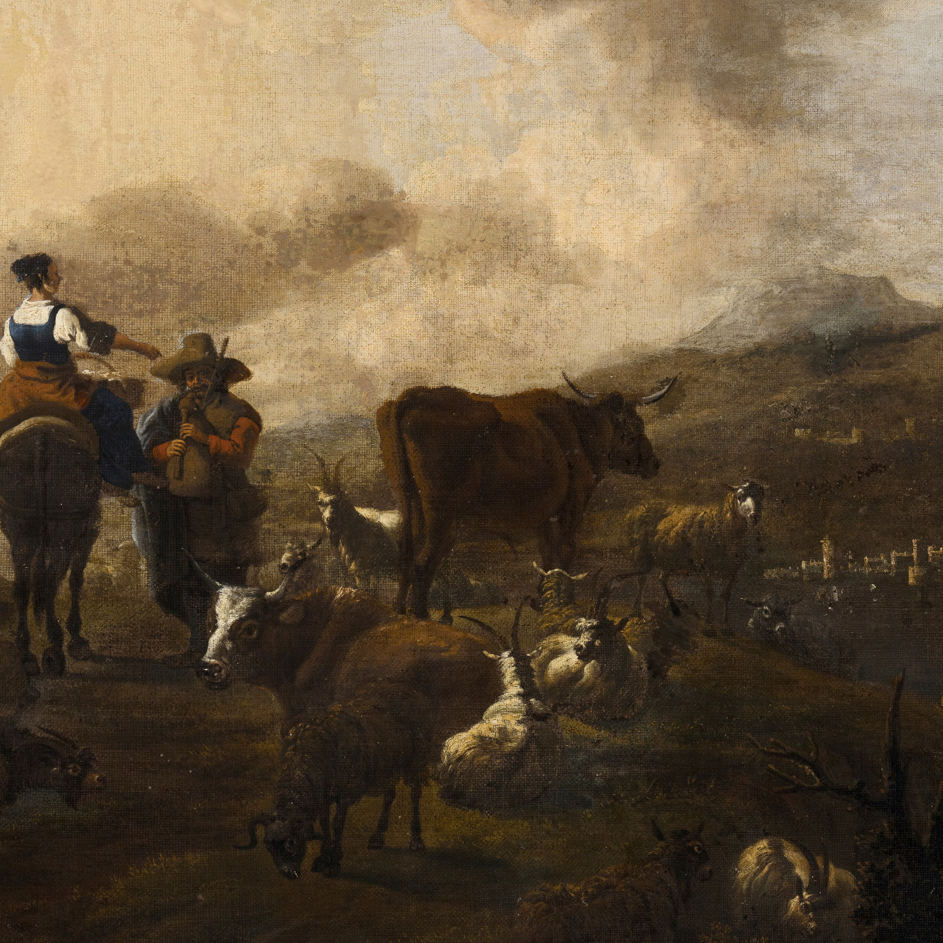 The attribution is based on the presence of the cow turning to look at the hypothetical viewer. This small detail was used repeatedly by Dujardin in his works and can be considered one of his identifying hallmarks. The city depicted in the background shows many features that suggest it may be Verona; it is not excluded that Karel painted it during his Venetian stay in the final years of his life.