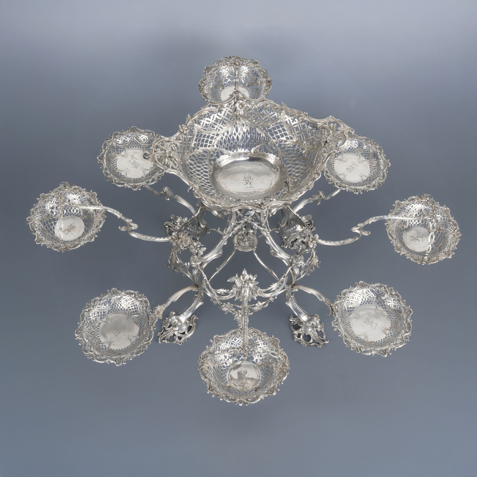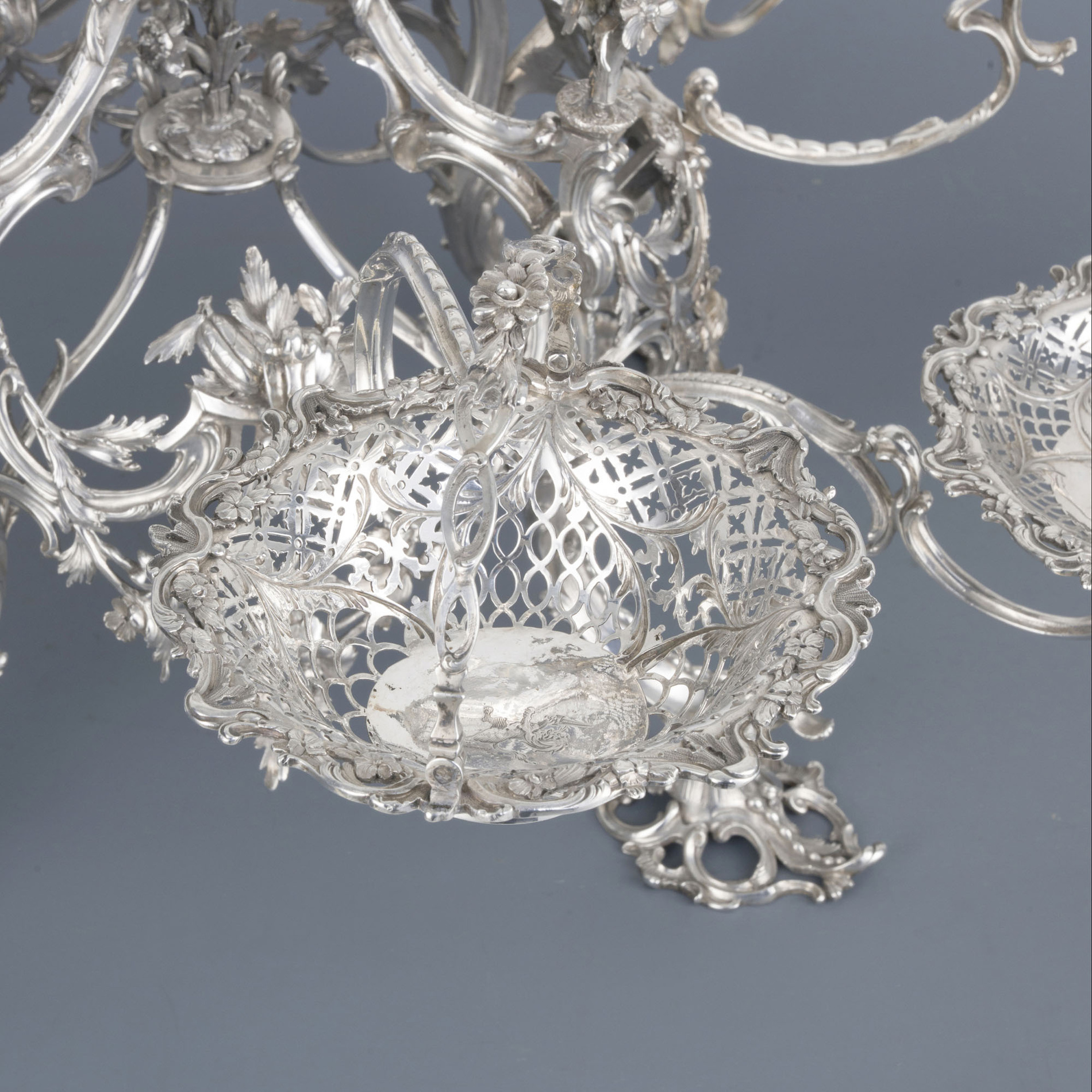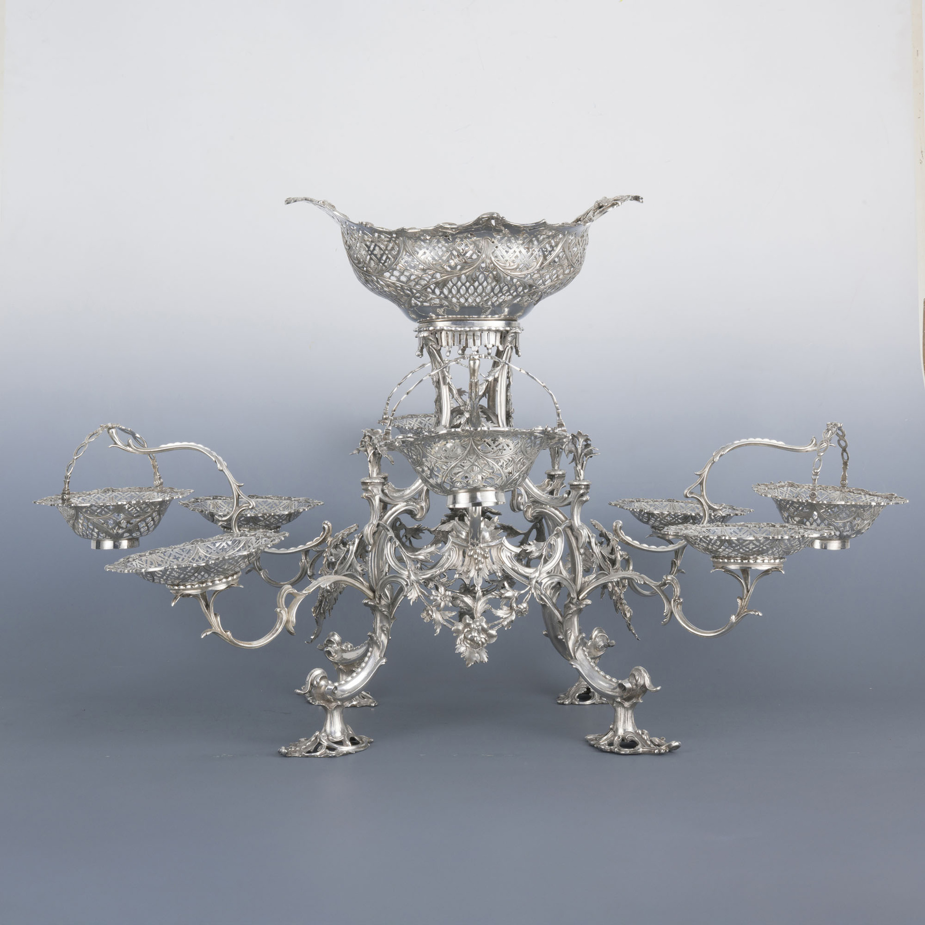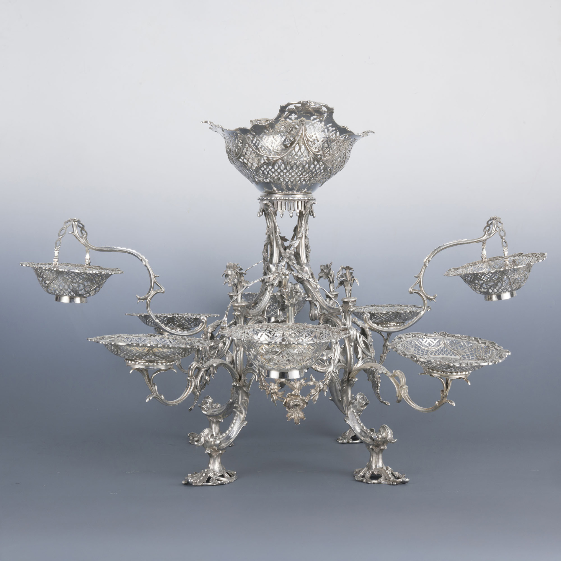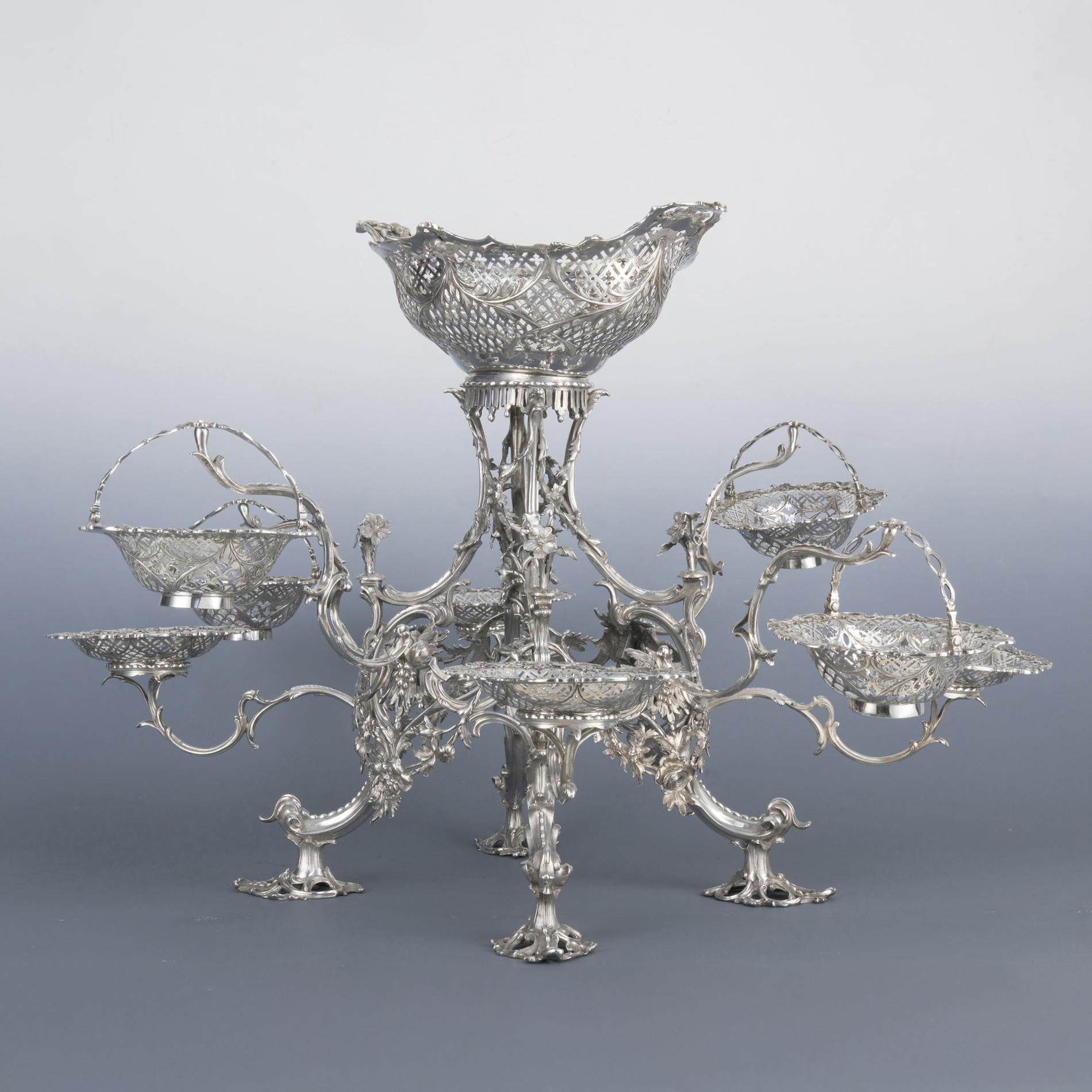 An épergne or silver centrepiece comprising eight arms supporting four shallow resting baskets and four handled baskets