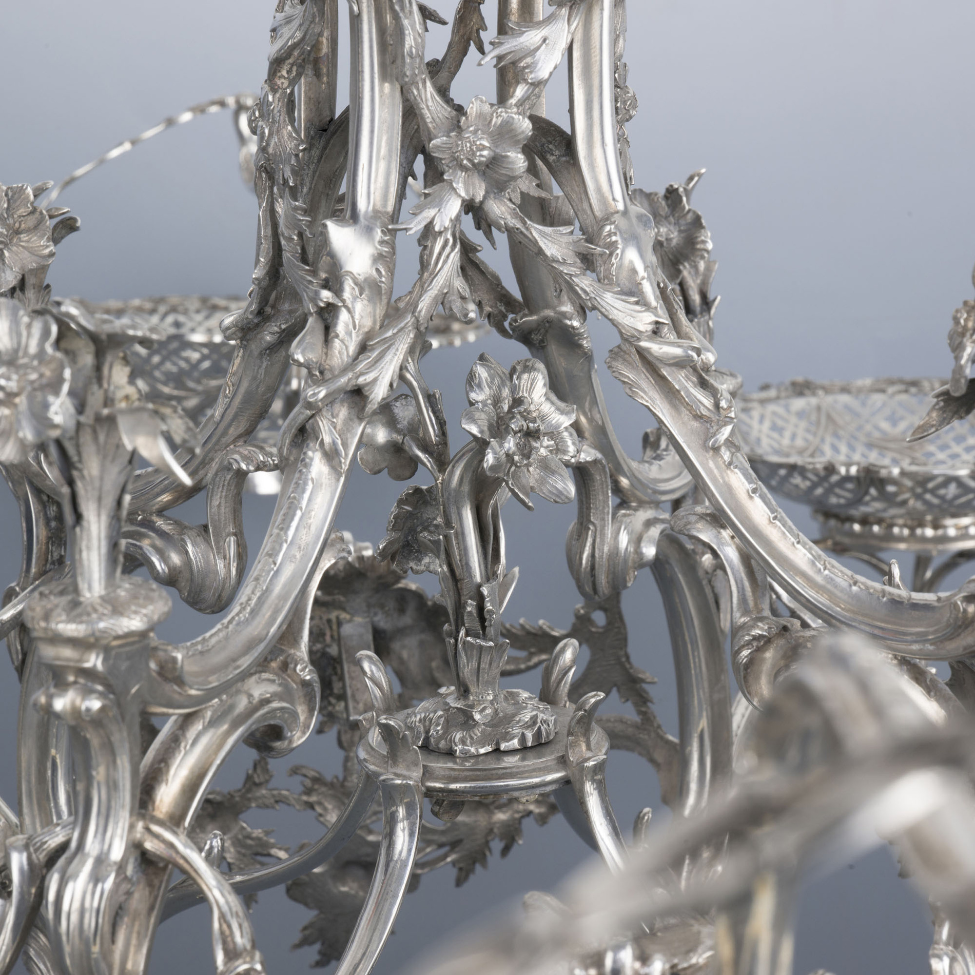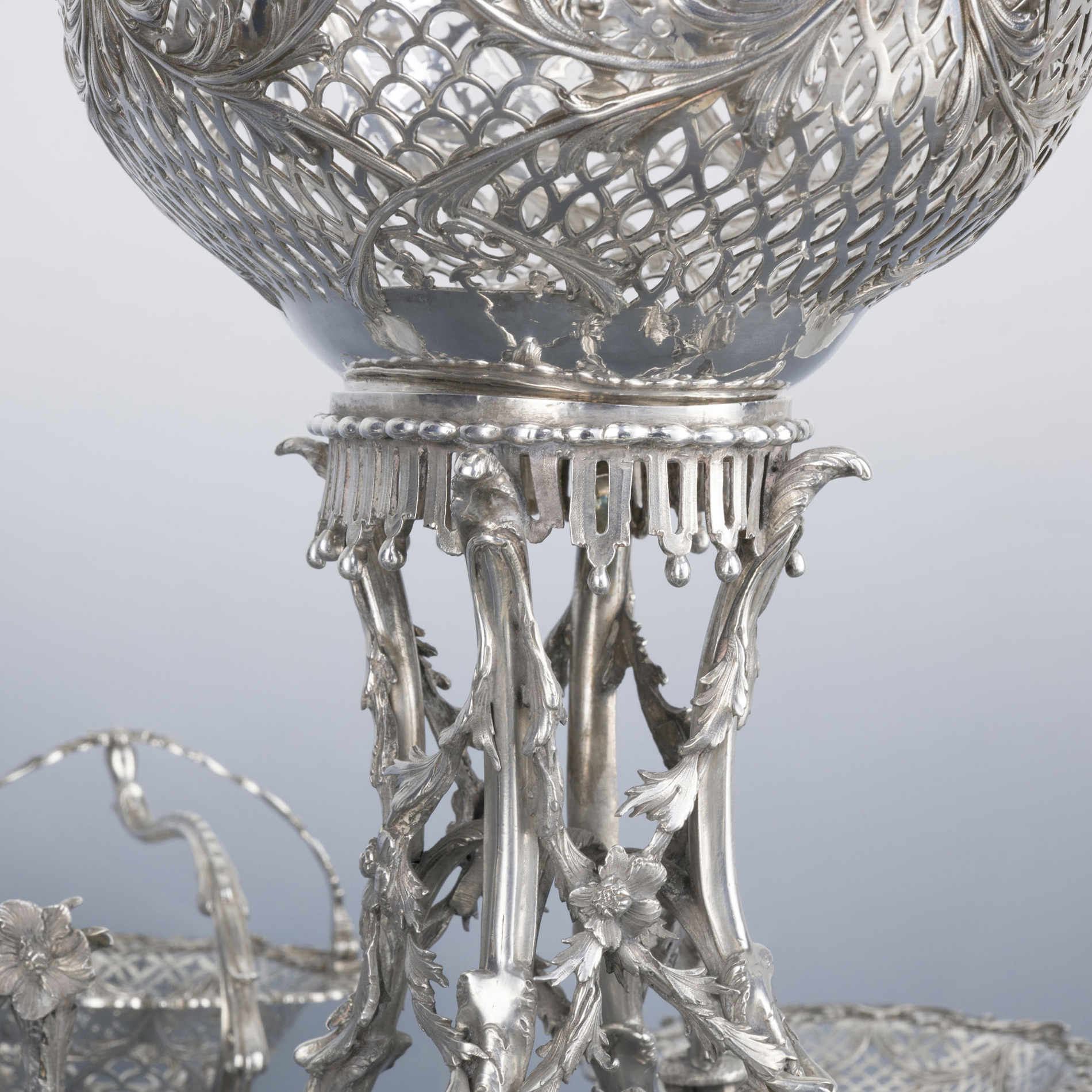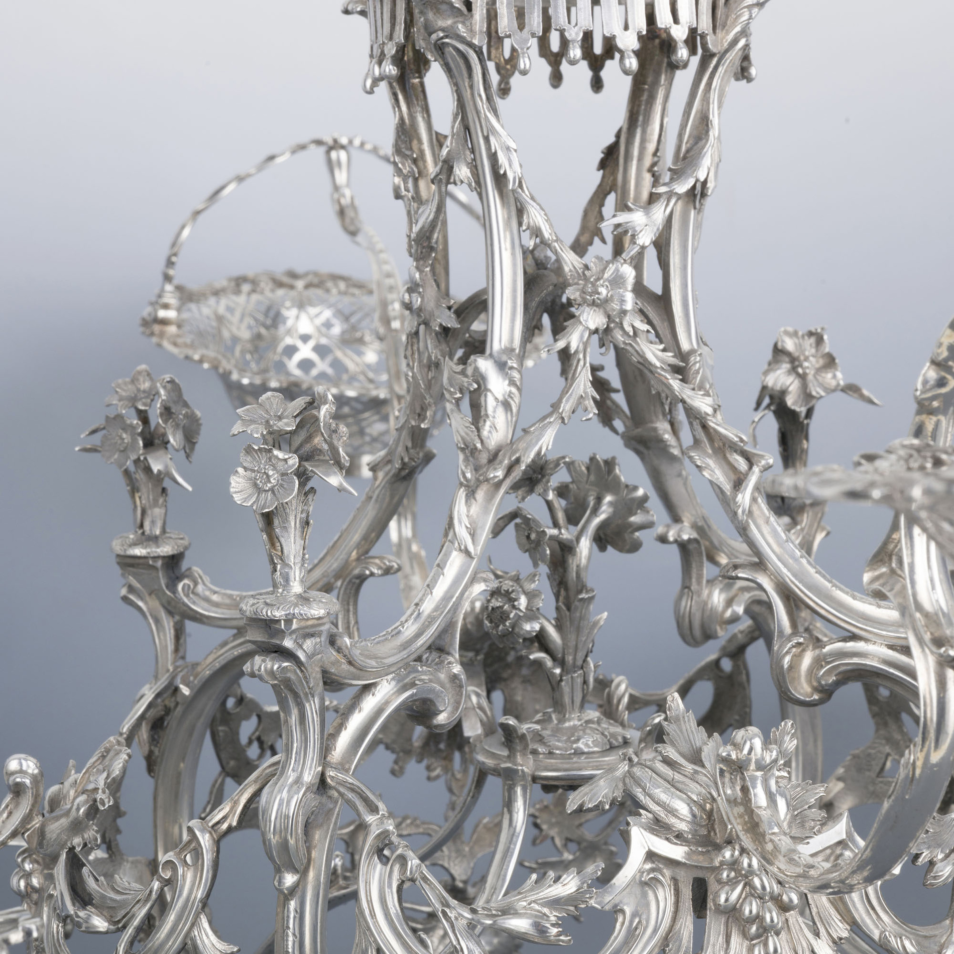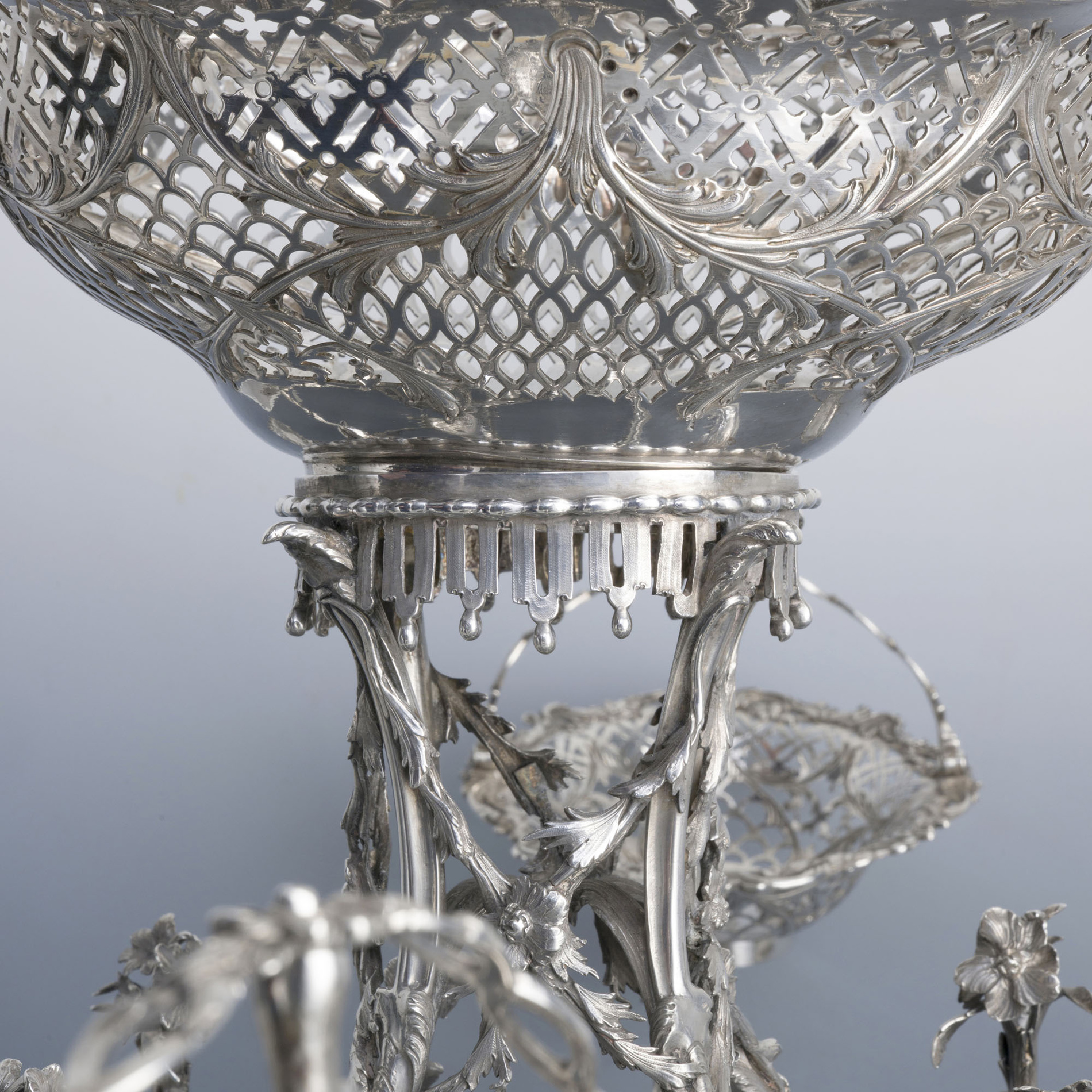 An épergne or silver centrepiece comprising eight arms supporting four shallow resting baskets and four handled baskets