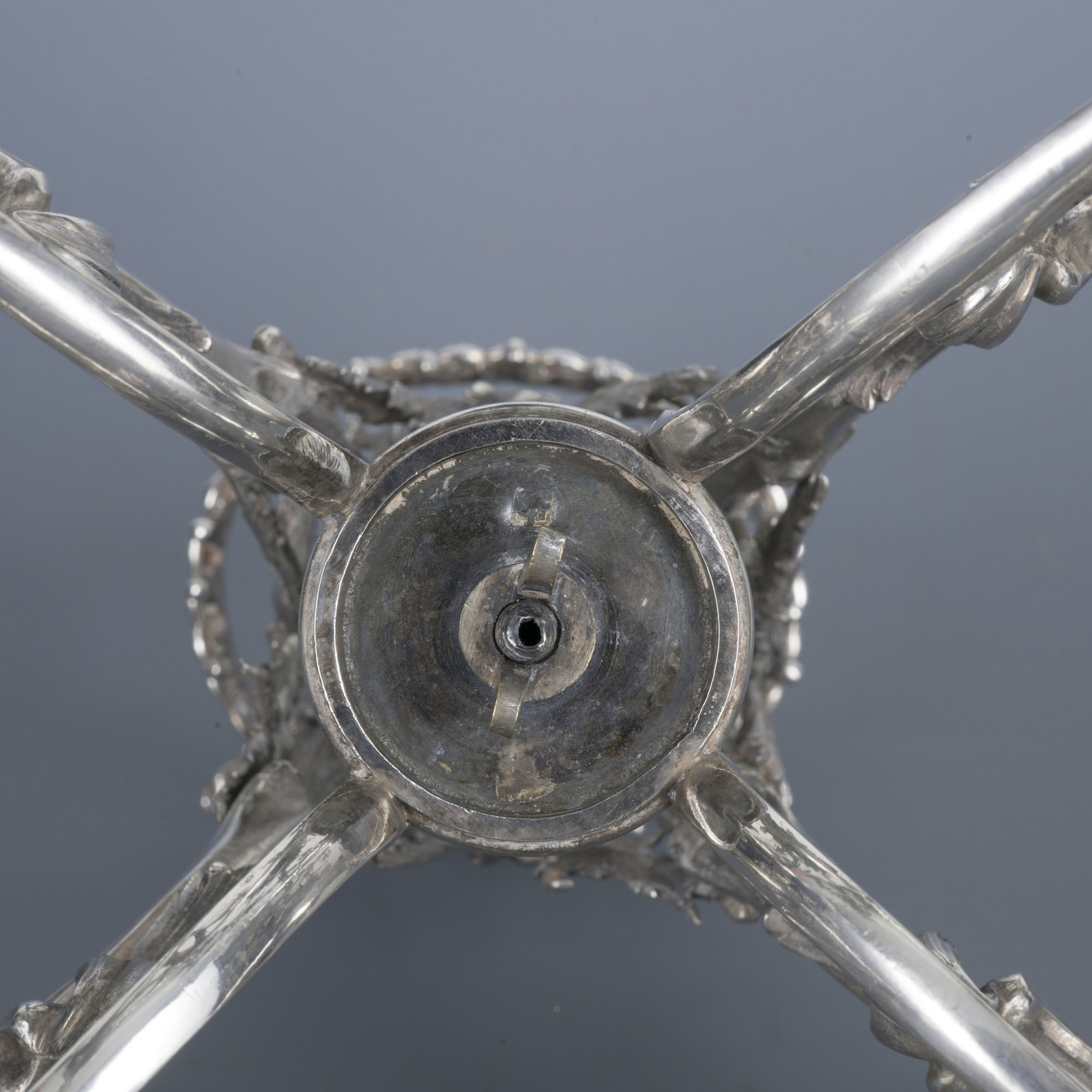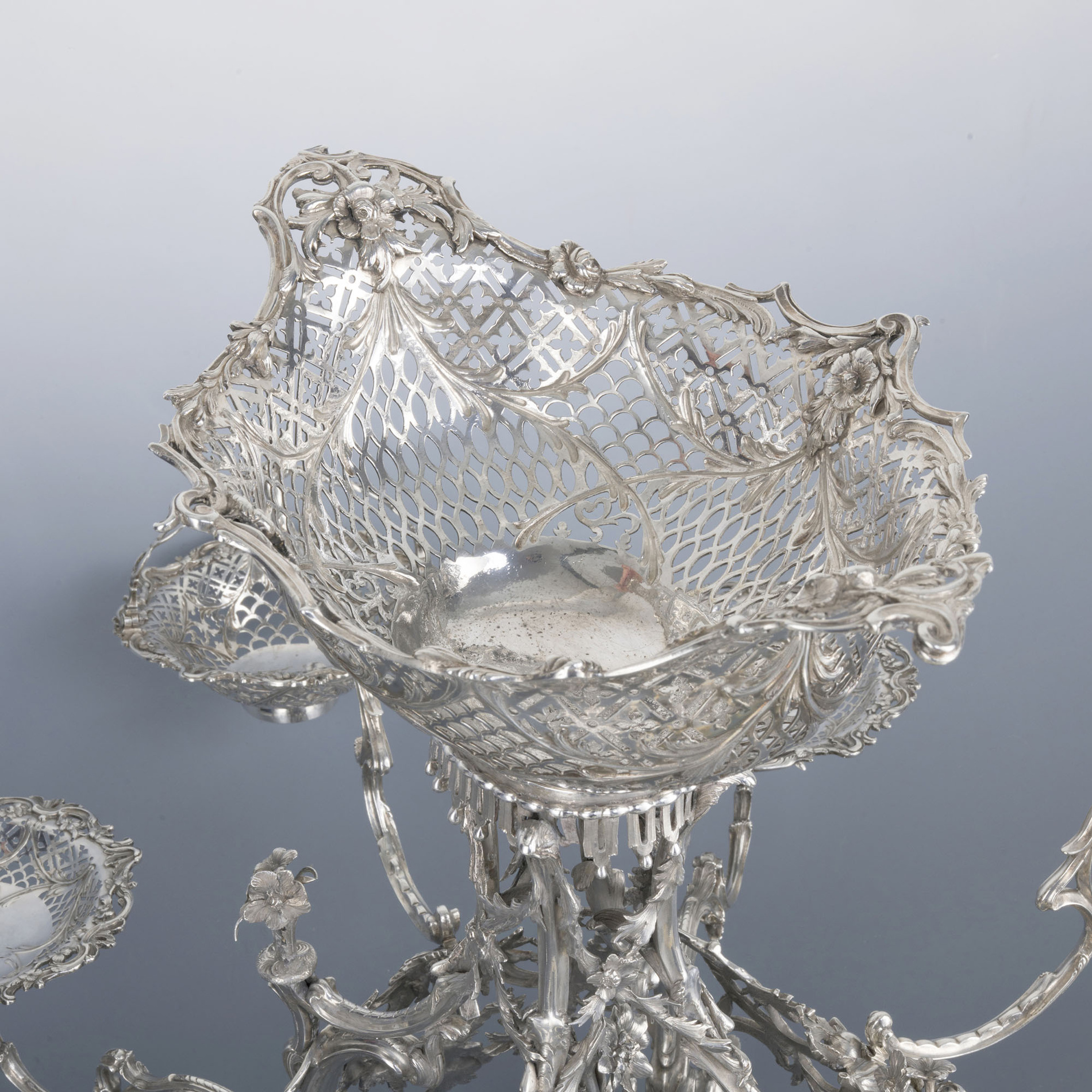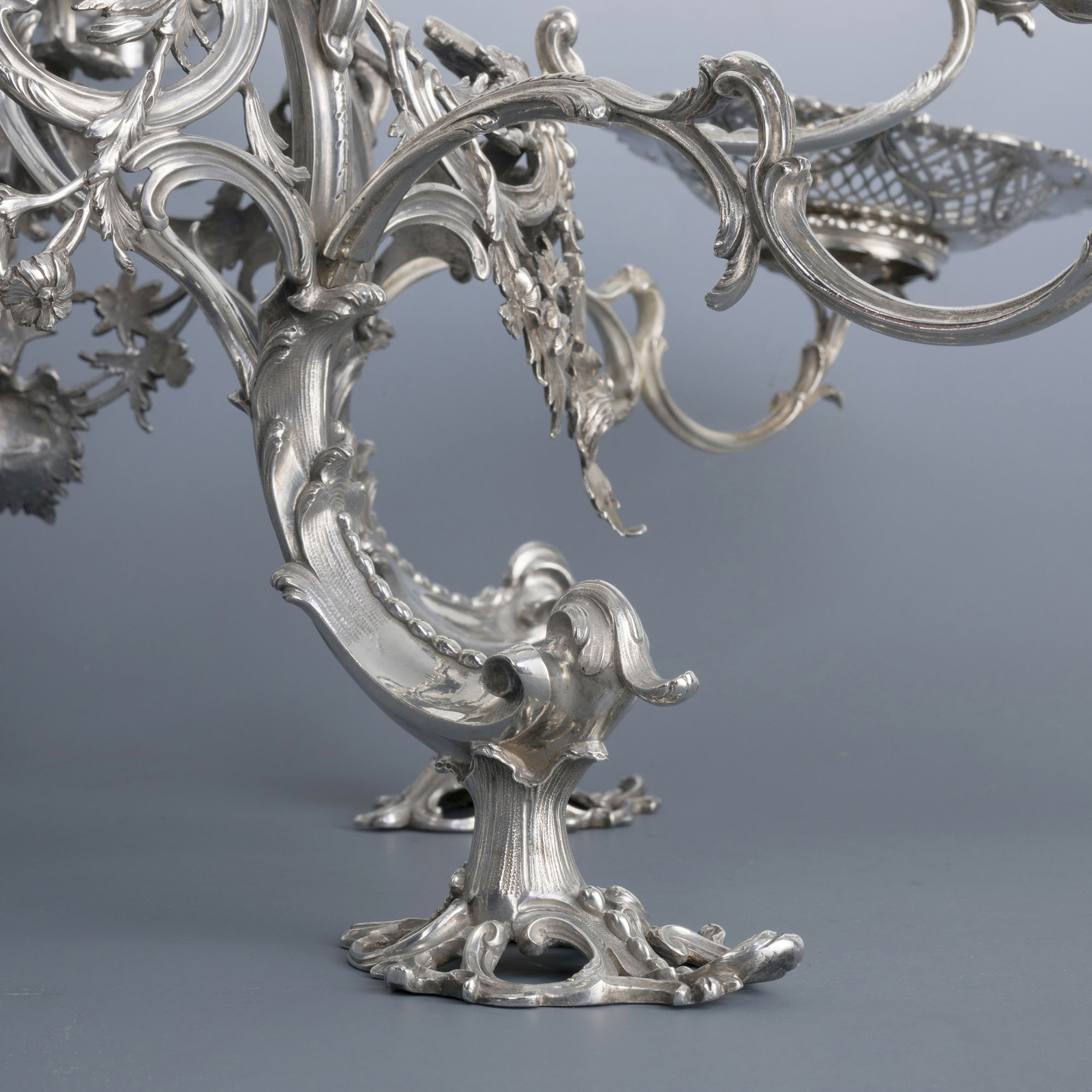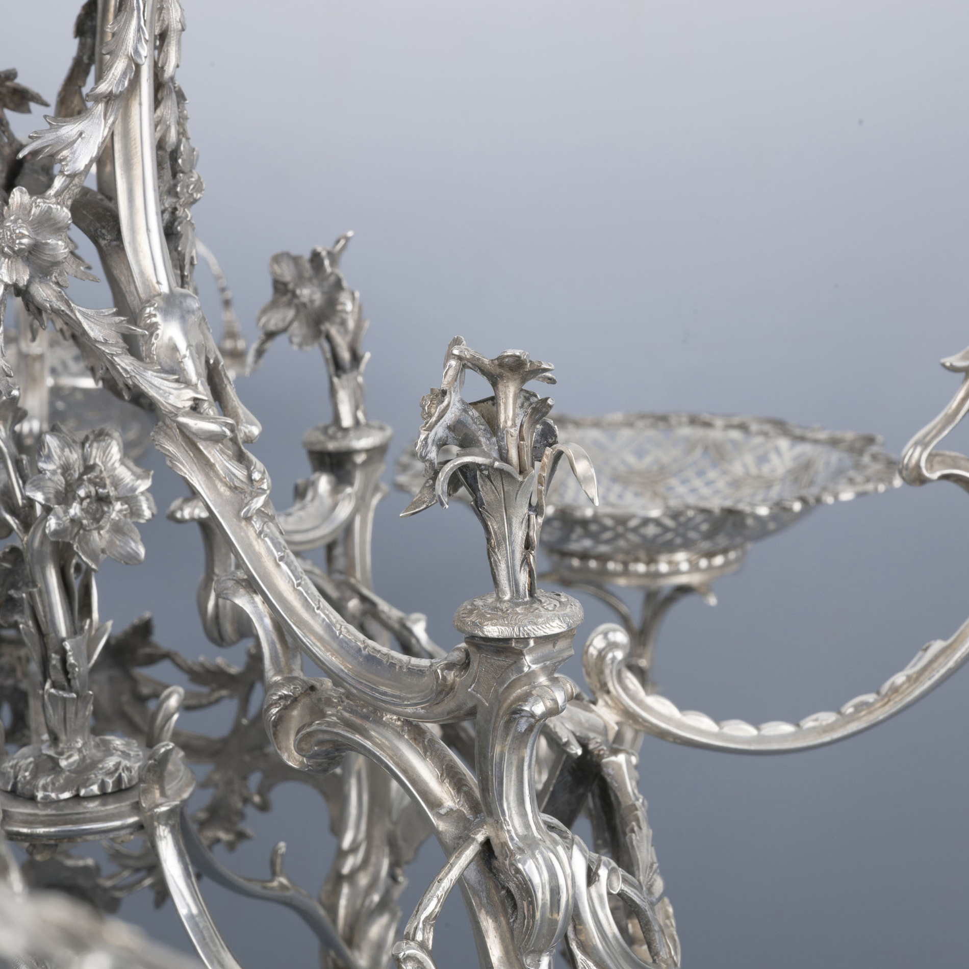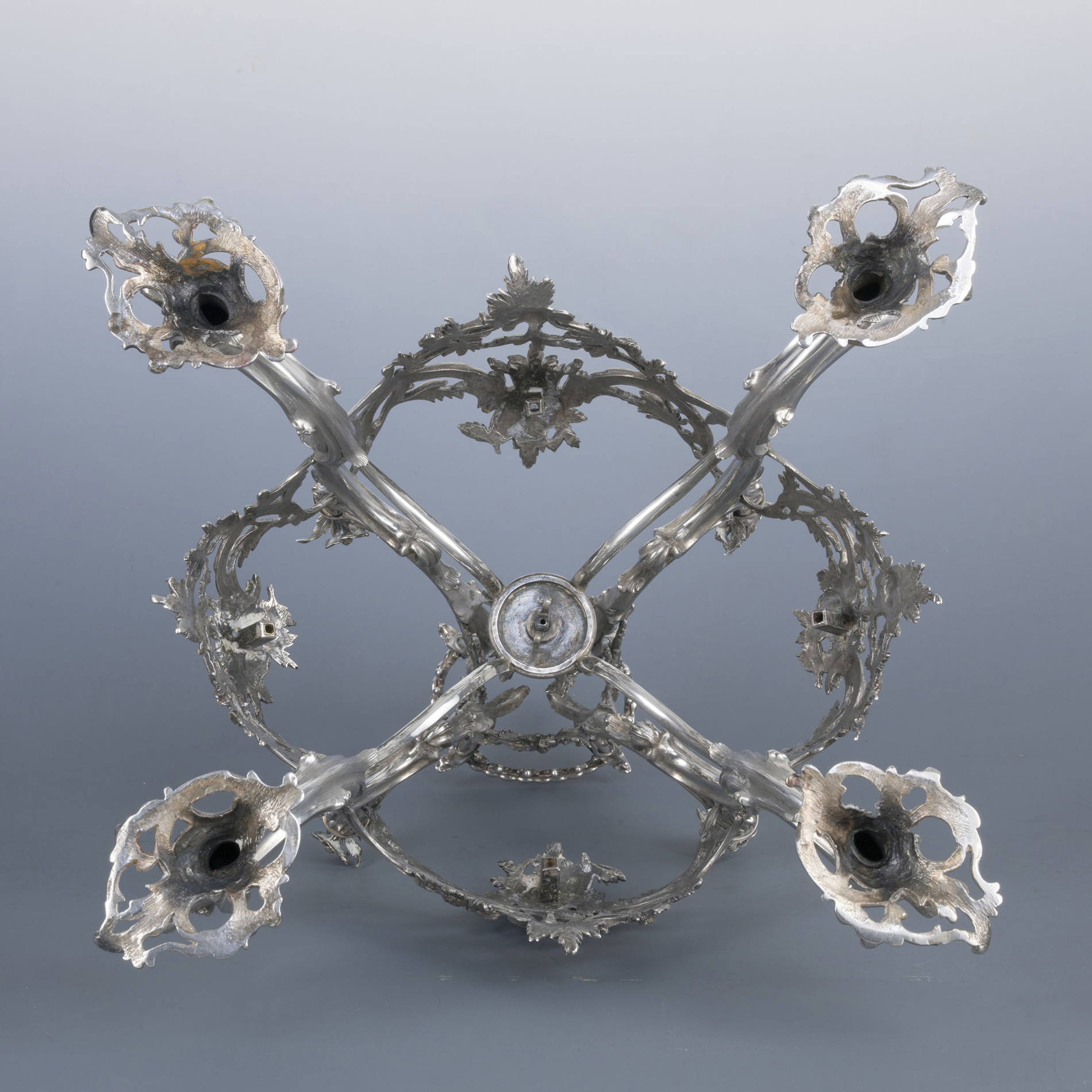 An épergne or silver centrepiece comprising eight arms supporting four shallow resting baskets and four handled baskets