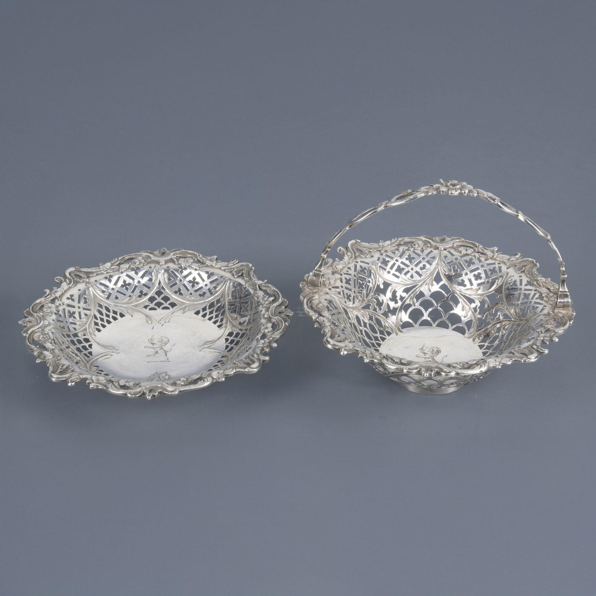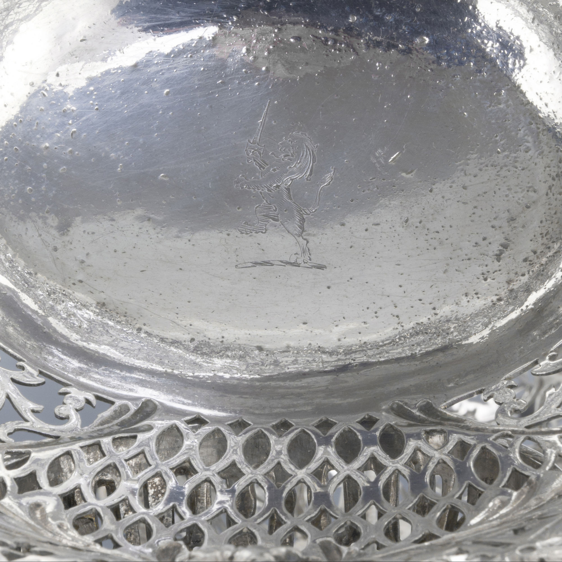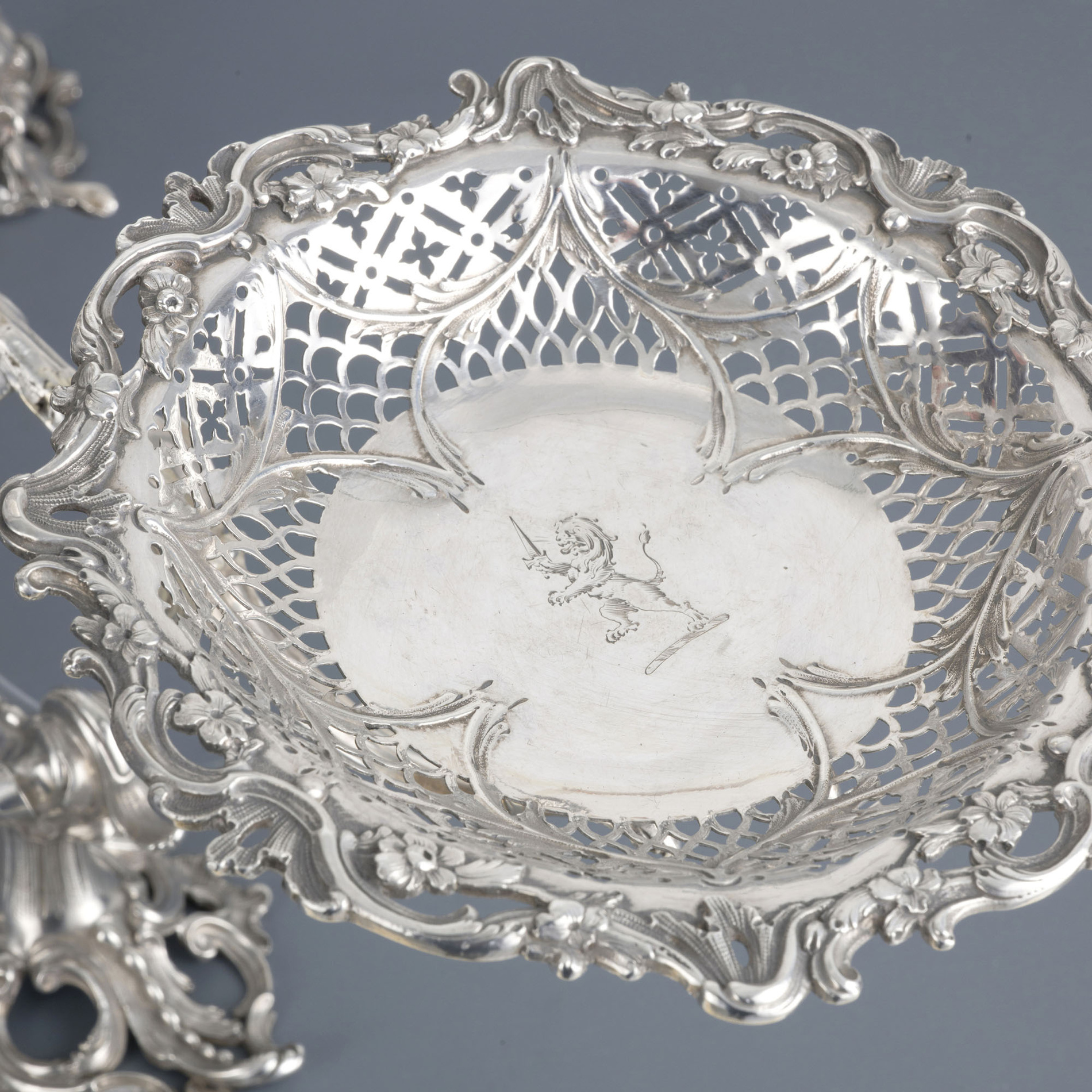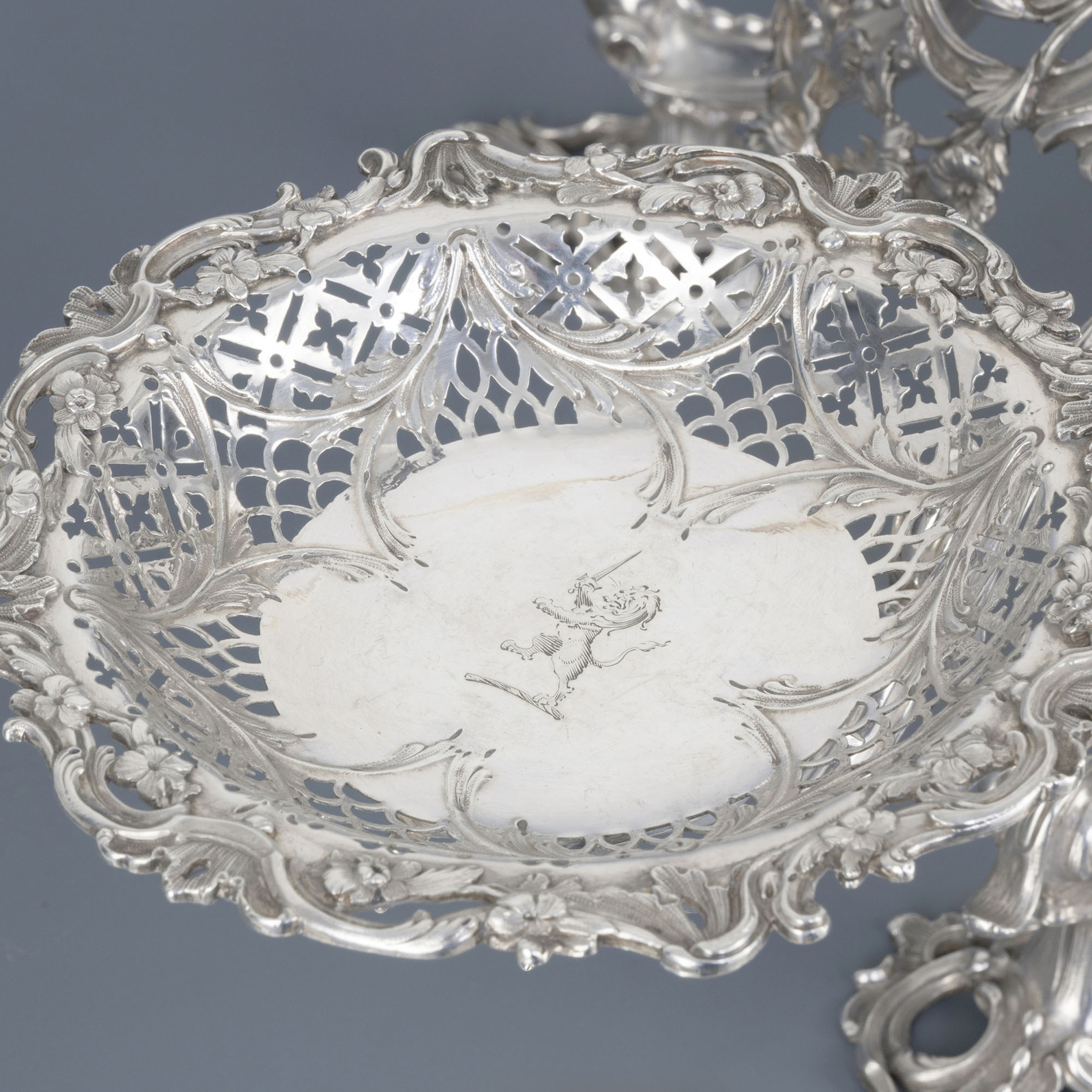 The body with openwork decoration featuring geometric, floral and scroll motifs; a central fruit holder; and worked supports; each basket is engraved with a crest