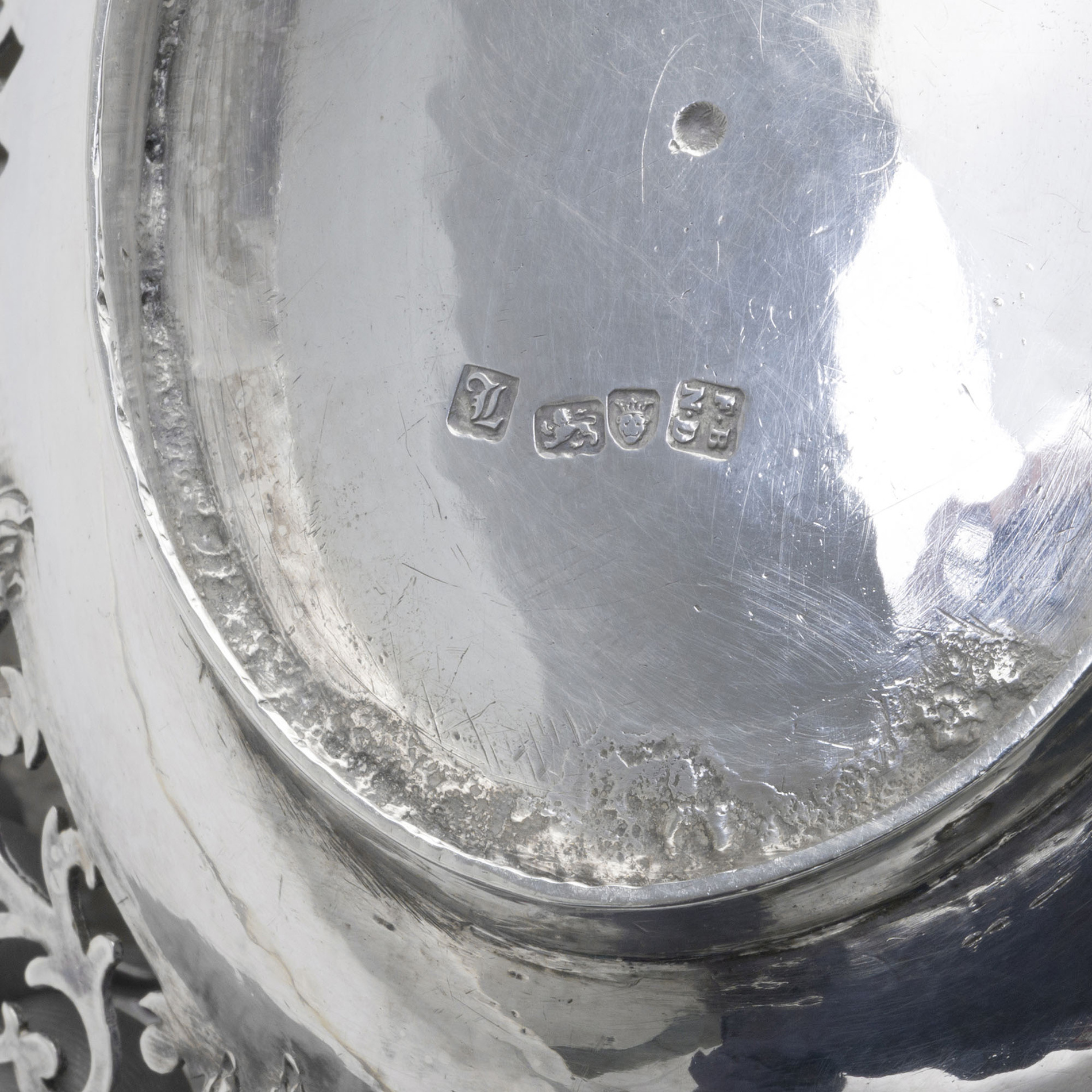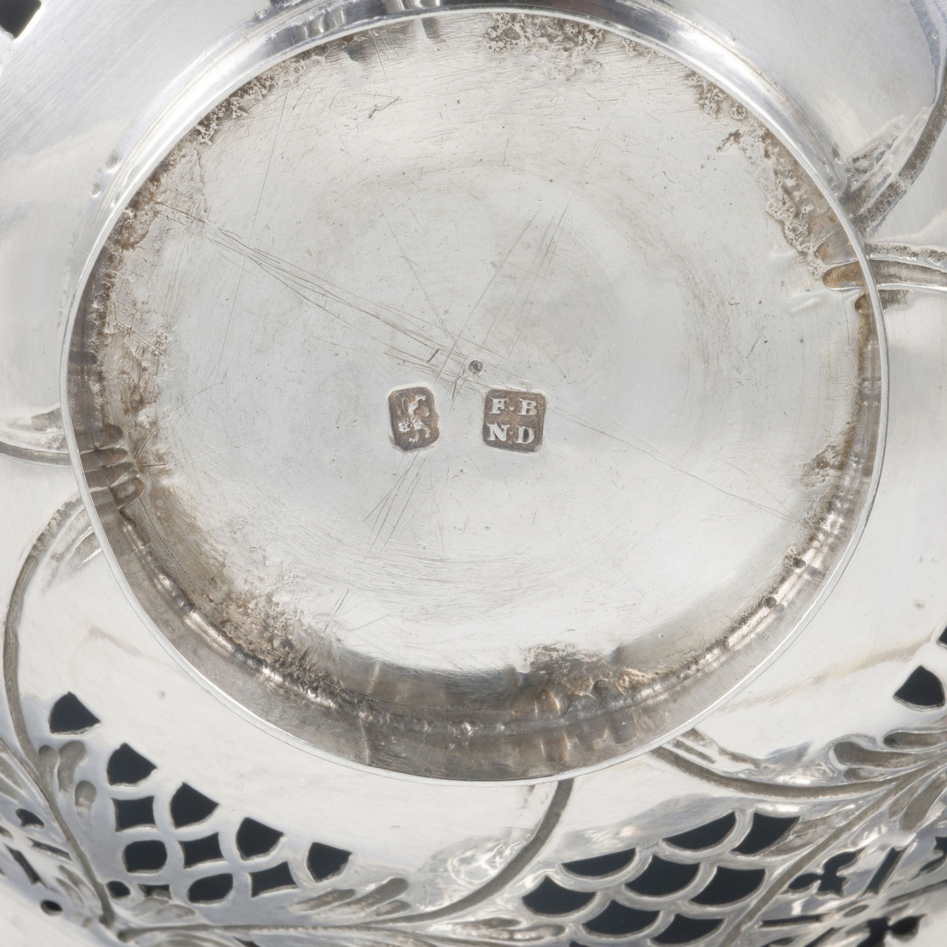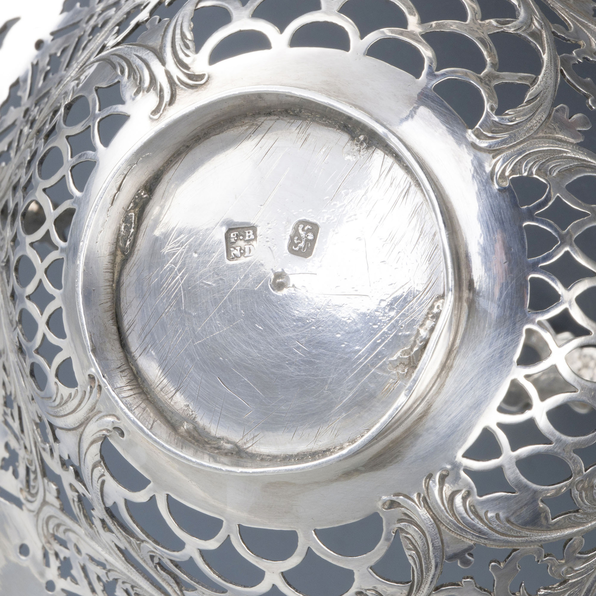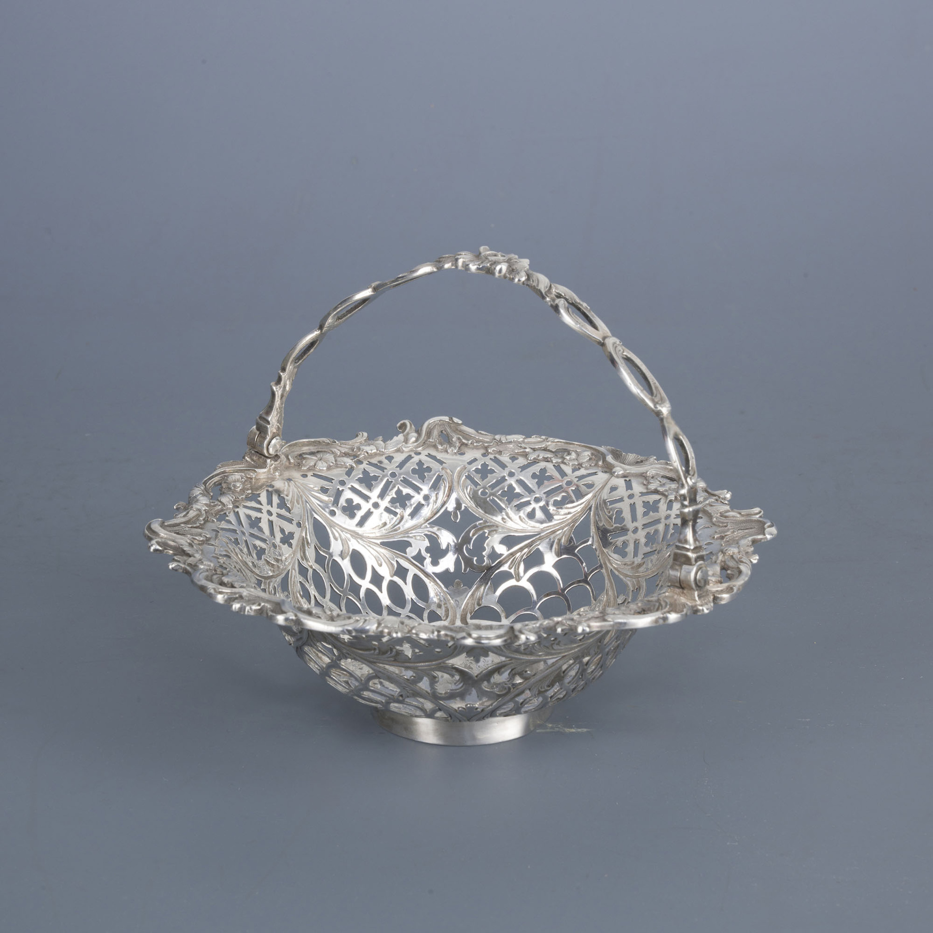 The body with openwork decoration featuring geometric, floral and scroll motifs; a central fruit holder; and worked supports; each basket is engraved with a crest