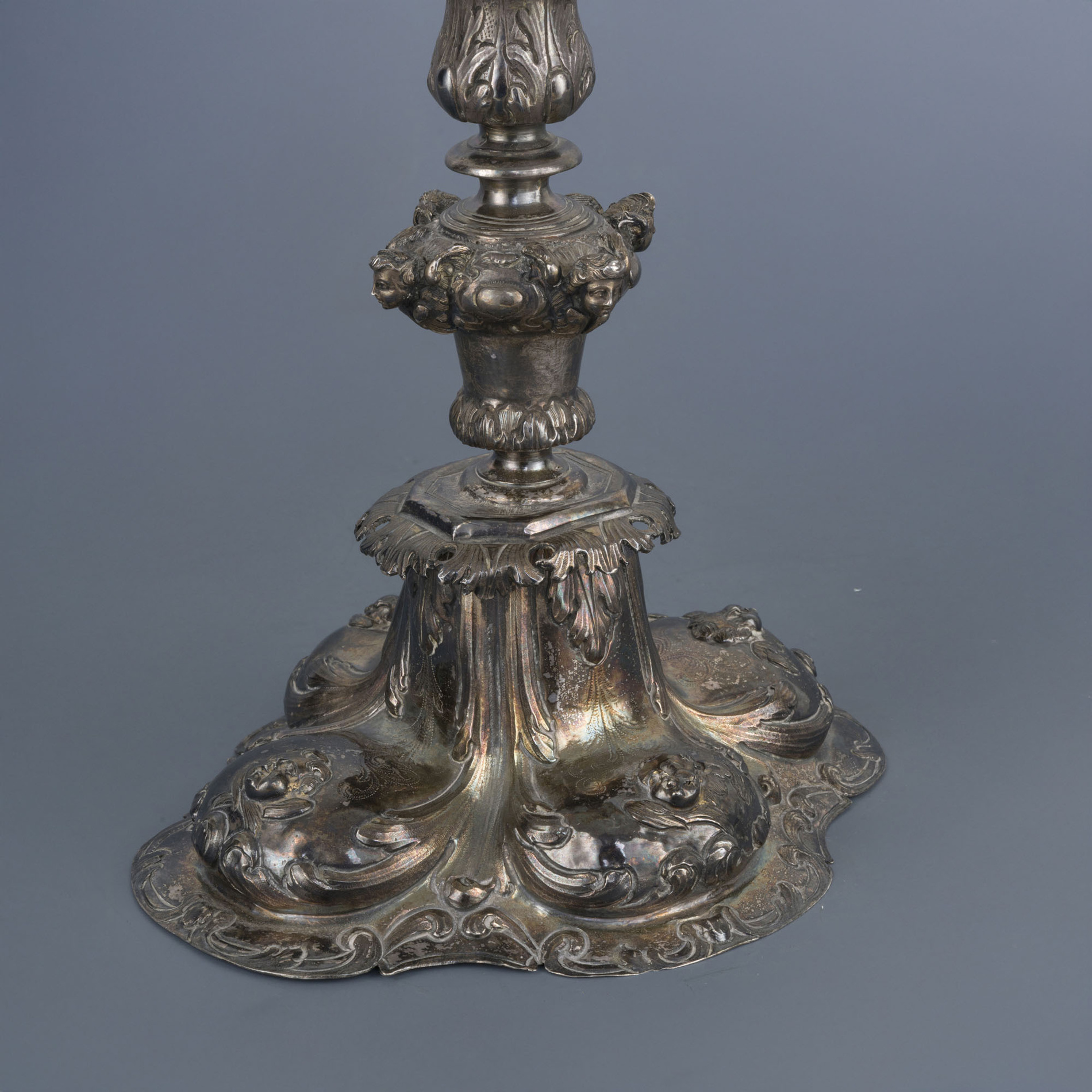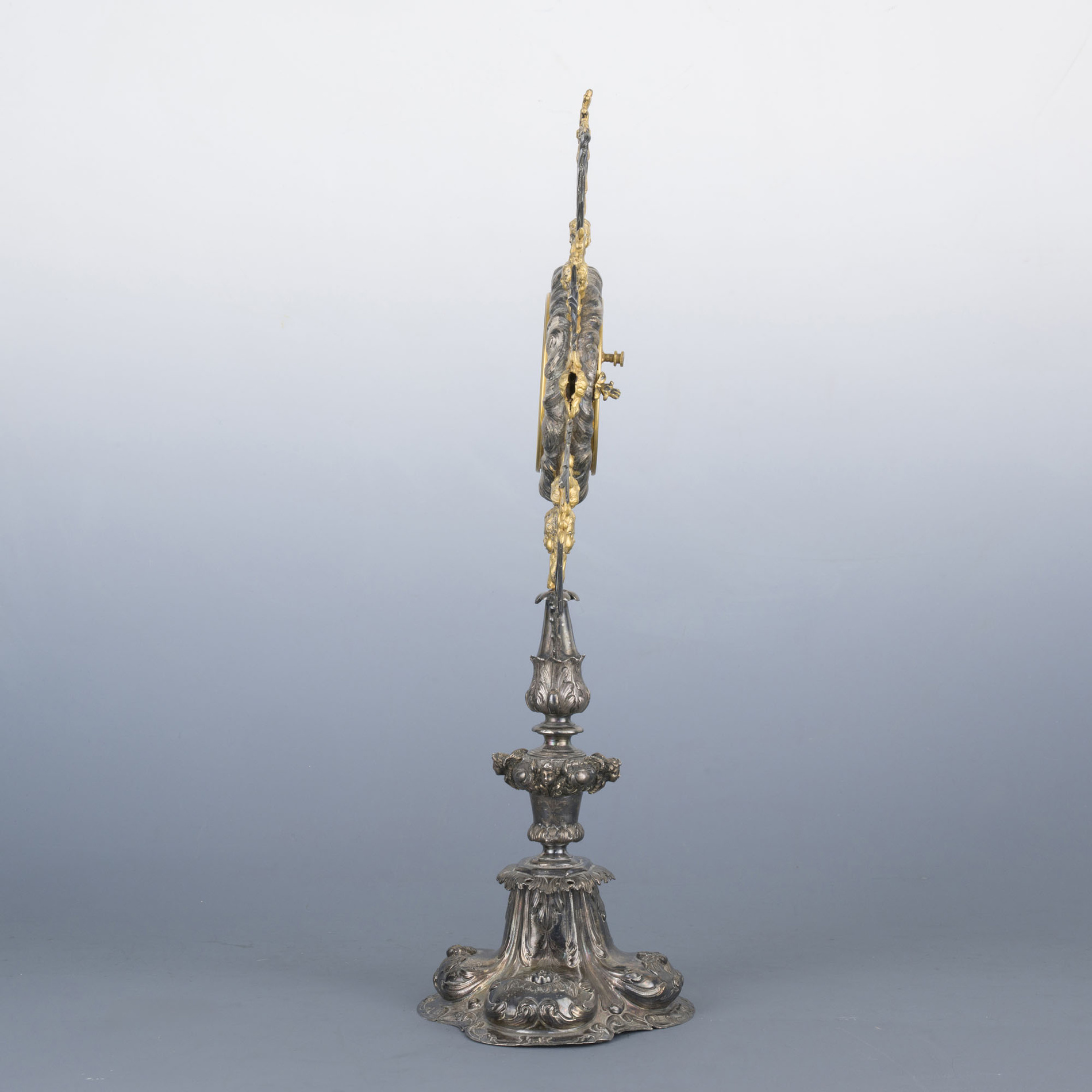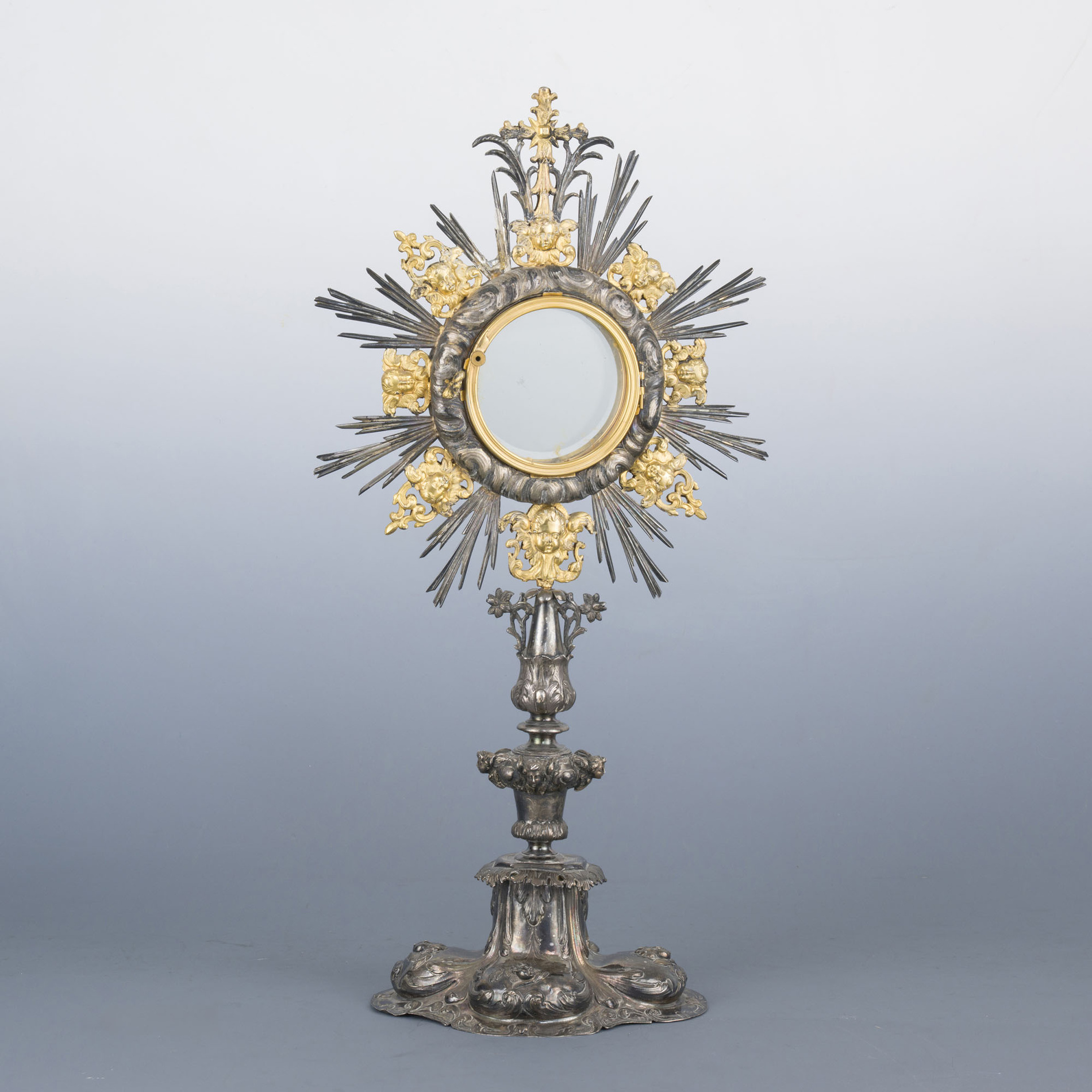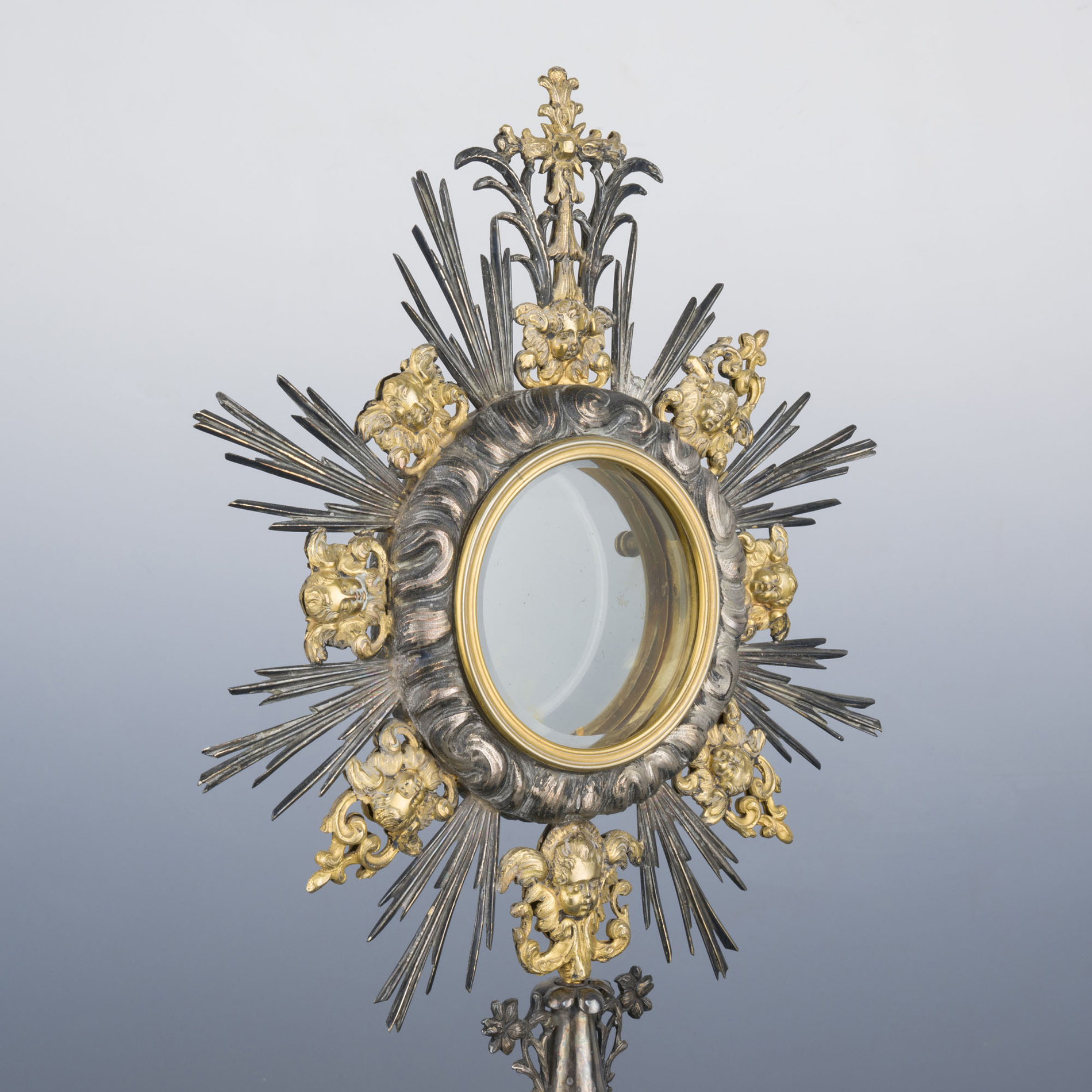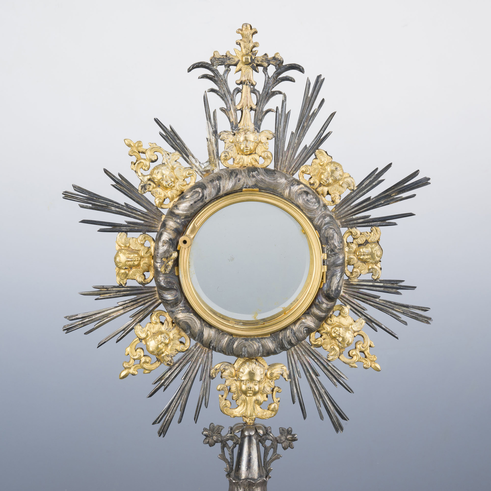 Body chased in relief depicting cherubs and scrolls, central upper part hinged, surrounded by gilded cherub heads, terminal with a cross