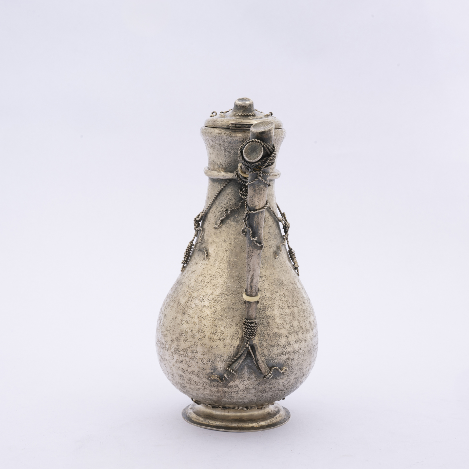 A silver coffee pot with a body worked with braided rope decoration