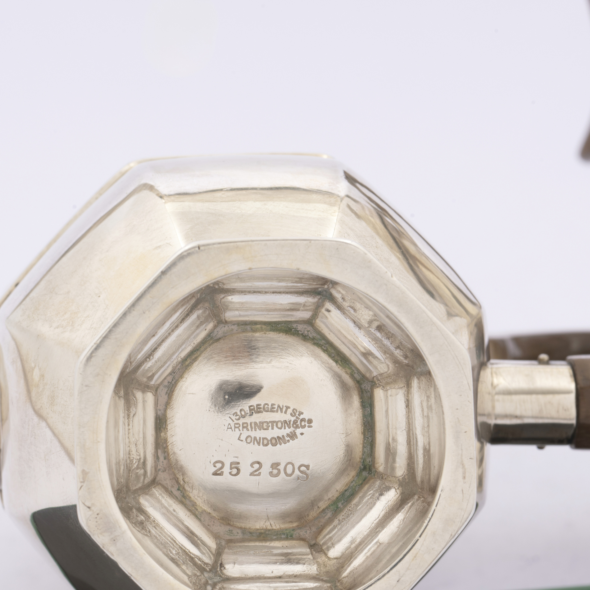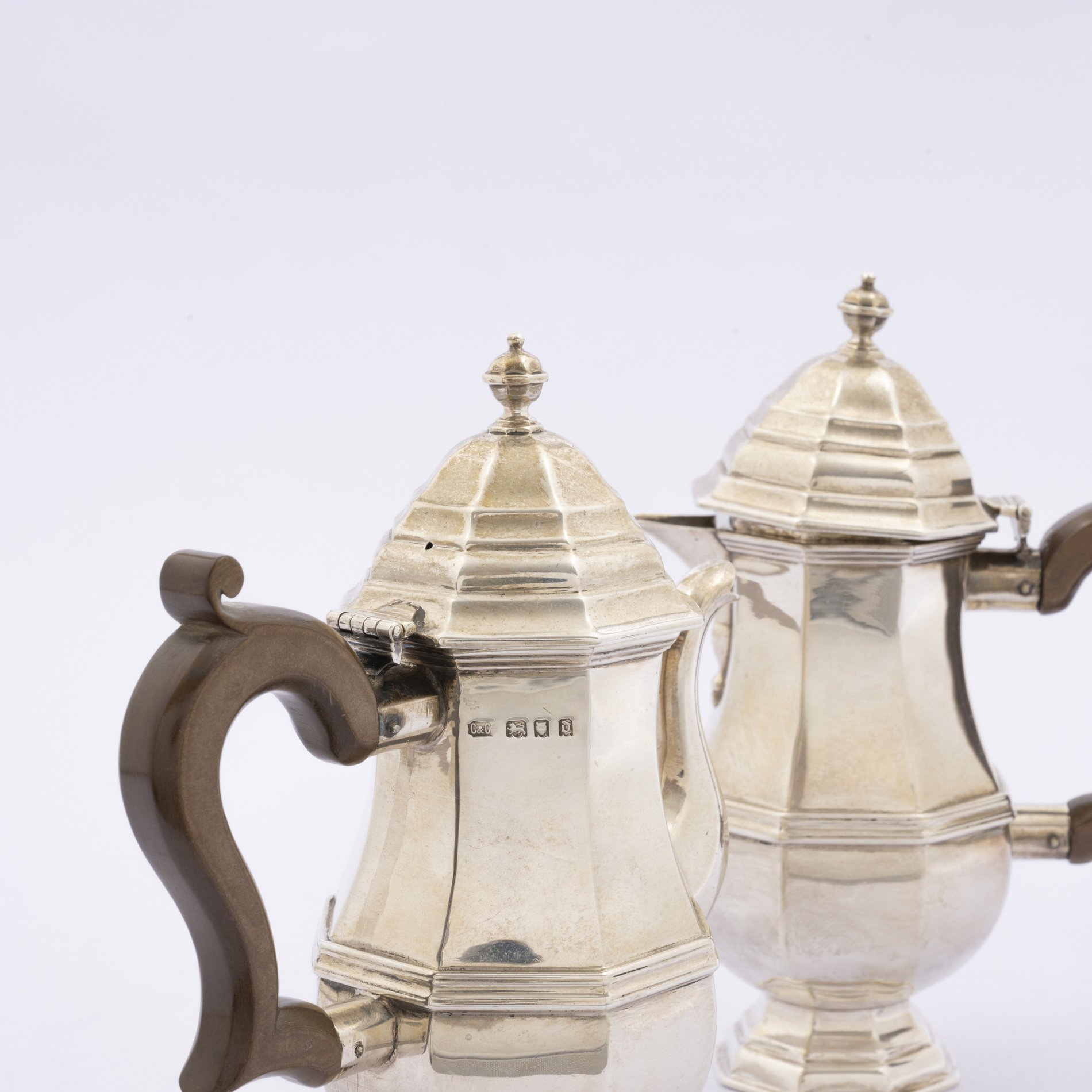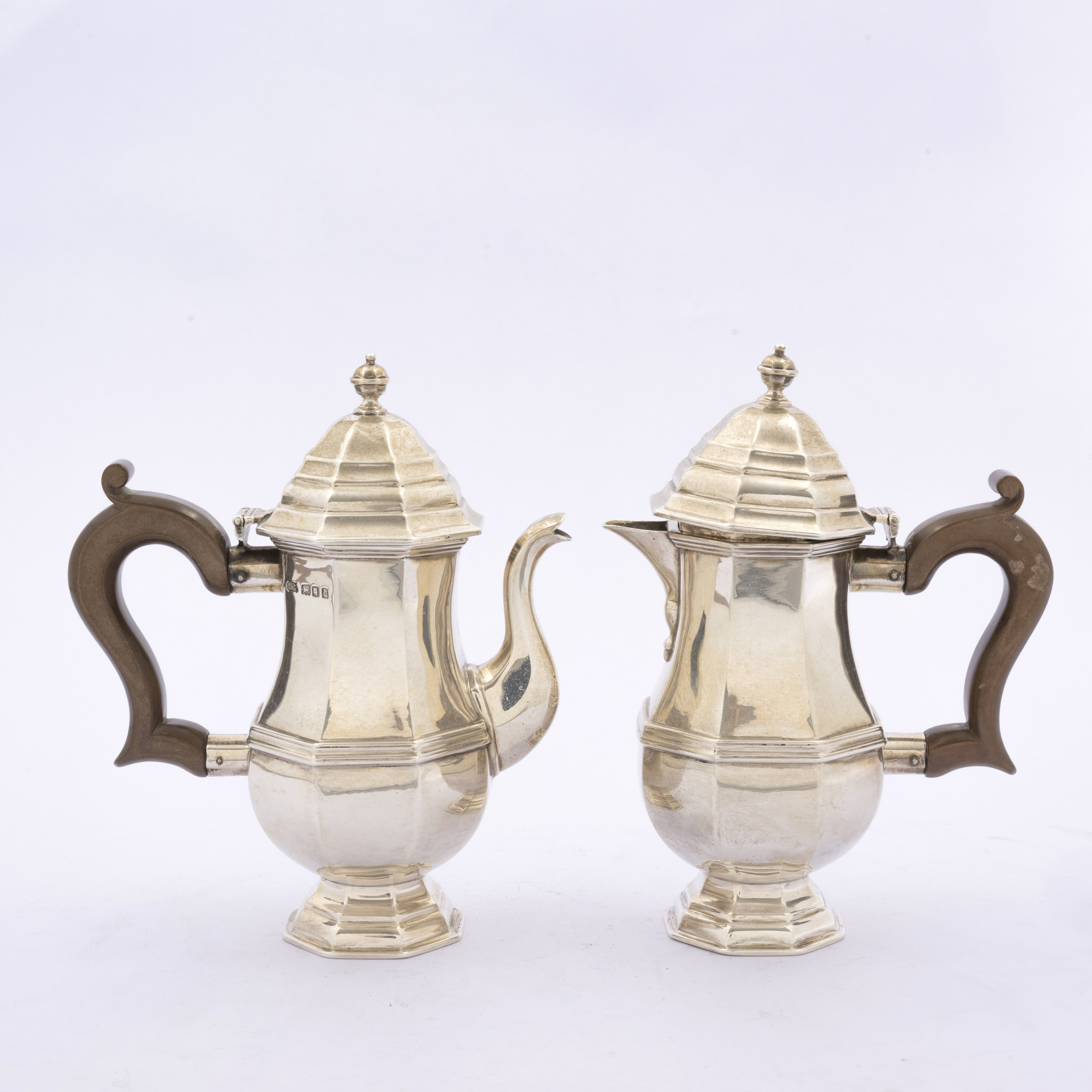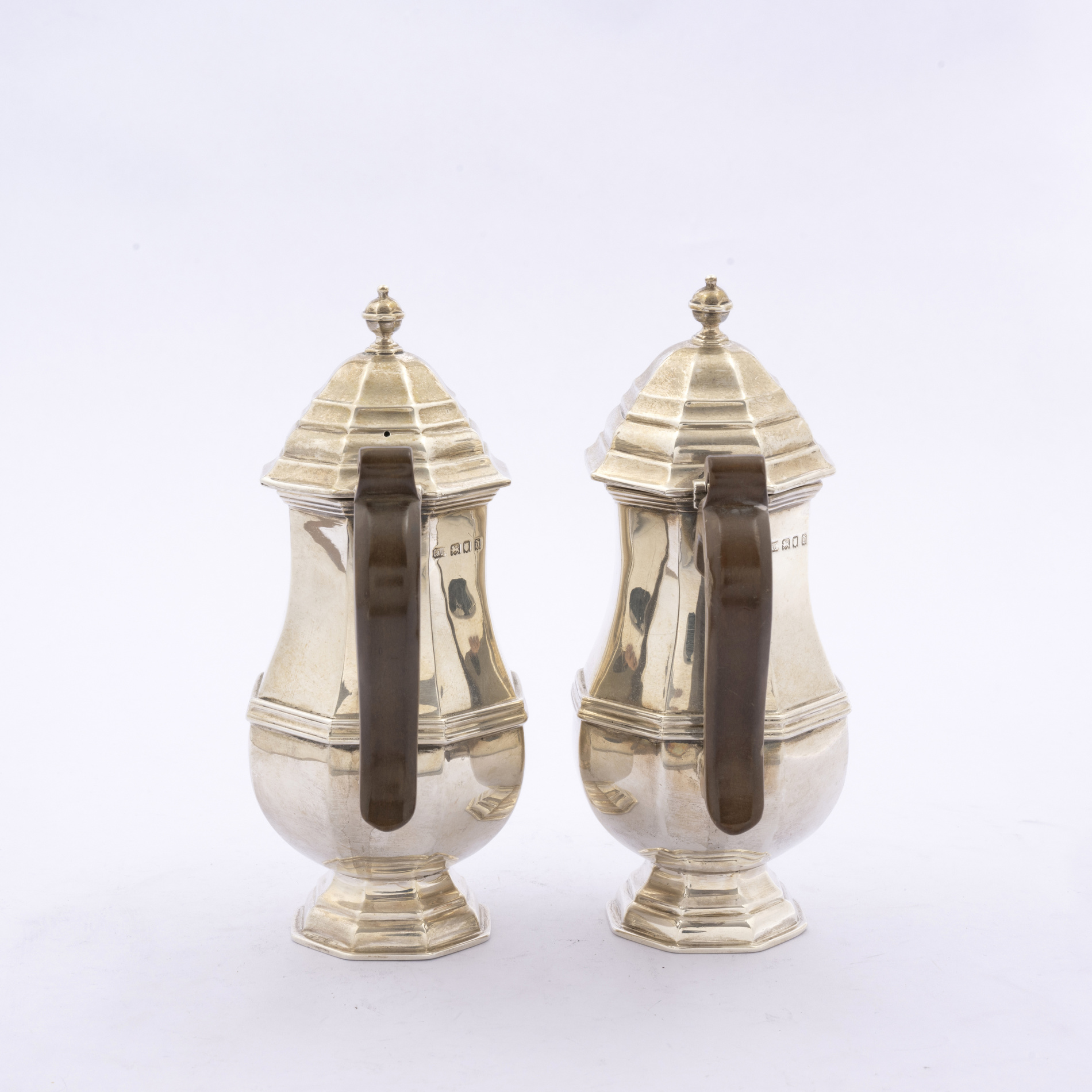 A pair of silver coffee pots with smooth octagonal-shaped bodies