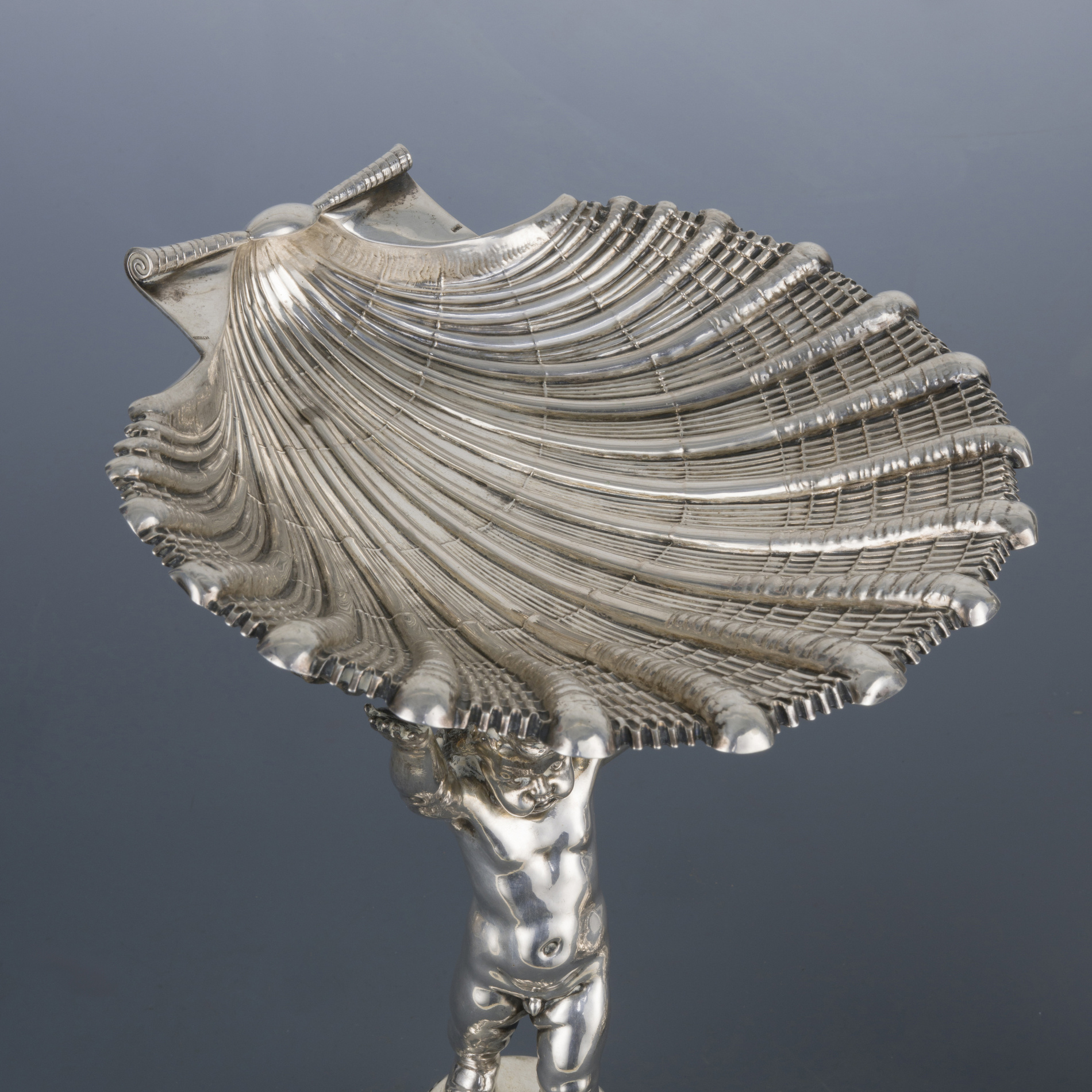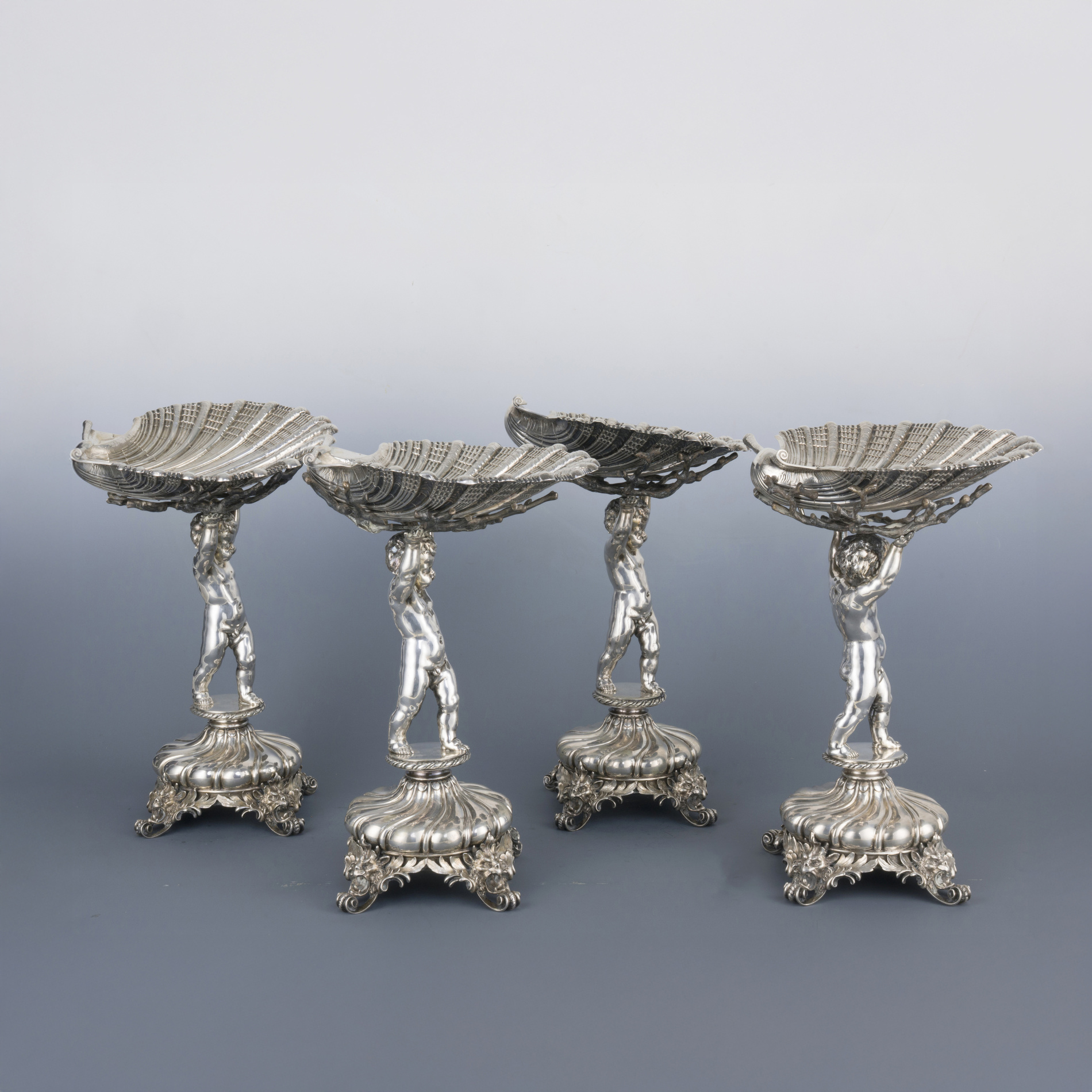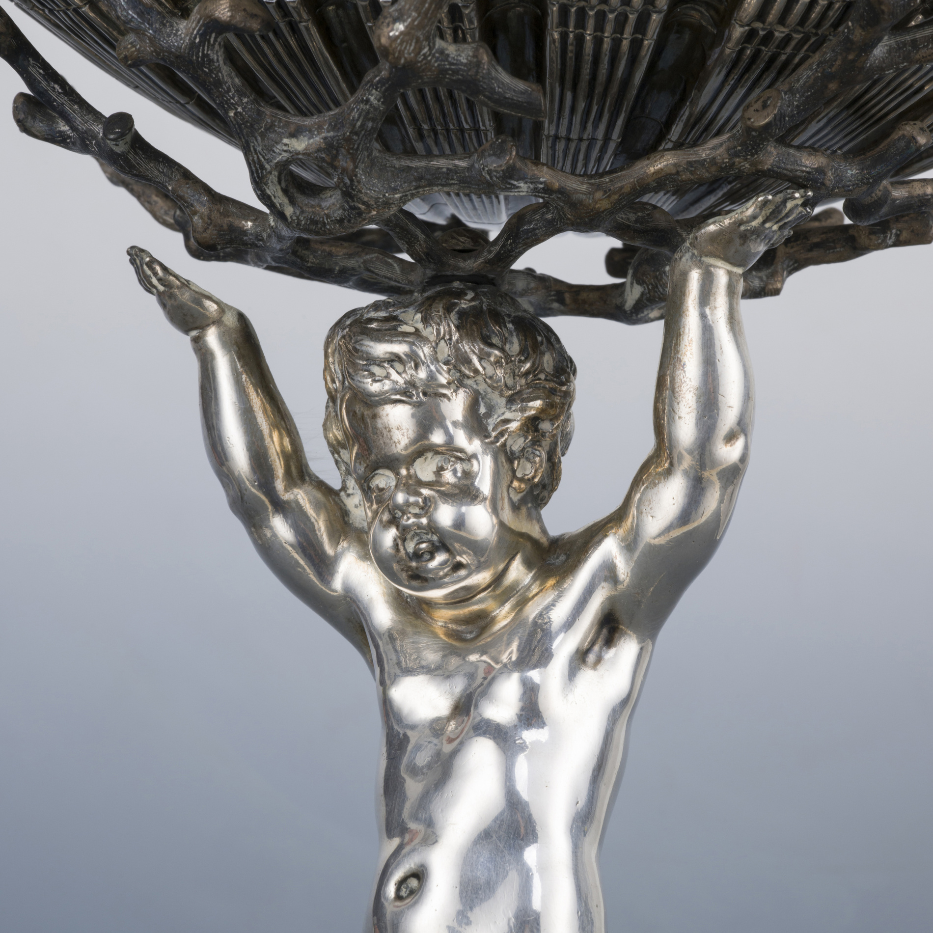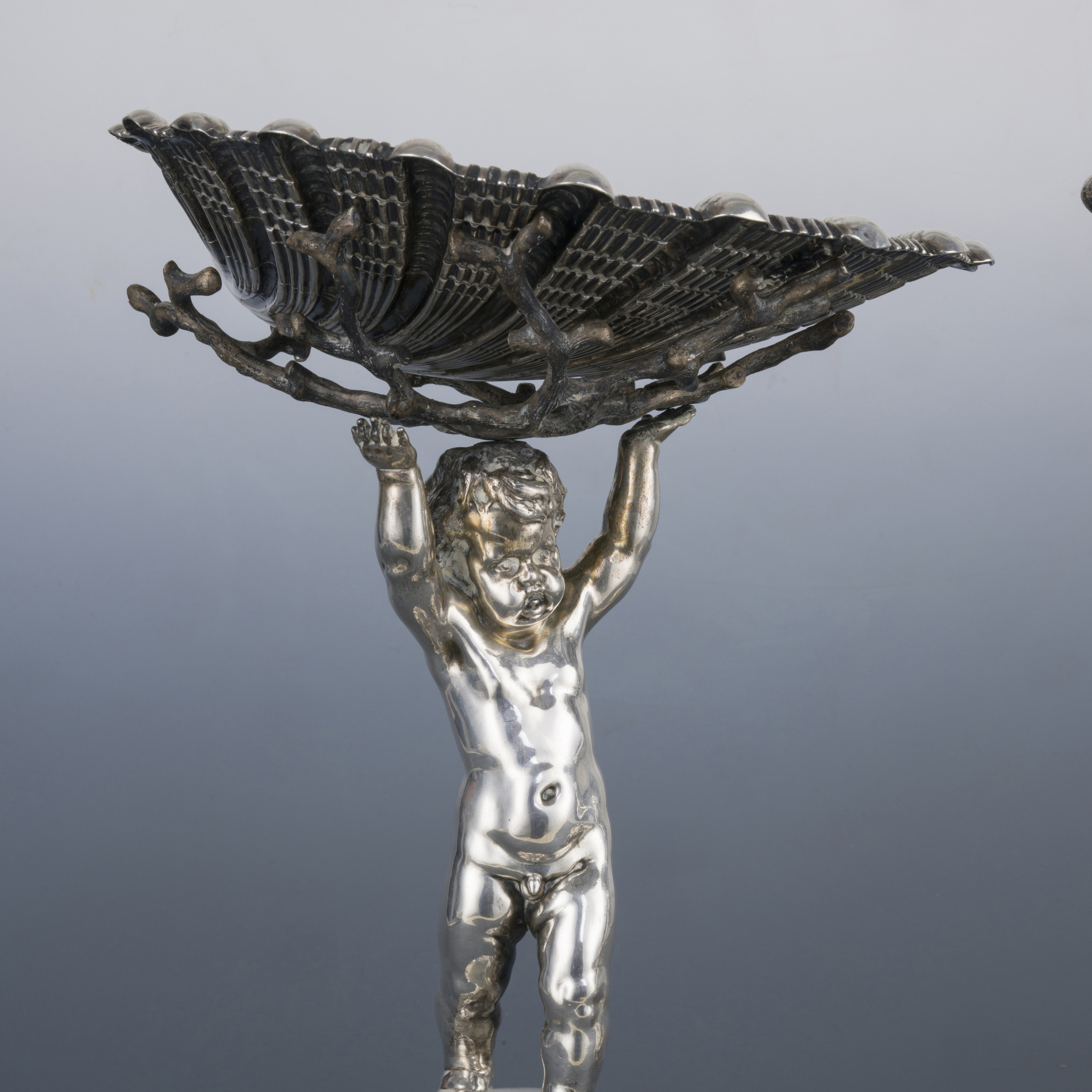 Figures modelled as Baroque-style putti supporting a branching element surmounted by a shell-shaped dish; circular bases with twisted fluted decoration and mask-form mounts