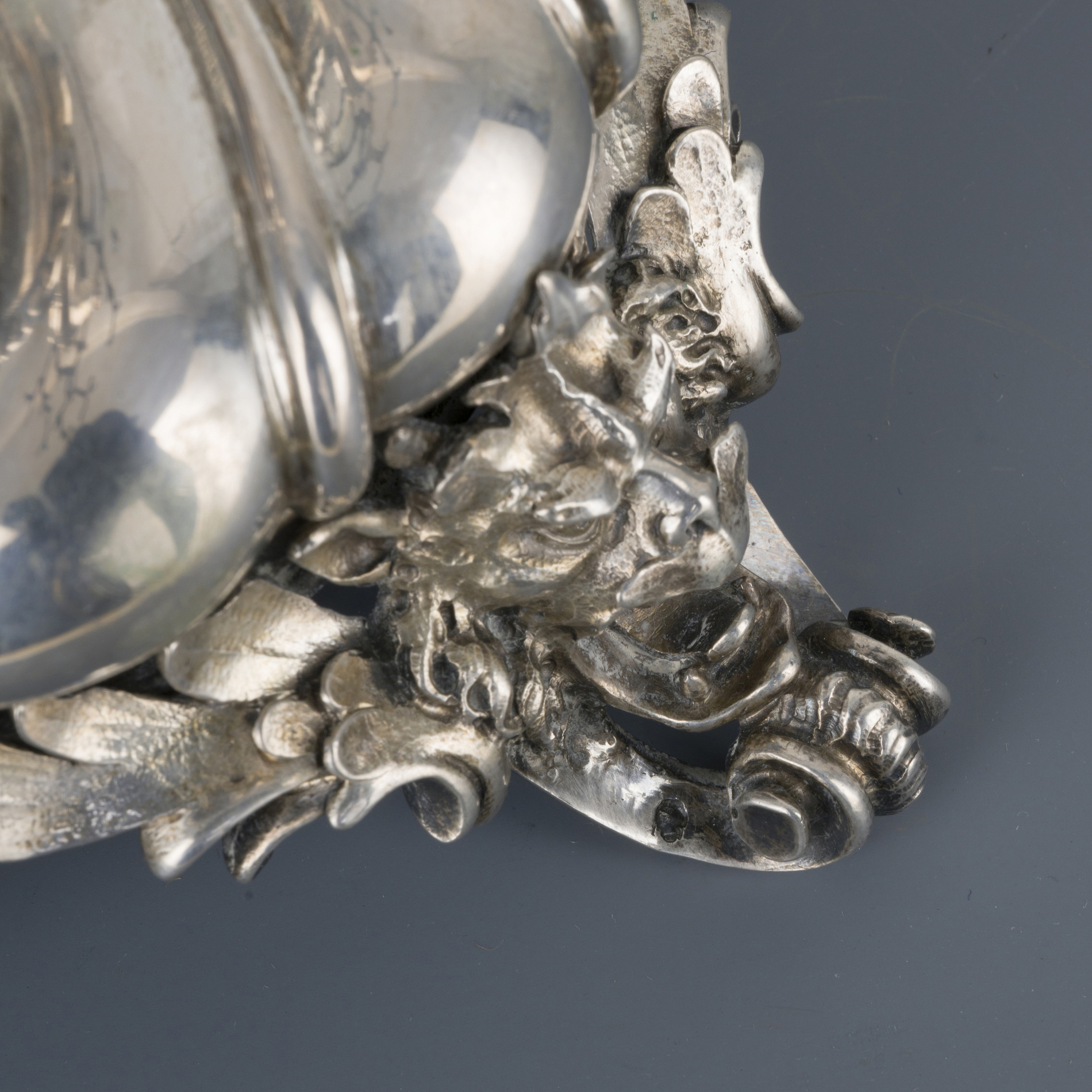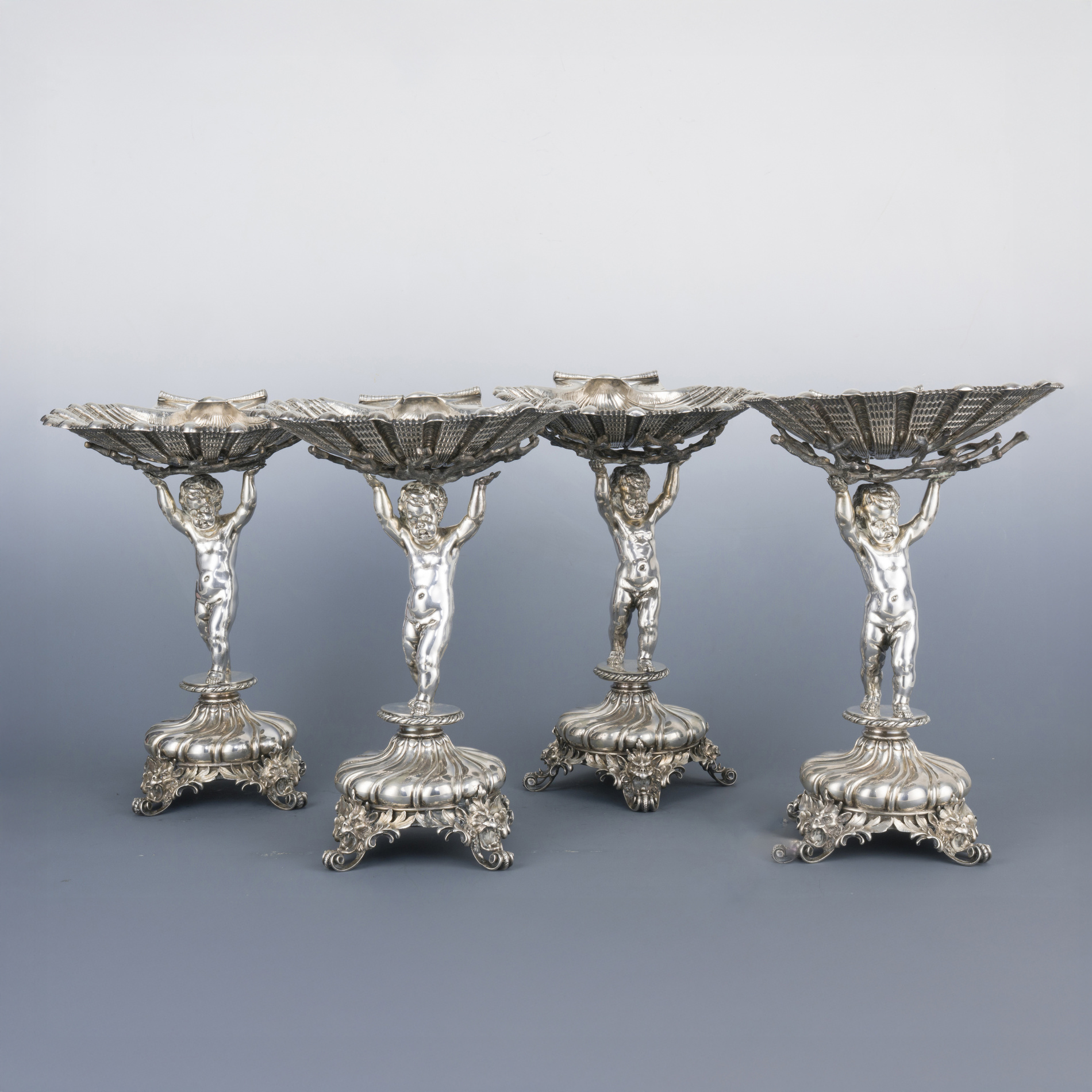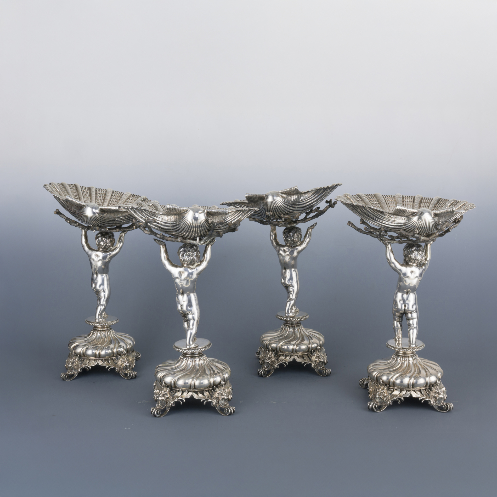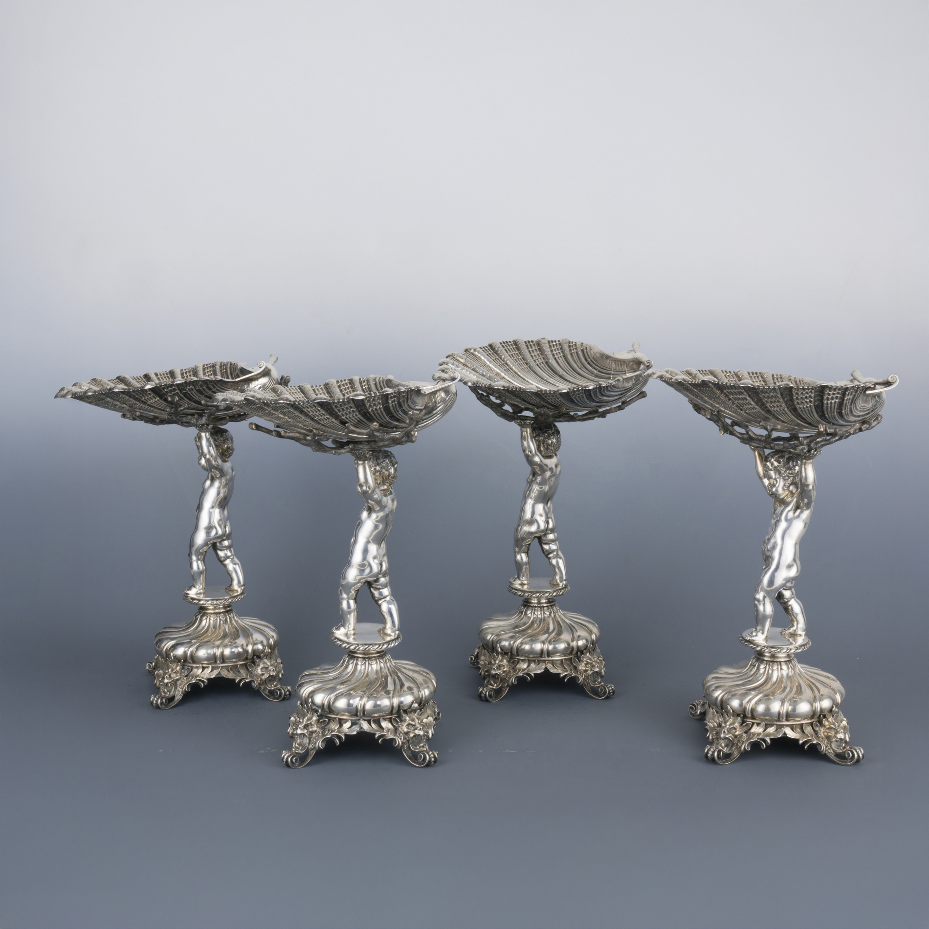 Figures modelled as Baroque-style putti supporting a branching element surmounted by a shell-shaped dish; circular bases with twisted fluted decoration and mask-form mounts