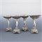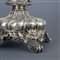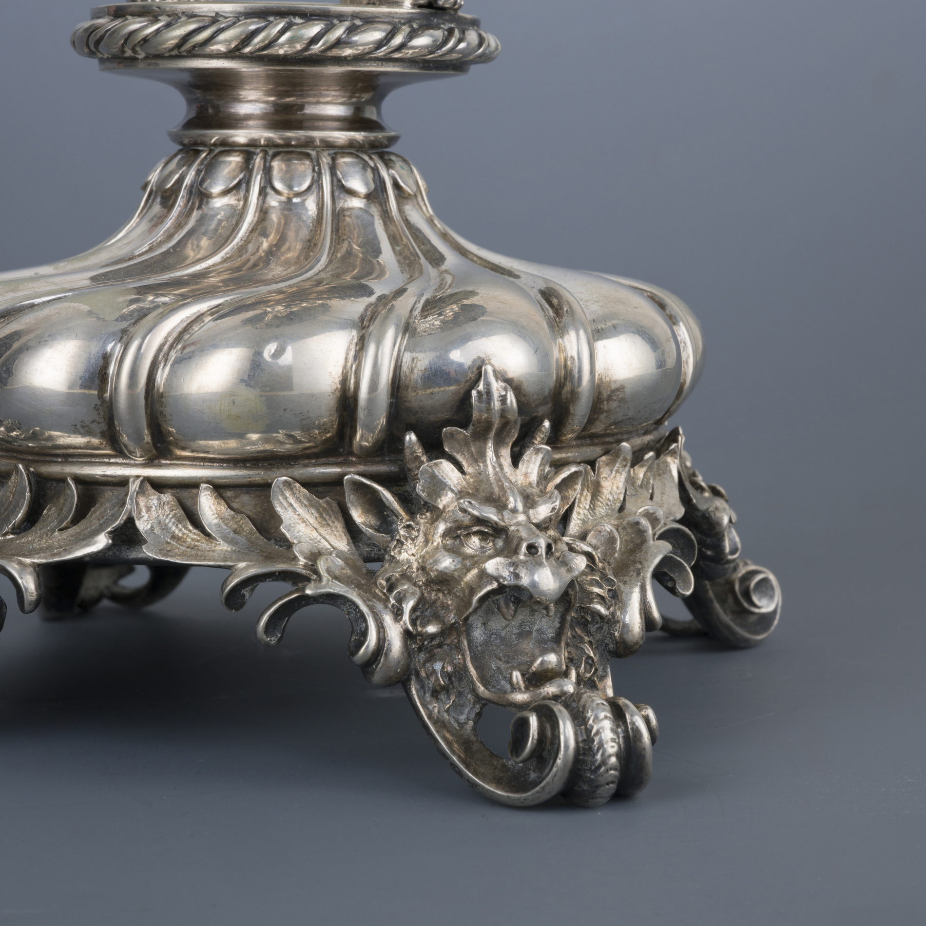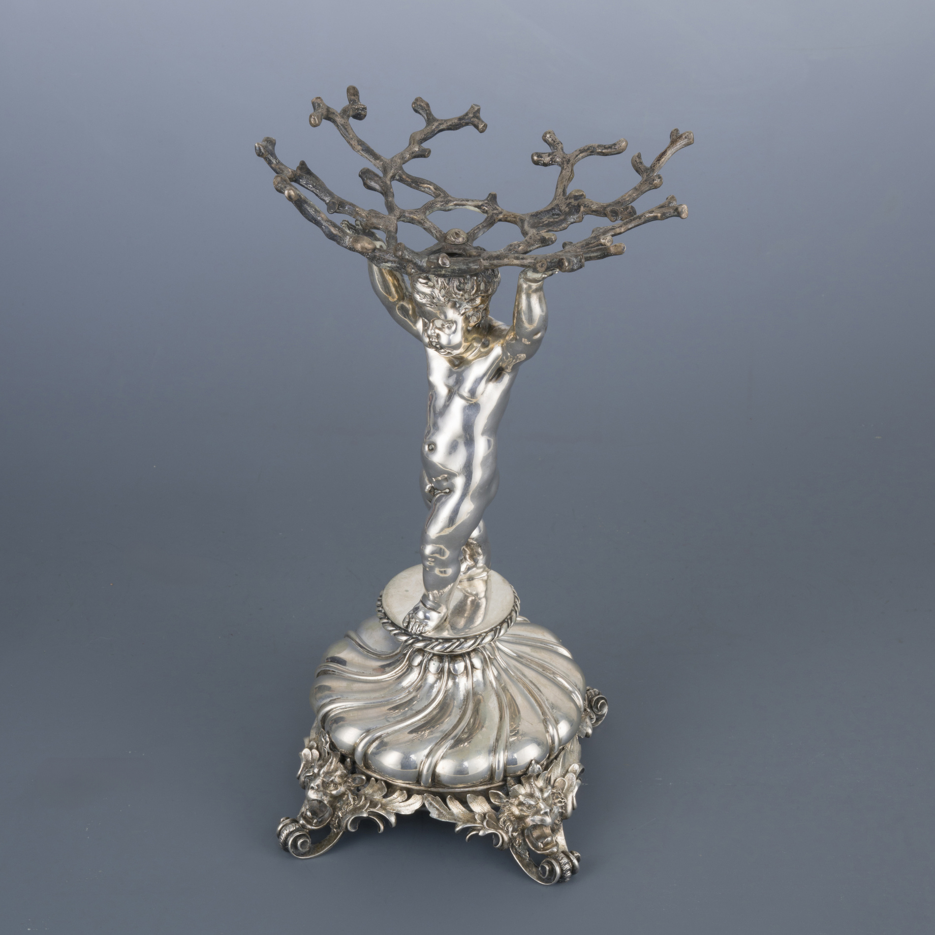 Corpi rappresentati da putti in stile seicentesco a sorreggere un elemento ramificato con piatto a forma di conchiglia, basi circolari con decoro costolato a torsione con montanti a mascheroni