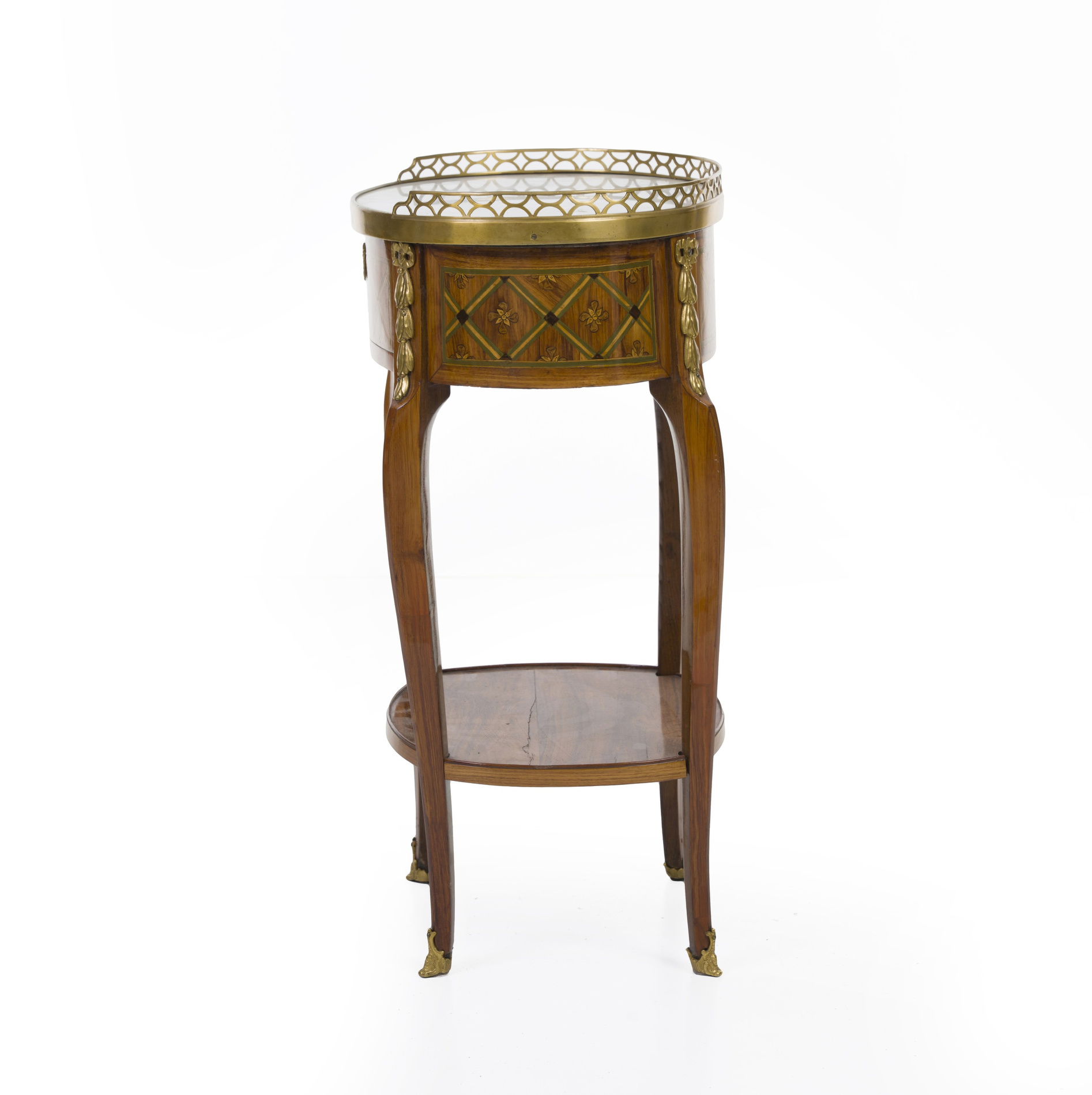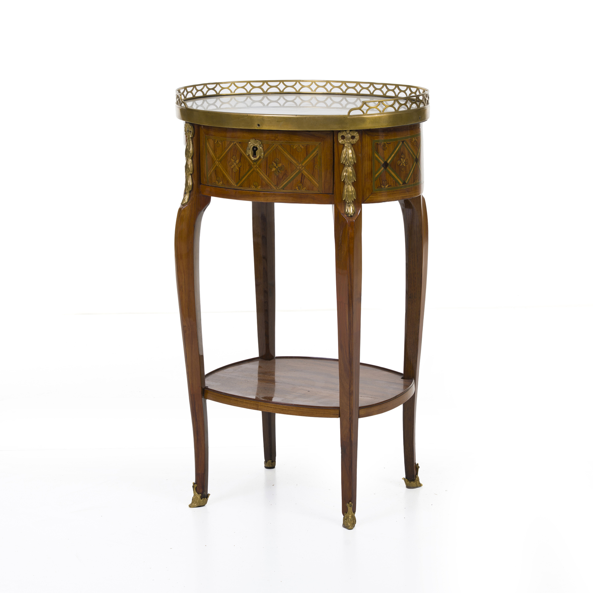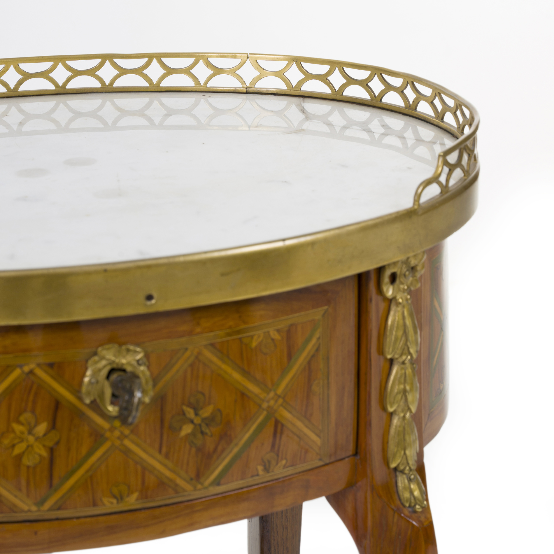 Tavolo da centro eseguito con legni preziosi, piano in marmo con ringhiera in bronzo dorato, con finiture in bronzo dorato