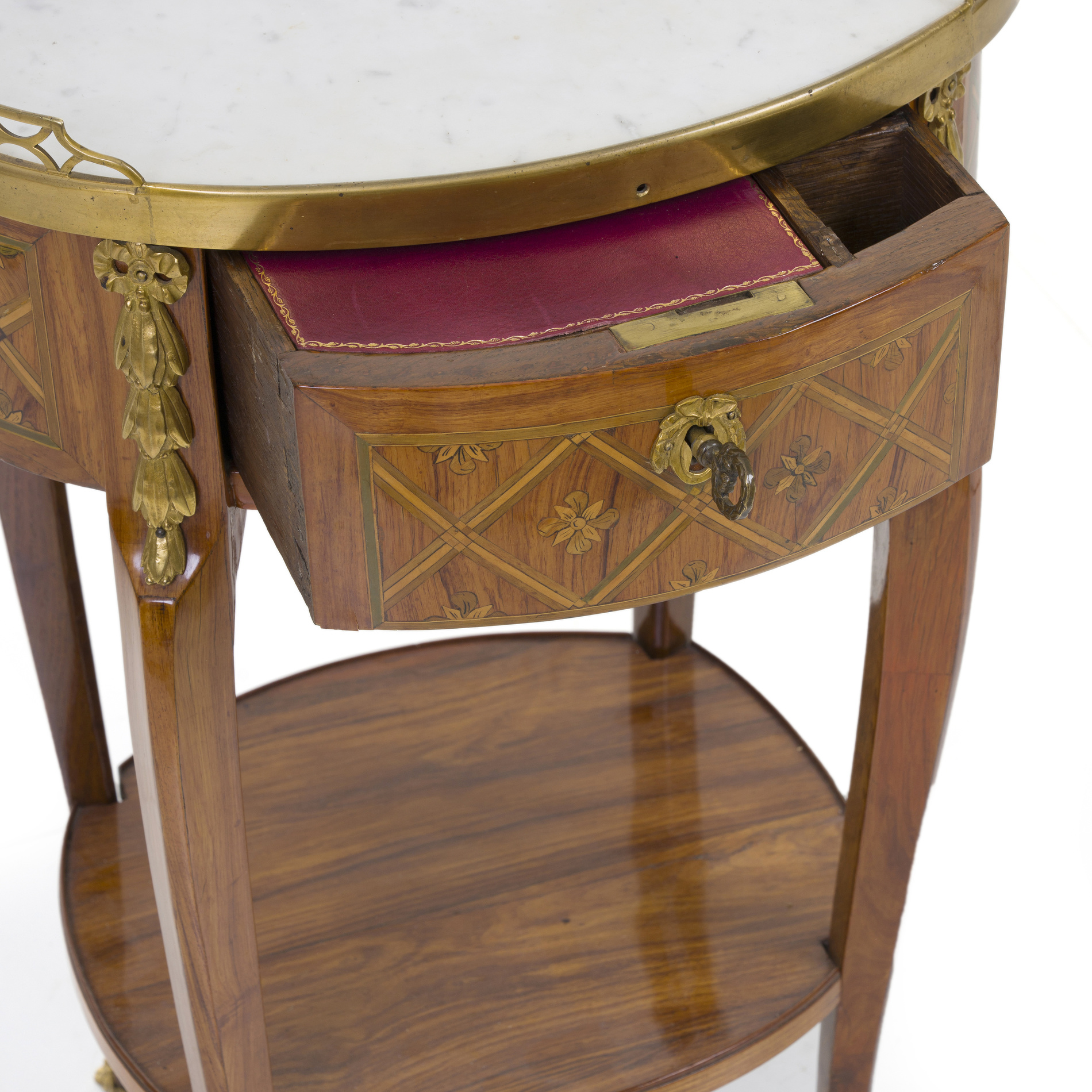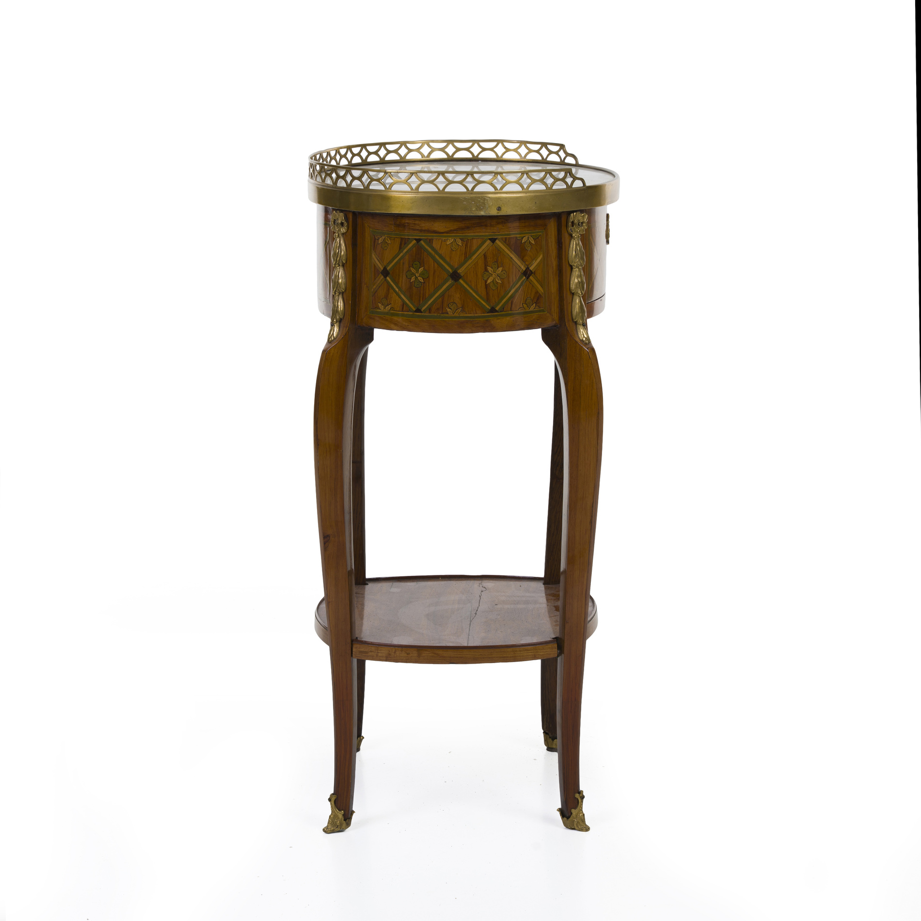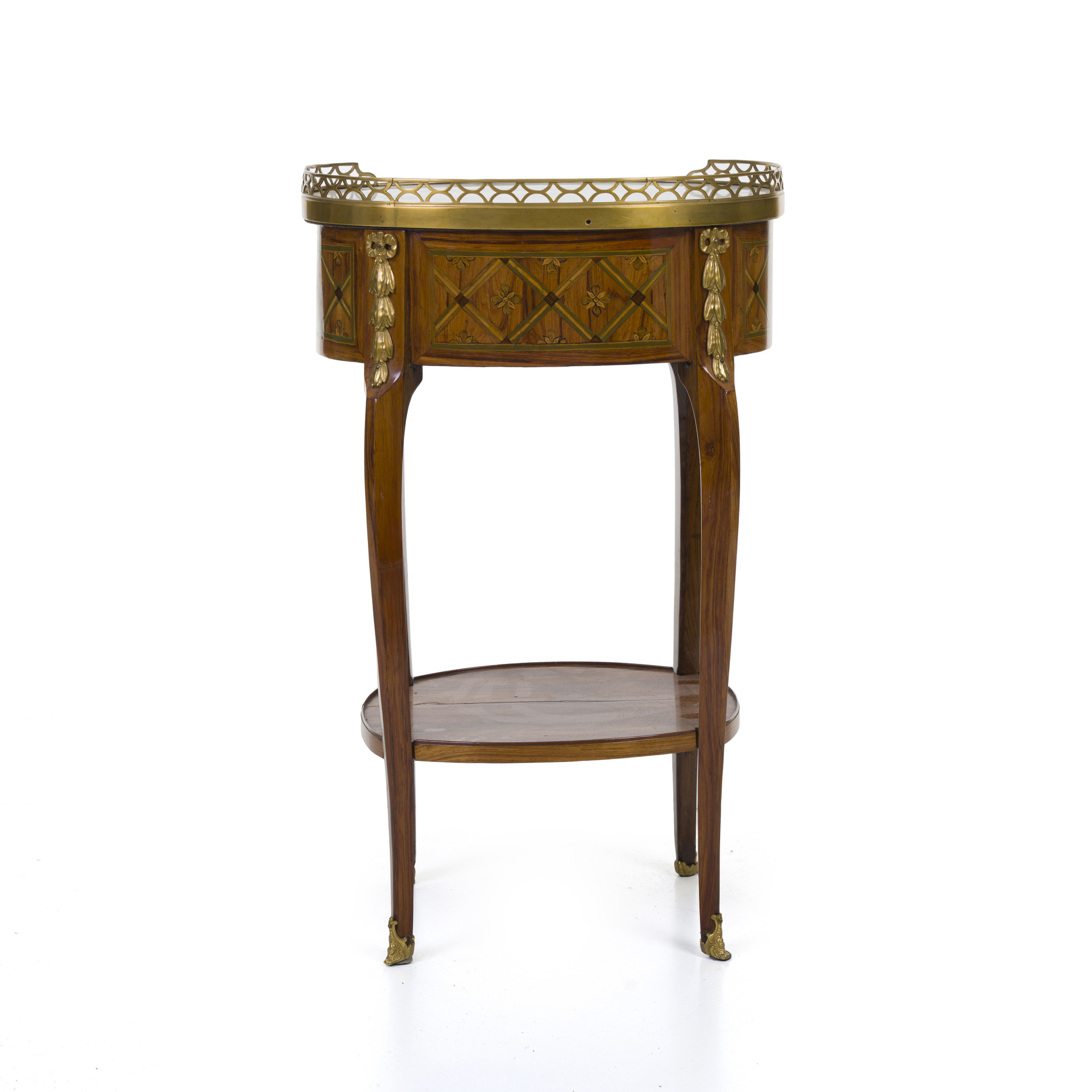 Tavolo da centro eseguito con legni preziosi, piano in marmo con ringhiera in bronzo dorato, con finiture in bronzo dorato