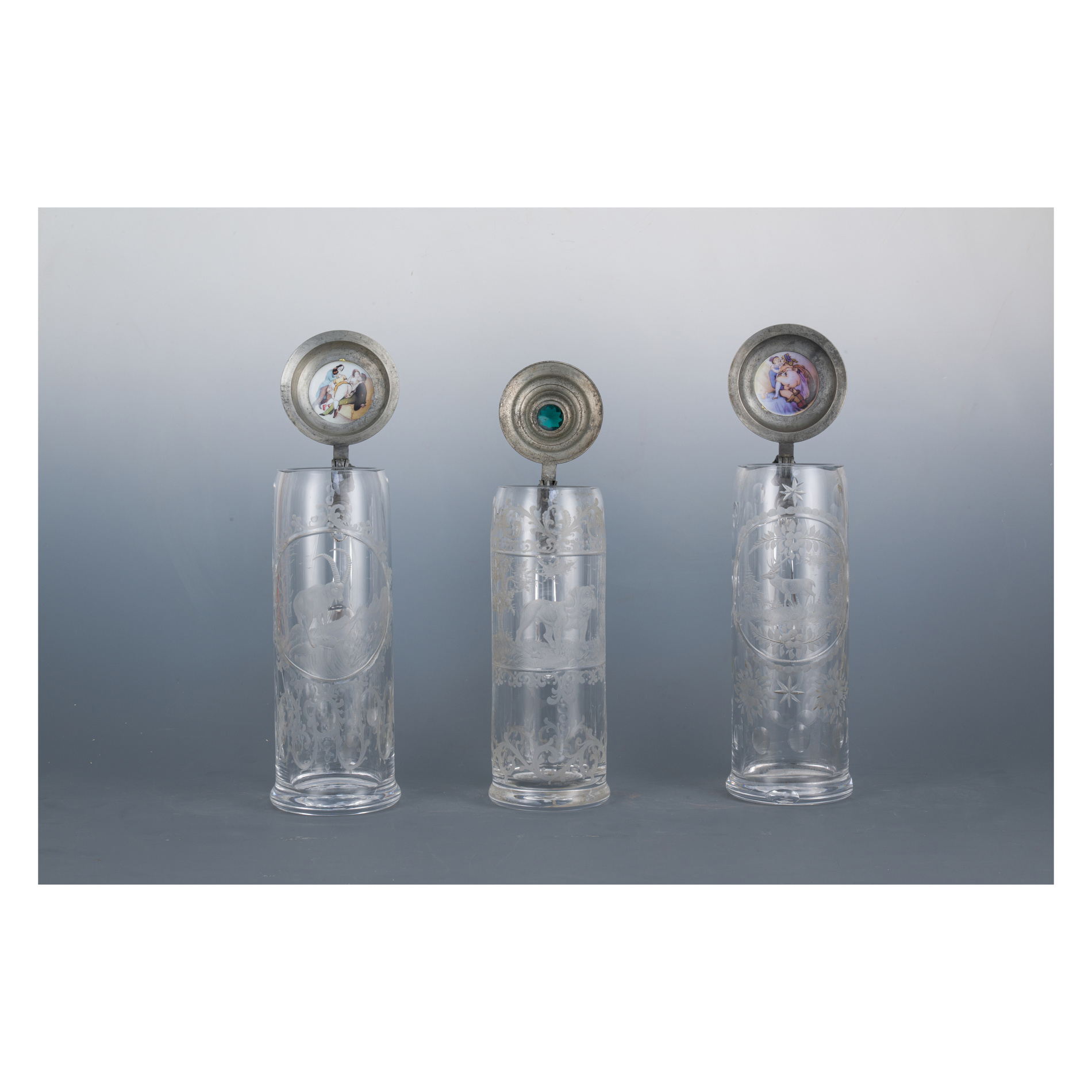 A cut crystal stein, acid-etched, depicting an ibex, pewter lid with painted porcelain insert showing an ibex and an erotic scene on the inside, h 33 cm