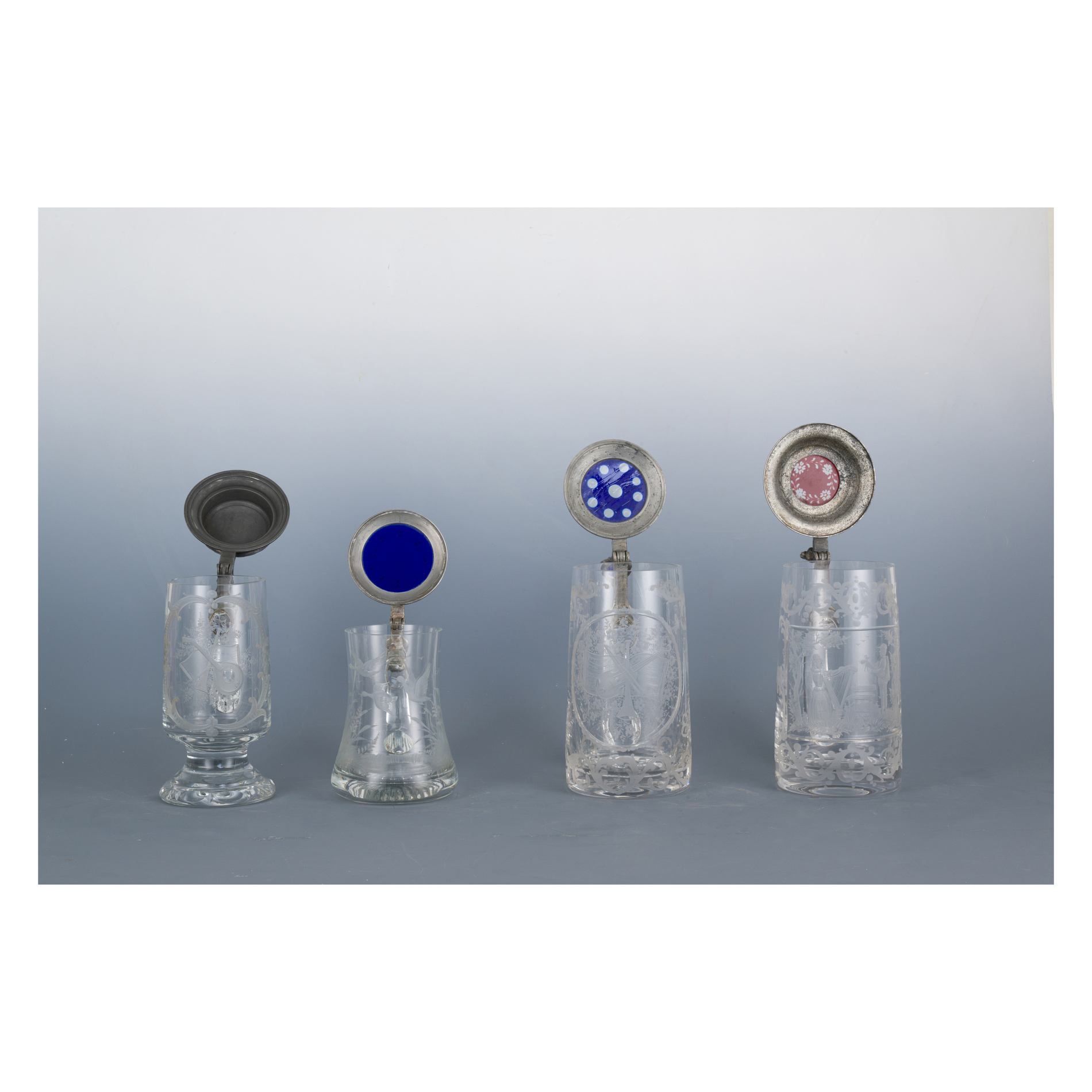 Boccale in cristallo molato e lavorato all'acido raffigurante delle oche in volo, coperchio in peltro con inserto in cristallo molato blu, h 18 cm
