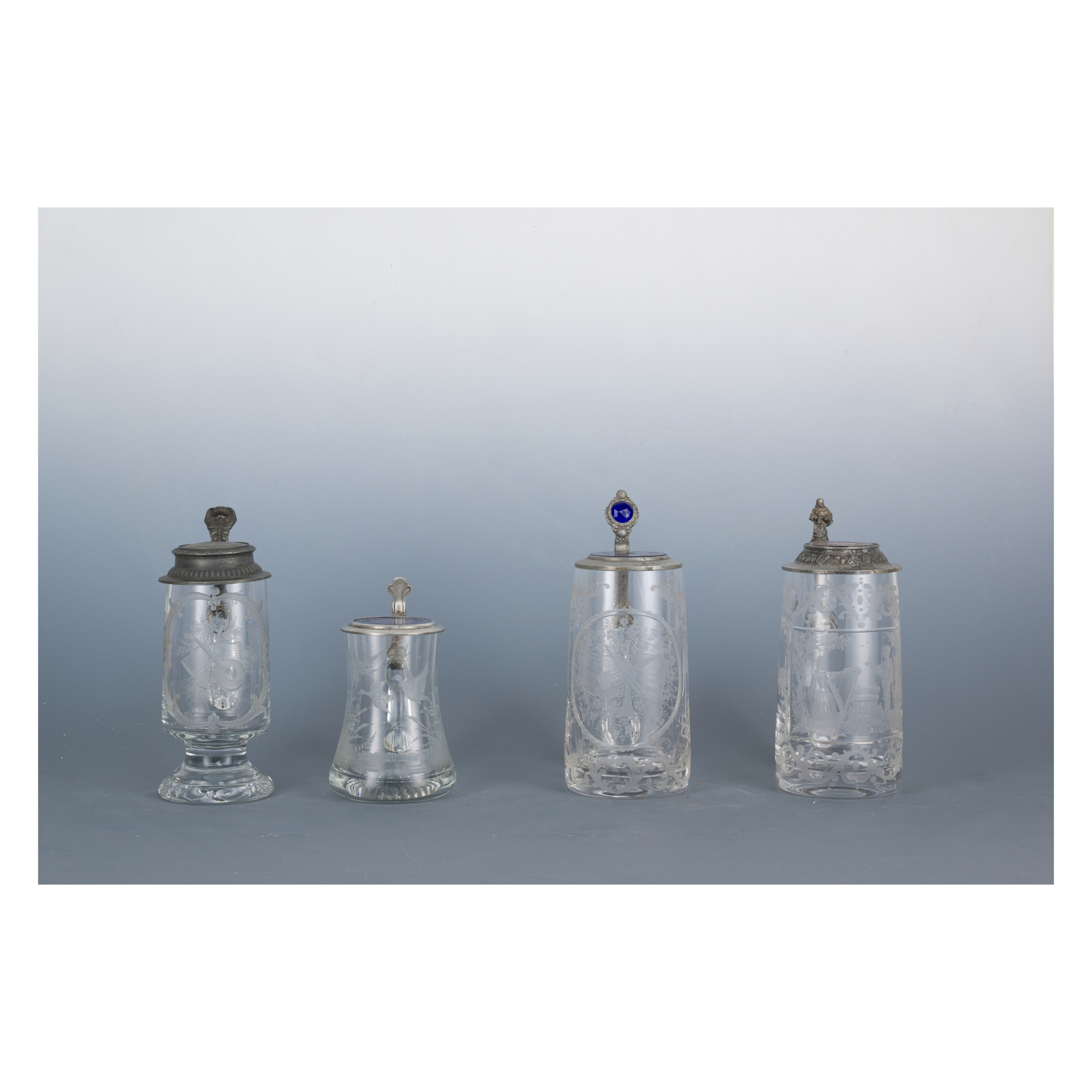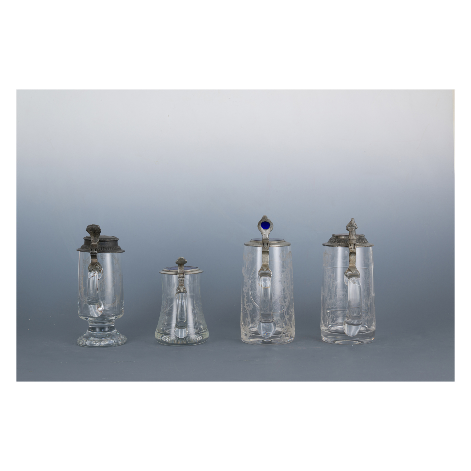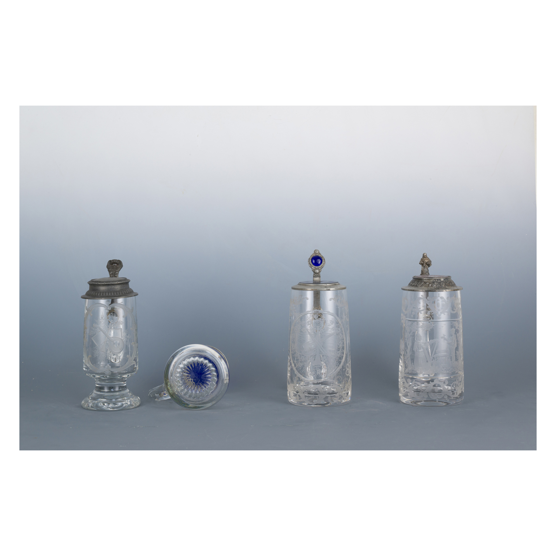A cut crystal stein, acid-etched, depicting flying geese, pewter lid with inset blue cut crystal, h 18 cm