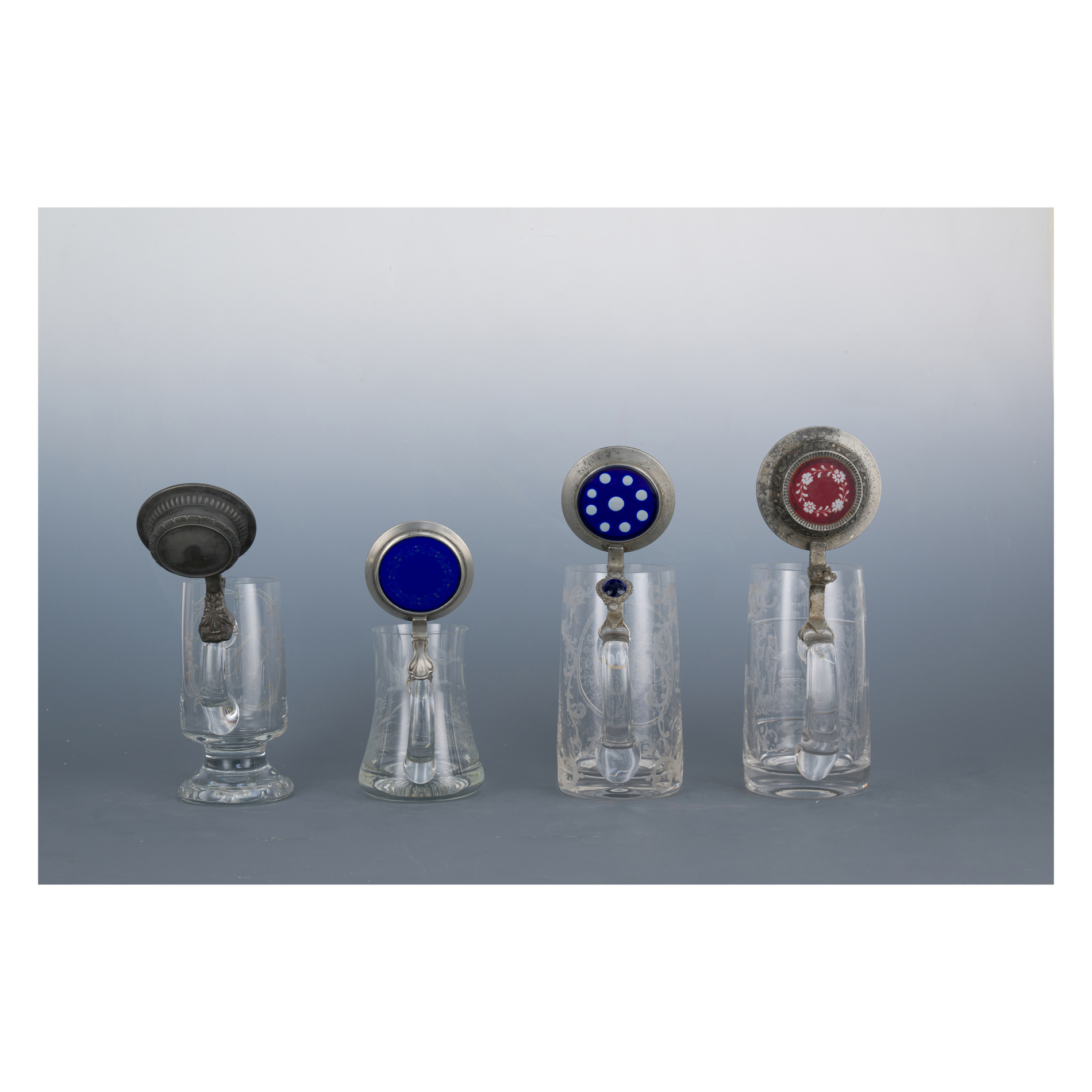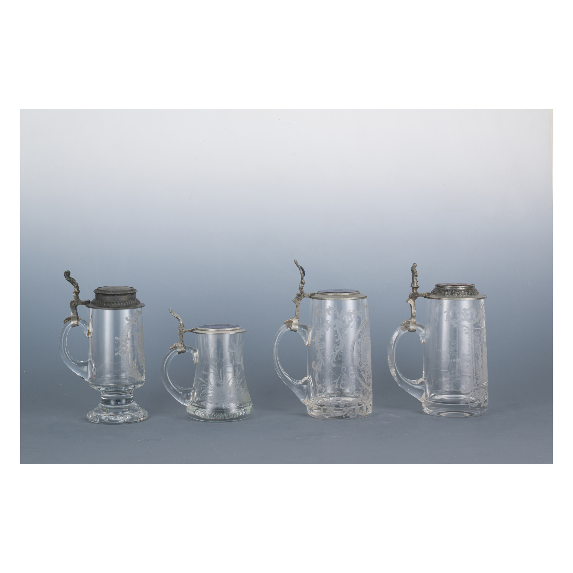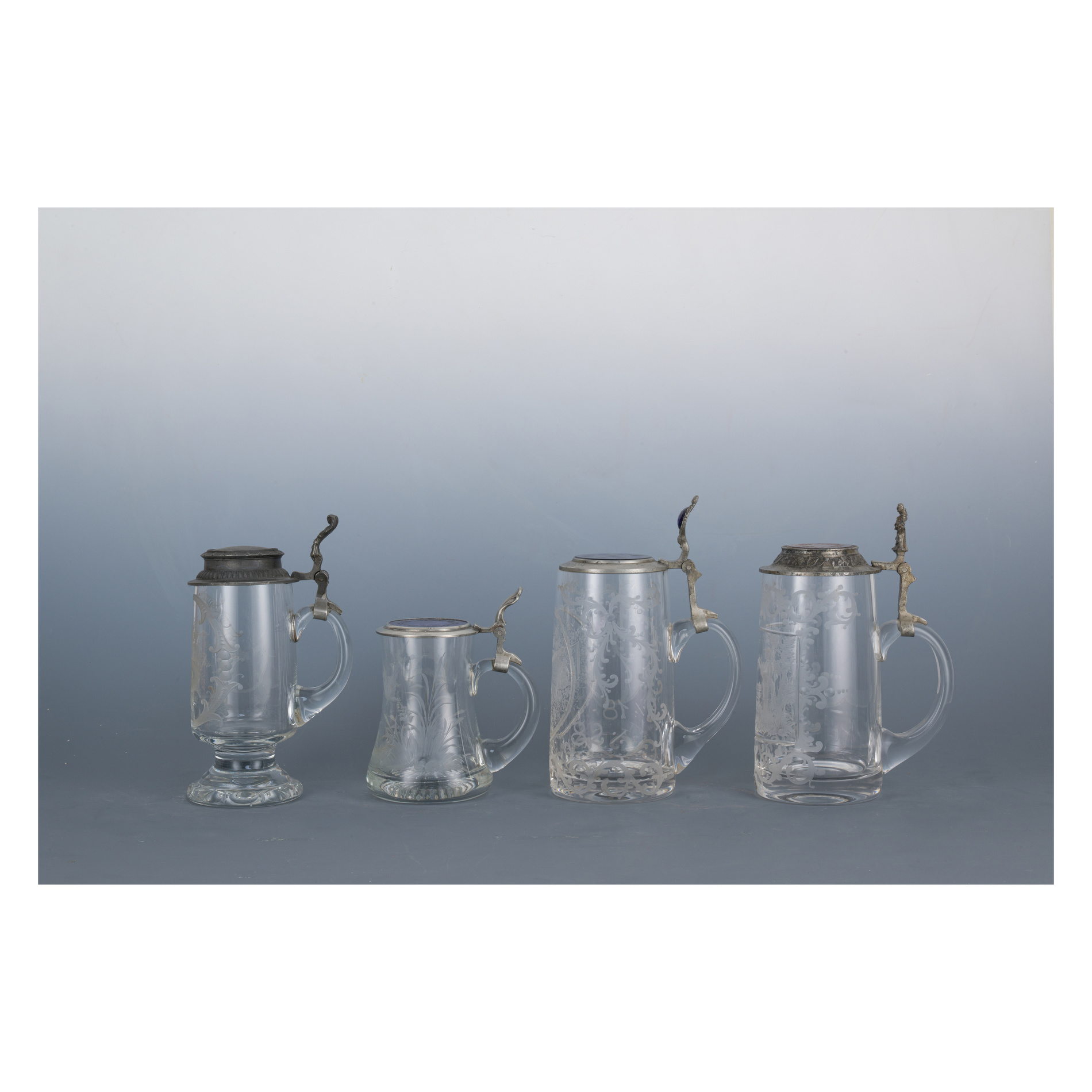 A cut crystal stein, acid-etched, depicting flying geese, pewter lid with inset blue cut crystal, h 18 cm