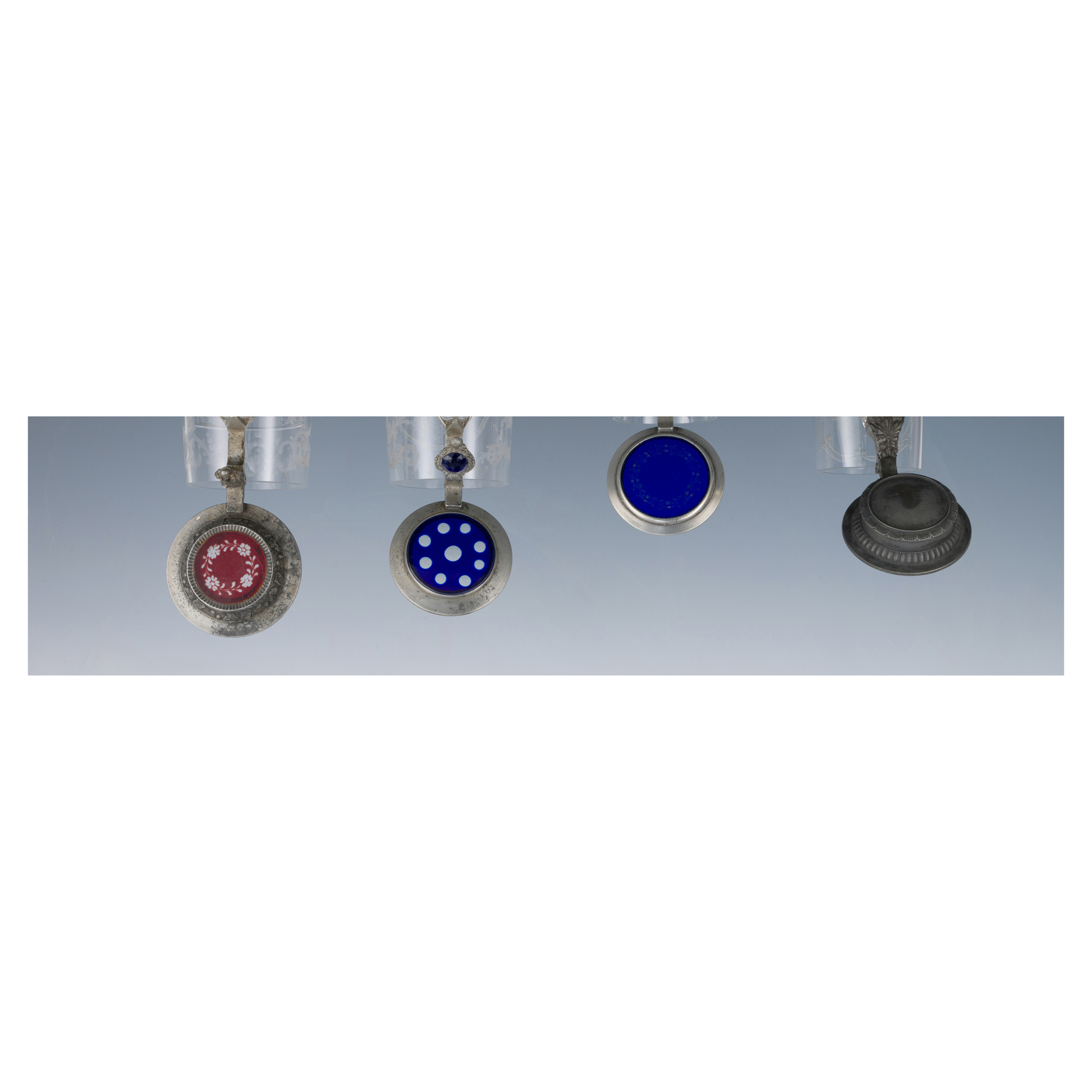 A cut crystal stein, acid-etched, depicting musical instruments with sheet music, pewter lid with inset blue cut crystal, h 25,5 cm