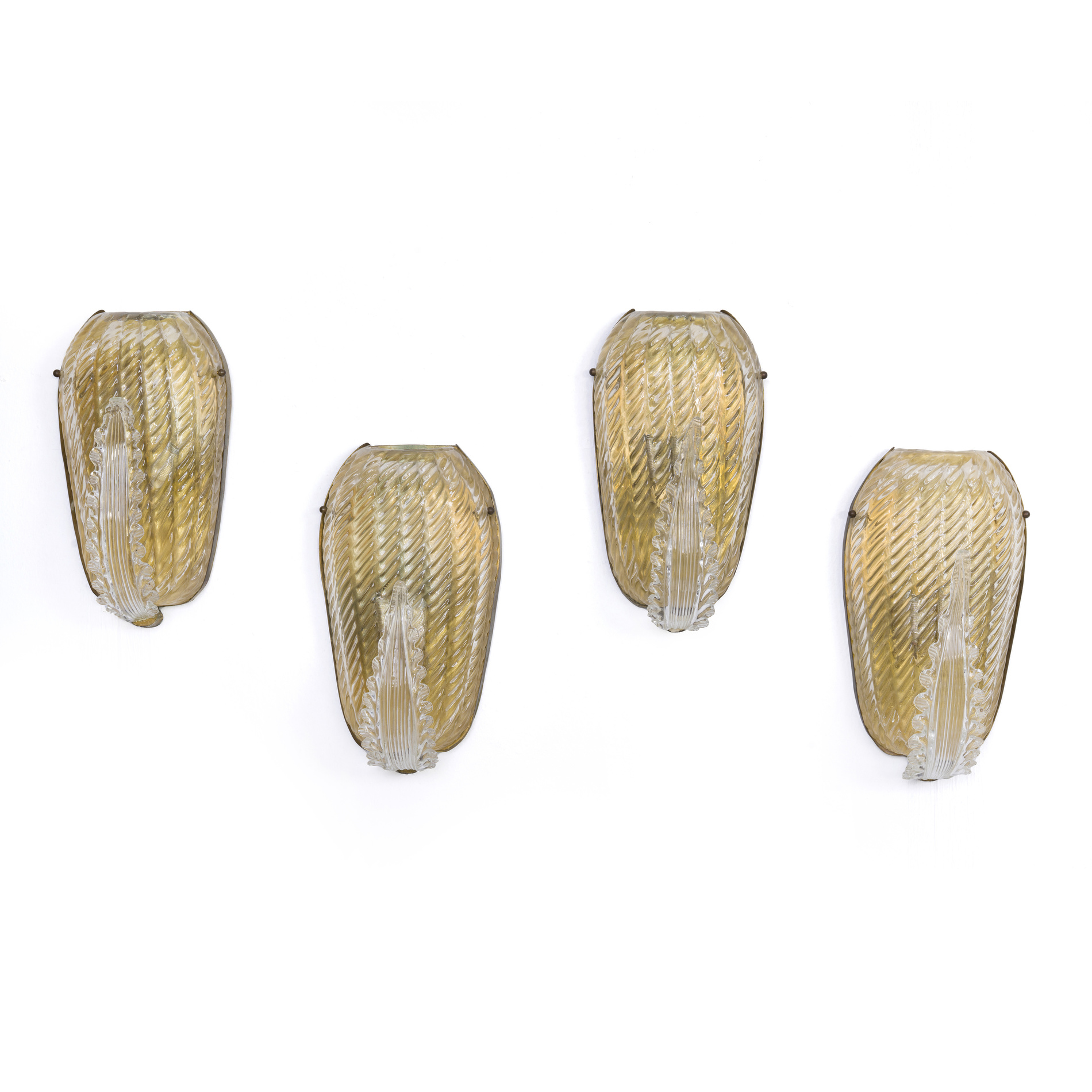 Ribbed glass with submerged gold leaf and transparent glass leaf decoration, brass structure and details