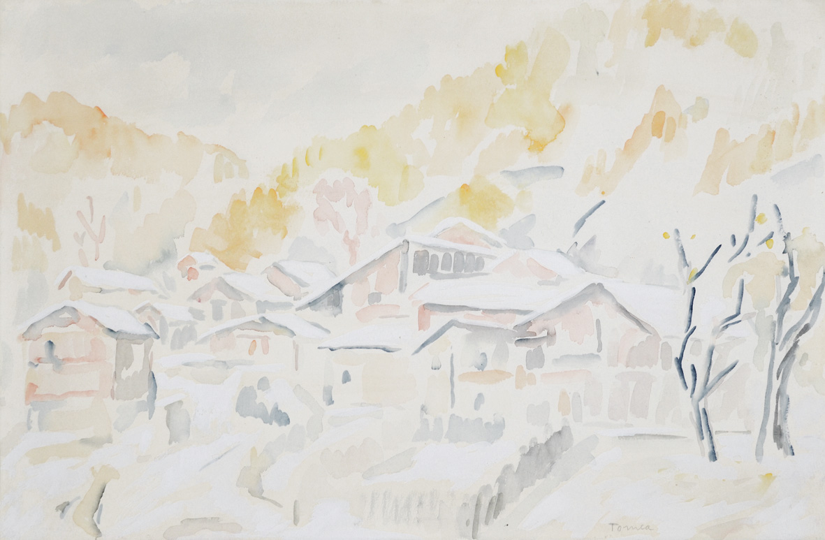 TOMEA FIORENZO Zoppè di Cadore 1910 - Milano 1960 Paesaggio a Zoppè 1954 acquerello su carta 35x43 firma in basso a destra esposizioni: Bottega d'Arte Milano - etichetta e timbri al retro