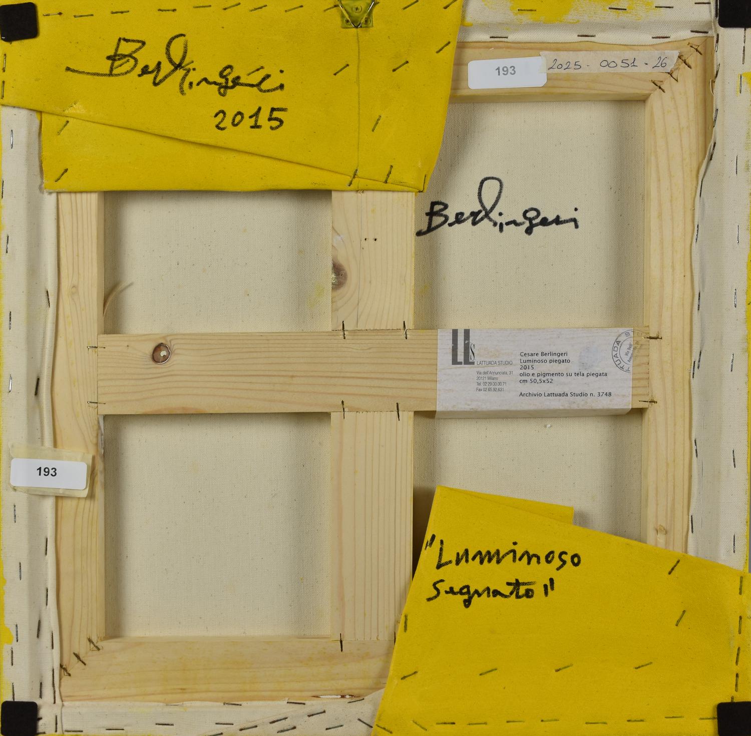 L'opera e' accompagnata da autentica dell'artista su fotografia con timbro ed etichetta Lattuada Studio, Milano (erroneamente titolato "Luminoso Piegato")