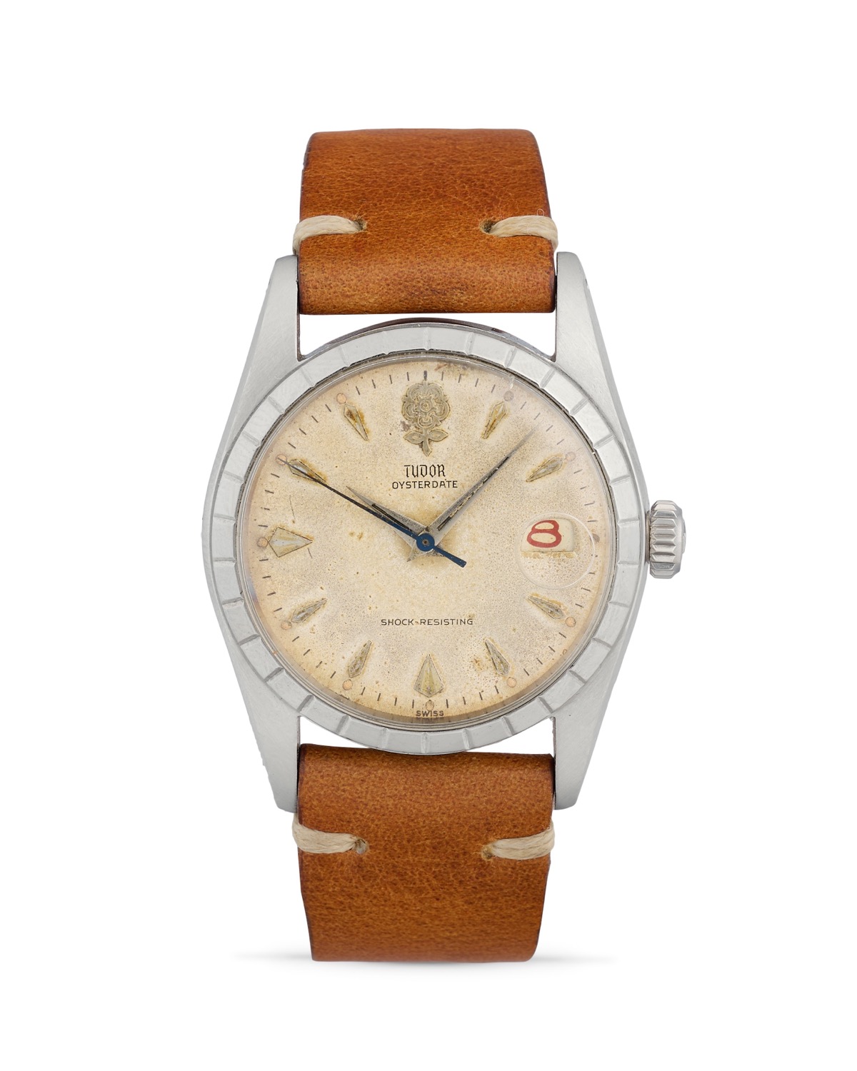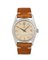 Cinturino in pelle e fibbia Rolex in acciaio.