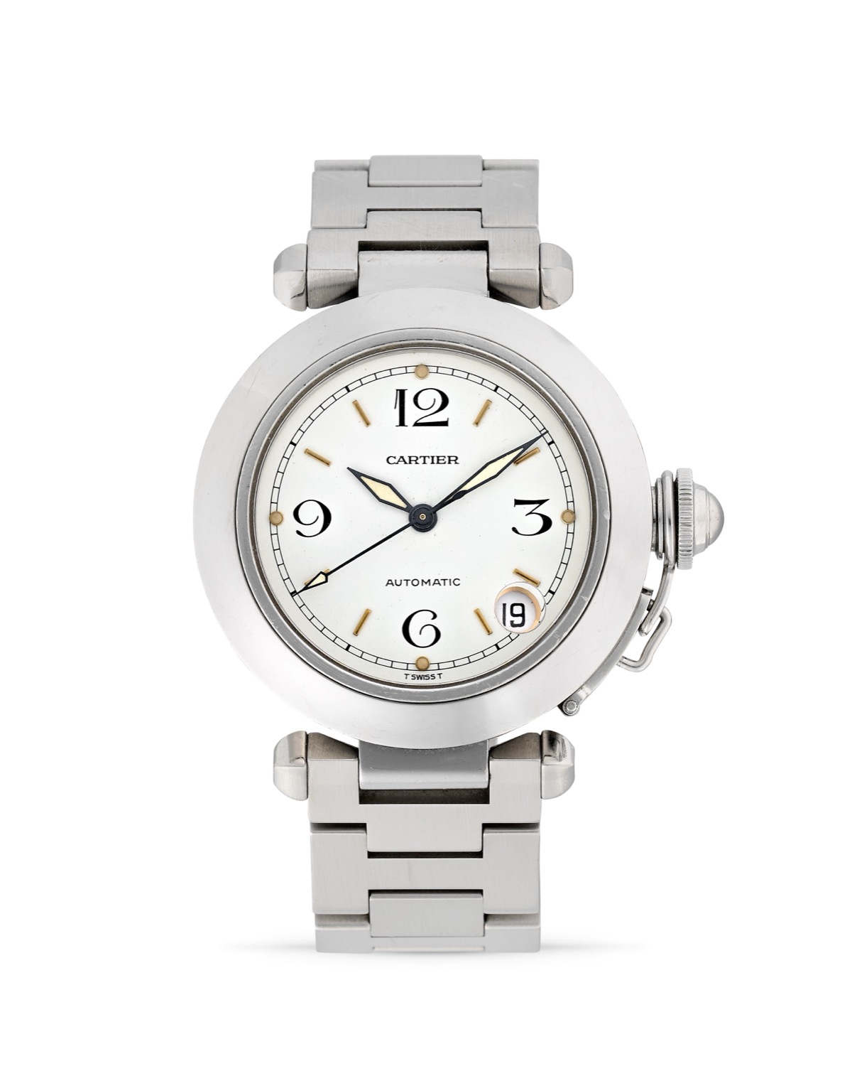 Quadrante bianco, numeri arabi dipinti e indici applicati.
