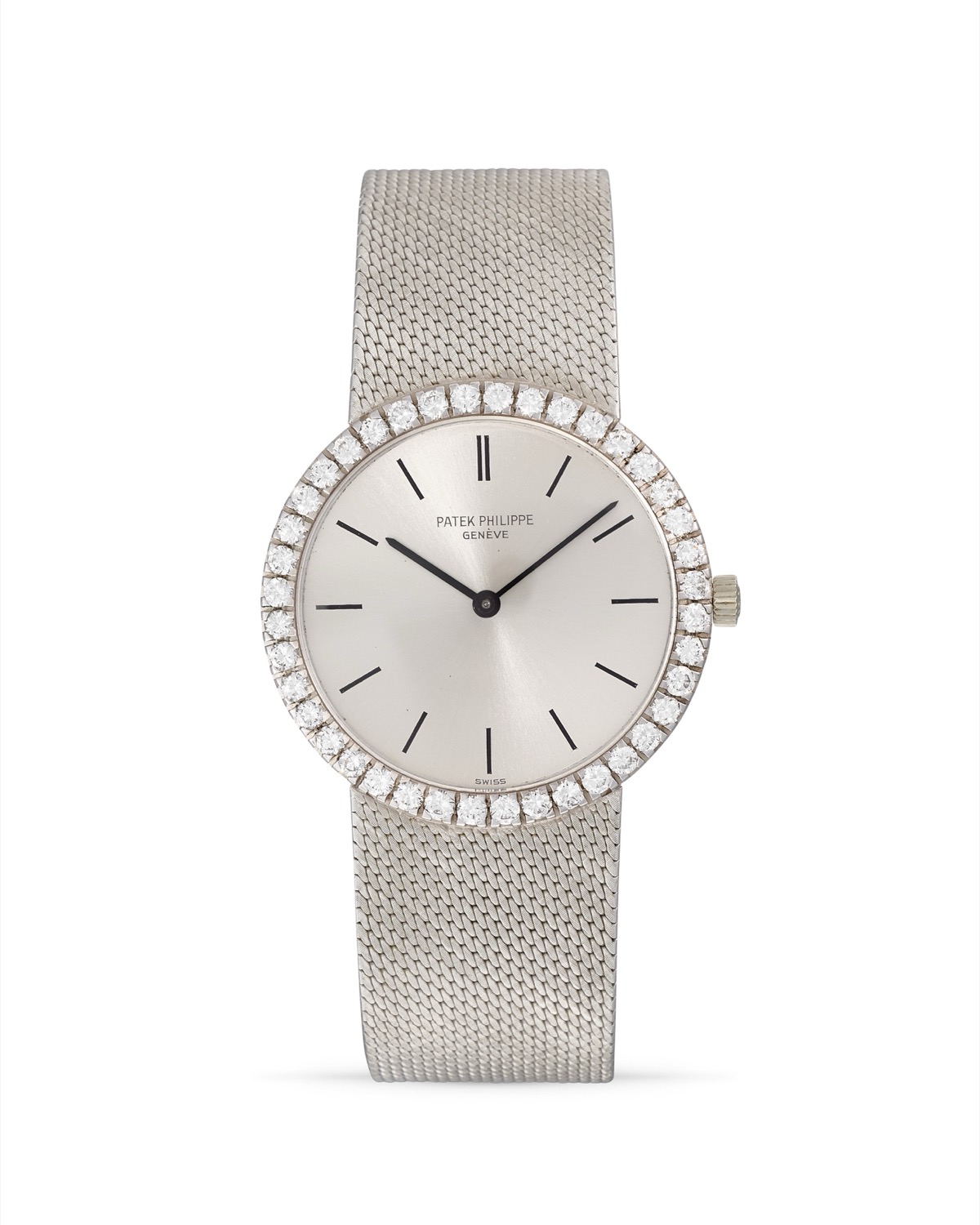 Bracciale integrato Patek Philippe con finitura a maglia in oro bianco 18k.