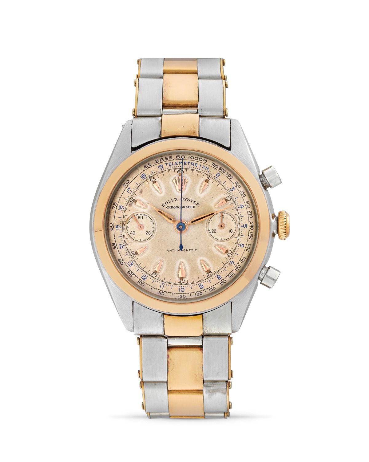 La referenza 4500 fu prodotta tra il 1946 e il 1947, segnando un punto di svolta per Rolex nello sviluppo dei suoi cronografi, con l’introduzione di un nuovo design di cassa con anse più dritte e appuntite. Il modello è riconosciuto come il capostipite dell'iconico Daytona, e fu realizzato in acciaio, oro giallo, oro rosa e acciaio & oro, come il presente orologio, di gran lunga la versione più rara.