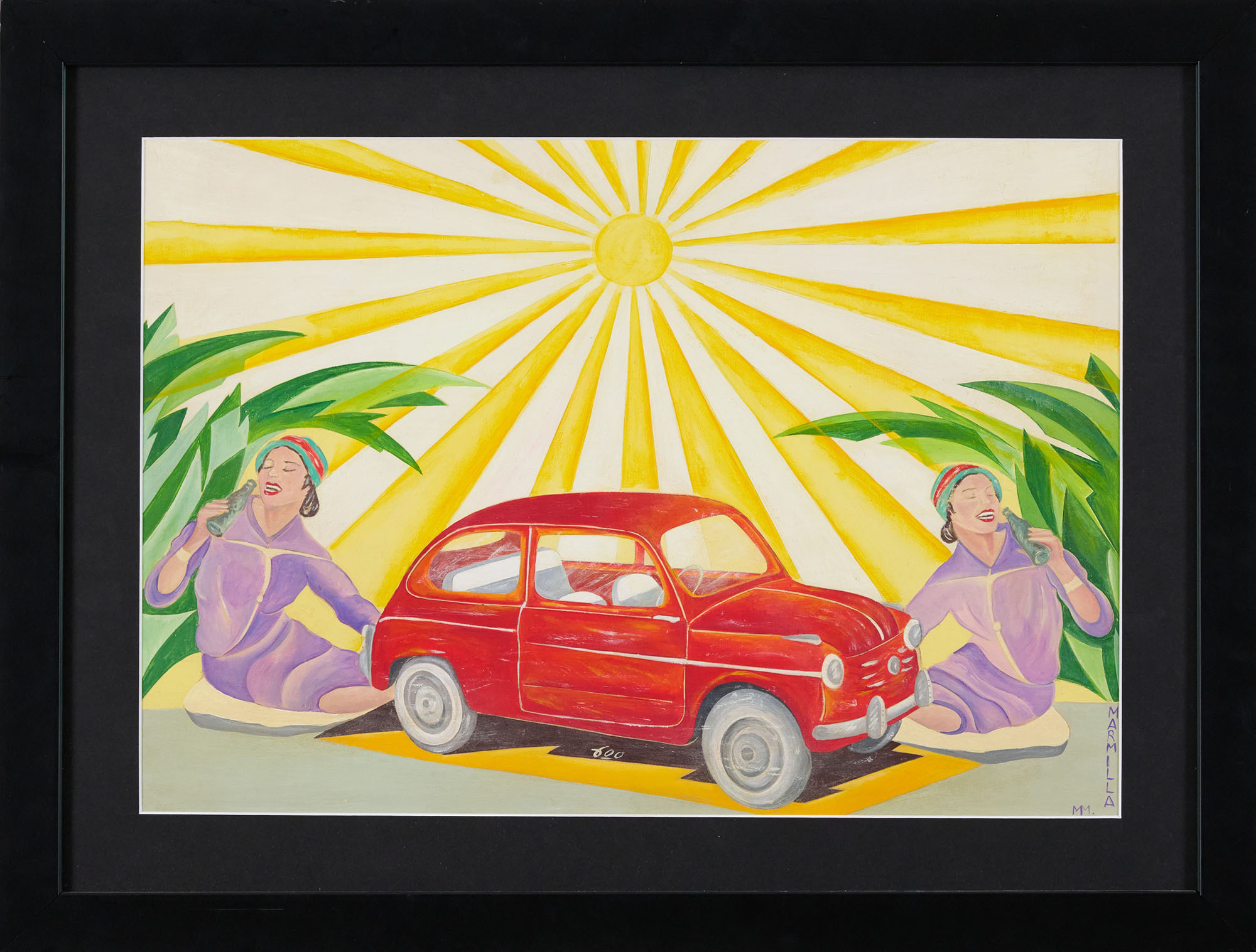 Lotto 66 | Mino Marmilla (1906 - 1978) L'estate con la mitica 600 Olio su carta intelata...