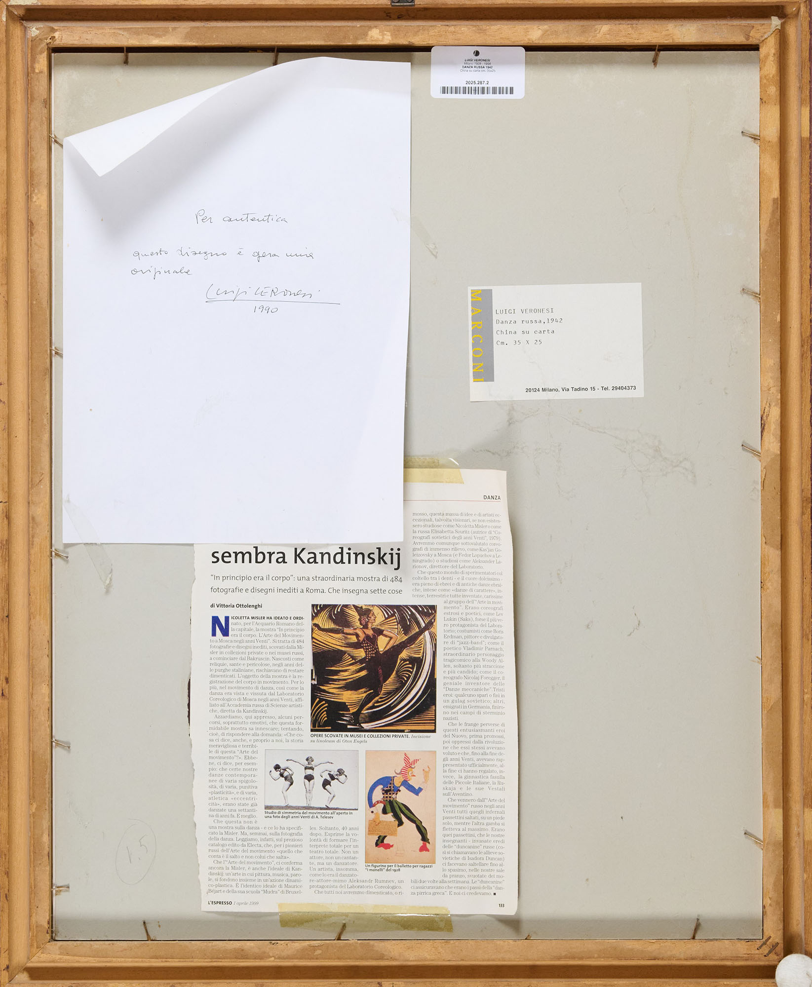 Sul verso: etichetta galleria Marconi, Milano, con descrizione.