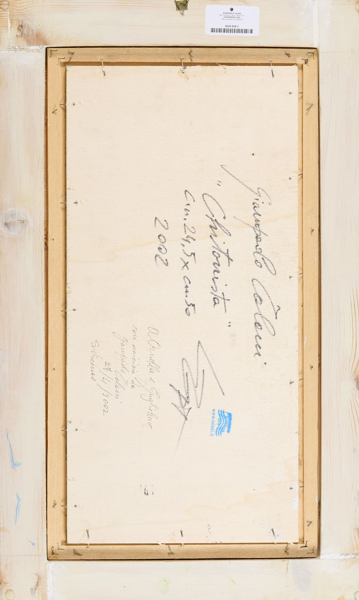 Sul verso: firma, data, titolo, timbro dell'Artista e dedica a persona.